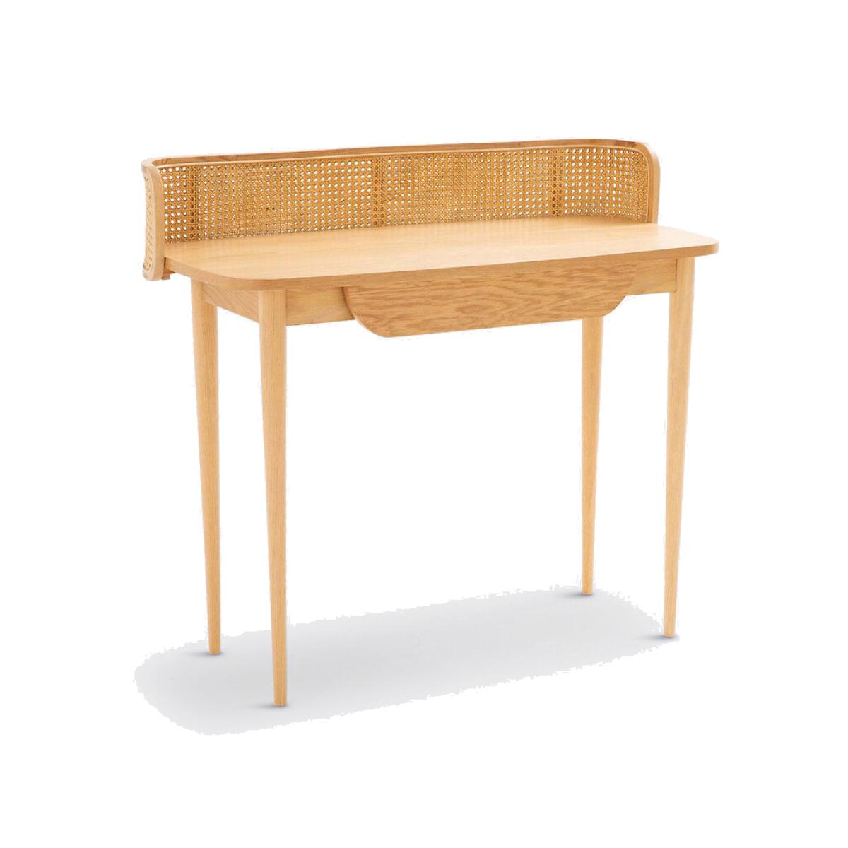 The Buisseau desk is part of our Signature Creations. An exclusive product, created by our designers. Combining caning and tapered legs in solid oak, Buisseau reinterprets the emblematic aesthetic of the 1960s. With round curves, it will give your workspace a chic and decorative note. A must-have in the collection, among the favourites of our customers.. Created by La Redoute Interiors. Product Details • 1 drawer under the top with metal slides. • MDF with oak veneer and nitrocellulose lacquered finish. • Legs in solid birch with oak veneer, nitrocellulose varnish finish. • Rattan cane surround. • Felt pads under feet. DimensionsTotal:. Width : 104cm. Height : 90cm. Length: 52cm. Top:L100 x H75 x D50cm. Drawer (interior space):L40.8 x H6 x D29cm. Home Delivery:Sold pre-assembled. Available for home delivery. Note! Please check that all access points are large enough to accommodate your delivery (doors, stairs, lifts). • WOOD FROM SUSTAINABLY MANAGED FORESTS. FSC® certified wood comes from forests that are environmentally, socially and economically well managed. Parcel dimensions and weight: • 1 parcel. • 113 x 57.5 x 31.5cm, 22kg.