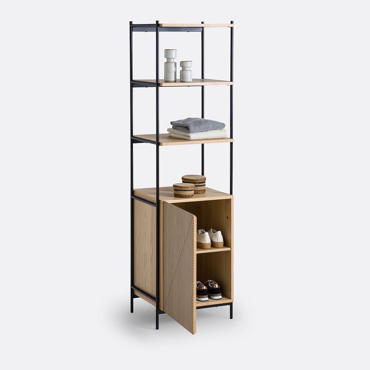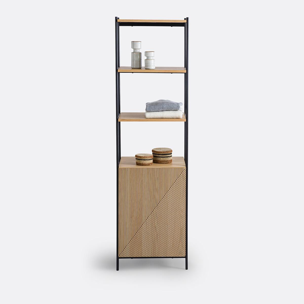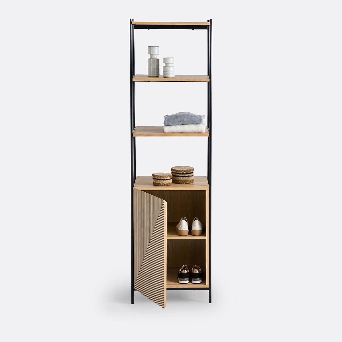 The Lodge Wardrove Module is part of the La Redoute Signatures Collection. A selection of exclusive creations, designed by our in-house design studio. Inspiring, easy to live with, trendy... these products have become our customers' favourites. and no doubt yours!. Designed internally by Aurore Delest : "To create the Lodge dressing module, I wanted to combine vintage with ethnic influences, notably with carved wood. The streaky wire drawing brings rhythm for a graphic spirit and a contemporary style. "The different dressing modules in the Lodge range allow you to easily put together your dressing room. Product Details • 3 open fixed shelves • 1 door with 1 shelf adjustable in height in 3 positions • Structure in black metal tubes with epoxy finish, matte effect • Unit and shelves in oak veneered MDF with nitrocellulose varnish finish • FSC certified woodDimensions. Overall • Width: 54.2cm • Height: 190.7cm • Depth: 52cm. Usable space • Height between shelves: 34cm • Height of legs: 12cm • Weight: 40.2kg Delivery:Assembly required. Available for home delivery. Note! Please check that all access points are large enough to accommodate your delivery (doors, stairs, lifts). • WOOD FROM SUSTAINABLY MANAGED FORESTS. FSC® certified wood comes from forests that are environmentally, socially and economically well managed. Dimensions and weight of parcel2 parcels • L198 x H19.5 x D50.5cm. 11.94kg • L78.5 x H24.5 x D60cm. 35.86kg