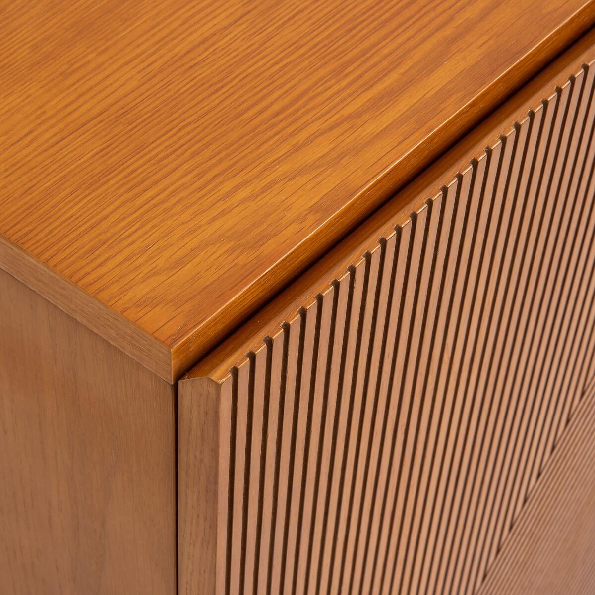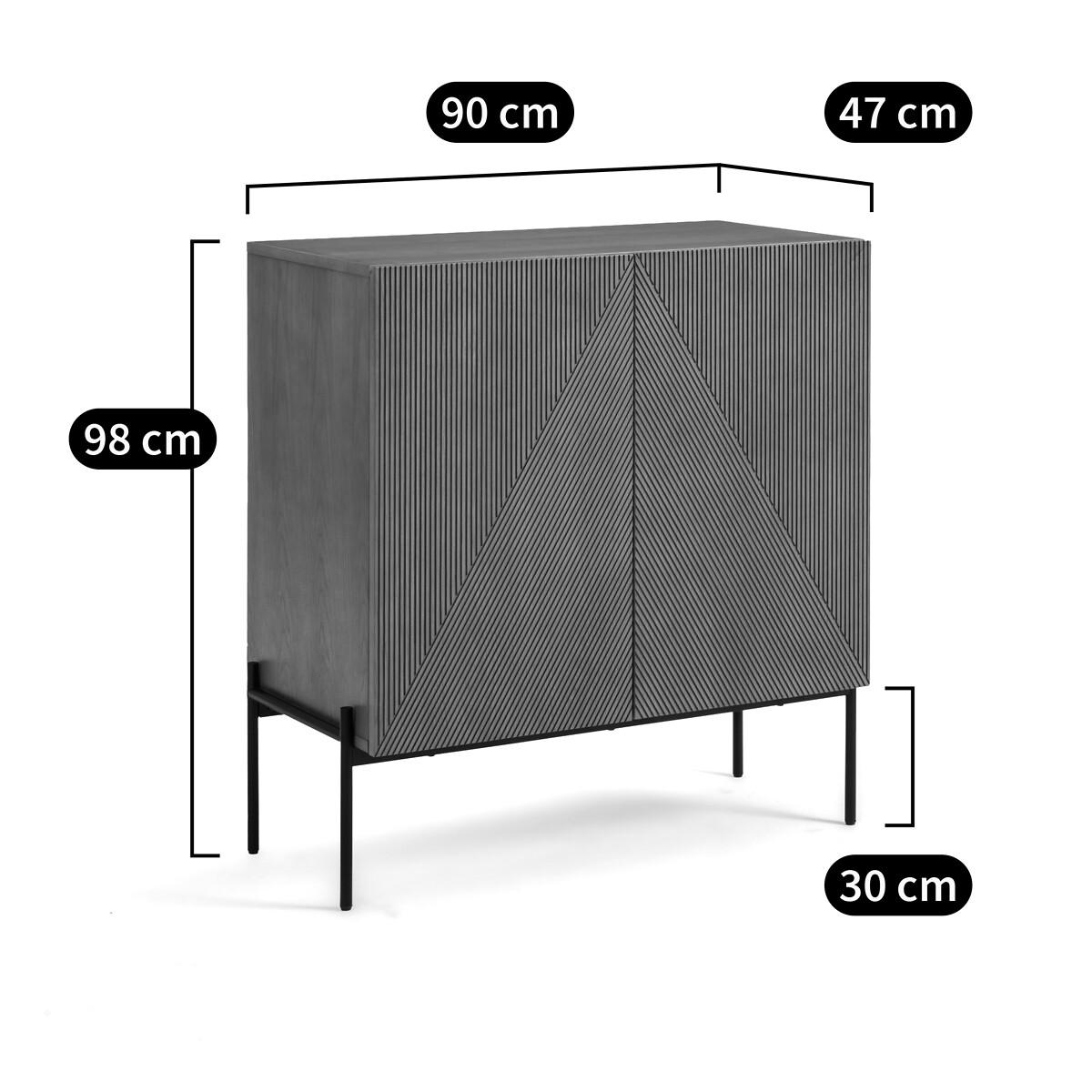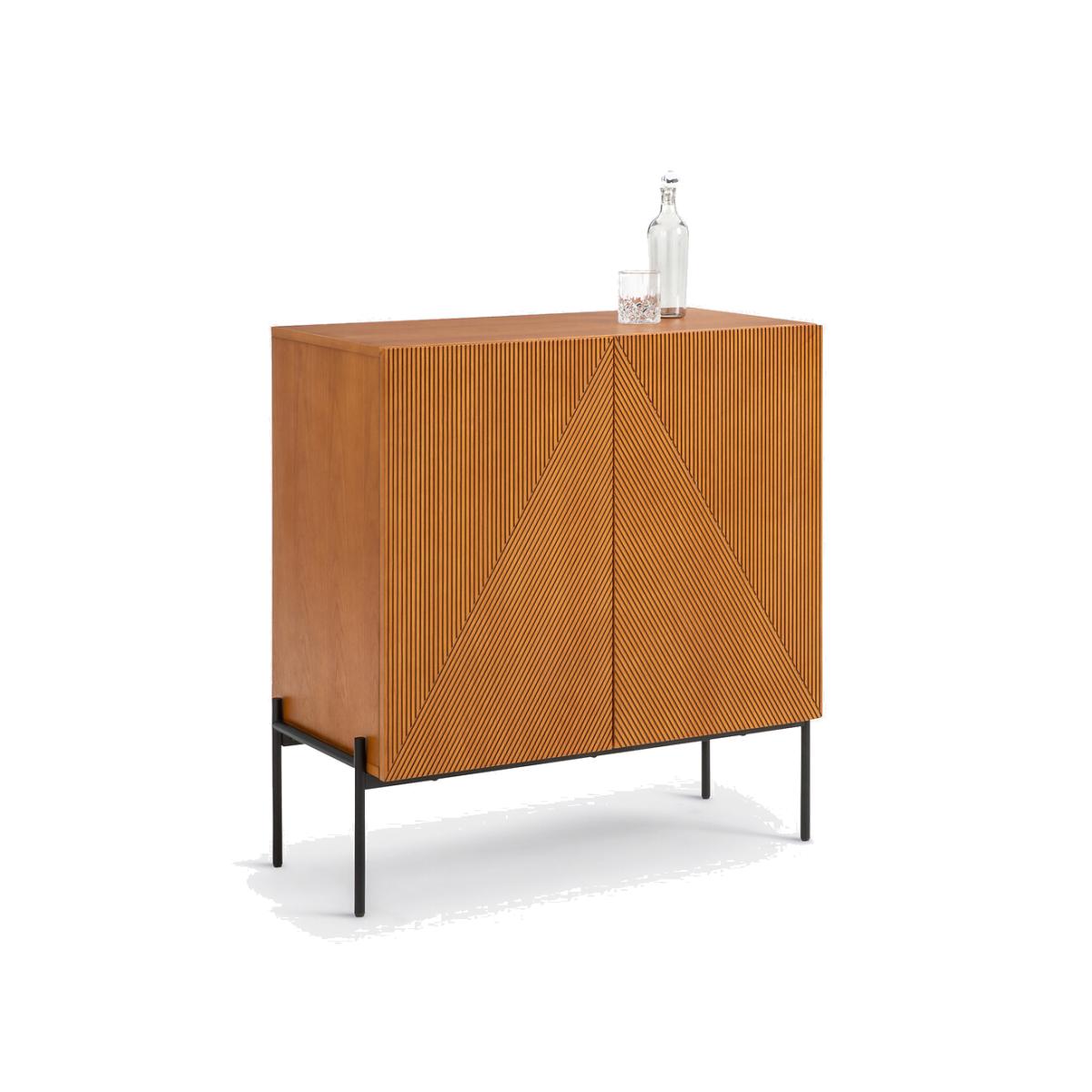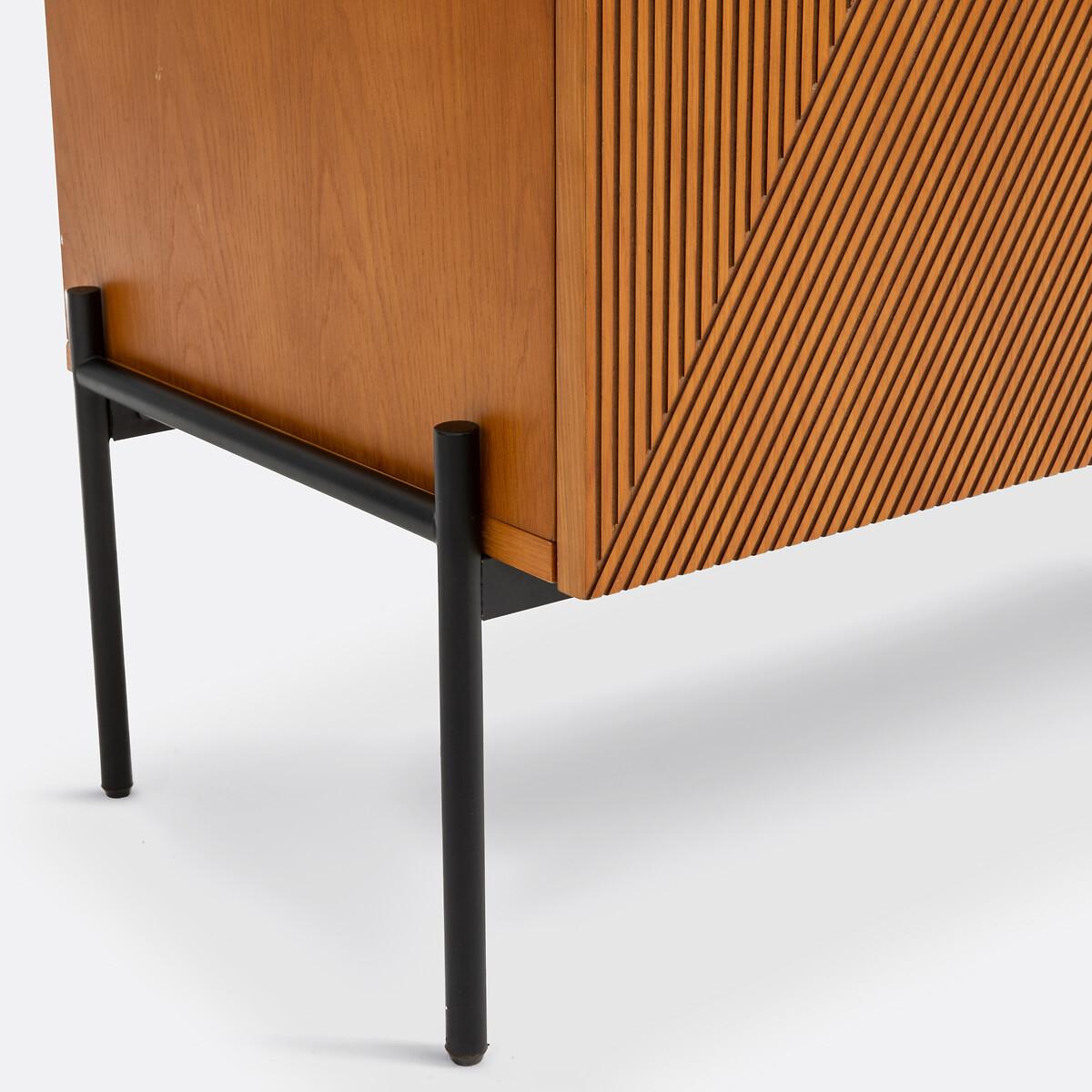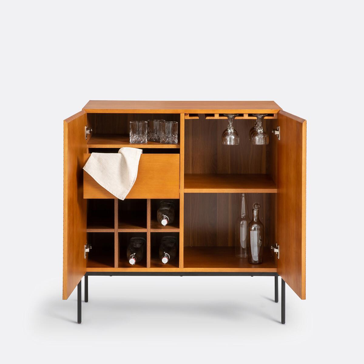 The Lodge Bar unit is part of the La Redoute Signature Collection. A selection of exclusive creations, designed by our in-house design studio. Inspiring, easy to live with, trendy... these products have become our customers' favourites. and no doubt yours!Designed internally by Aurore Delest :"To create the Lodge bar cabinet, I wanted to combine vintage with ethnic influences, notably with carved wood. The streaky wire drawing brings rhythm for a graphic spirit and a contemporary style. "Product Details • Pre-assembled MDF cabinet, stained oak veneer with nitrocellulose varnish finish • Oak veneered doors (6mm thick) • FSC® certified wood • 2 doors, 1 central partition • Right side: 2 compartments + wooden rail for storing stemmed glasses • Left side: 1 compartments + 1 Soft-closing drawer unit + 6 removable niches for bottles • Softclosing door hinges for a smooth closing • Bevel cut on the top of the doors for easy opening • Pieds ajustables en métal, finition époxyDimensions. Overall • Length: 90cm • Height: 98cm • Depth: 47cm • Height of legs: 30cm. Usable dimensions • Right compartment: L42 x H30/33 x D43cm • Left compartment: L42 x H14 x D43cm • Removable niches for bottles: L13 x H16 x D43cm • Drawer unit: L37 x H9 x D33cmDelivery:. Requires some assembly (based to be attached). Available for home delivery. • WOOD FROM SUSTAINABLY MANAGED FORESTS. FSC® certified wood comes from forests that are environmentally, socially and economically well managed. Dimensions and weight of parcel • 1 parcel • L98 x H89 x D56cm. 65kg.