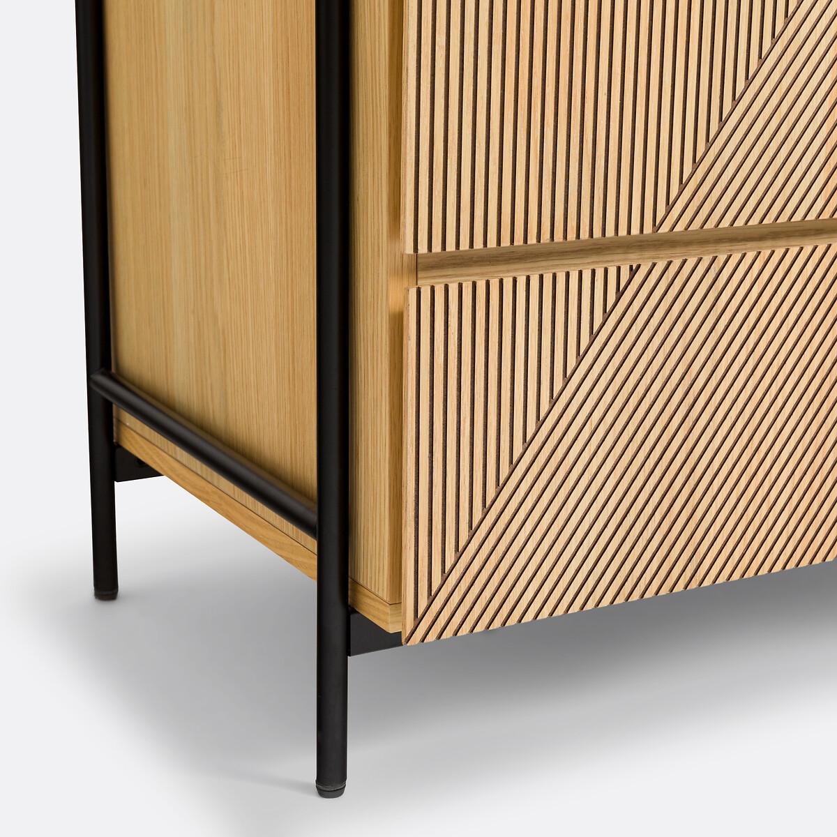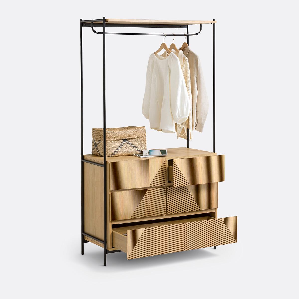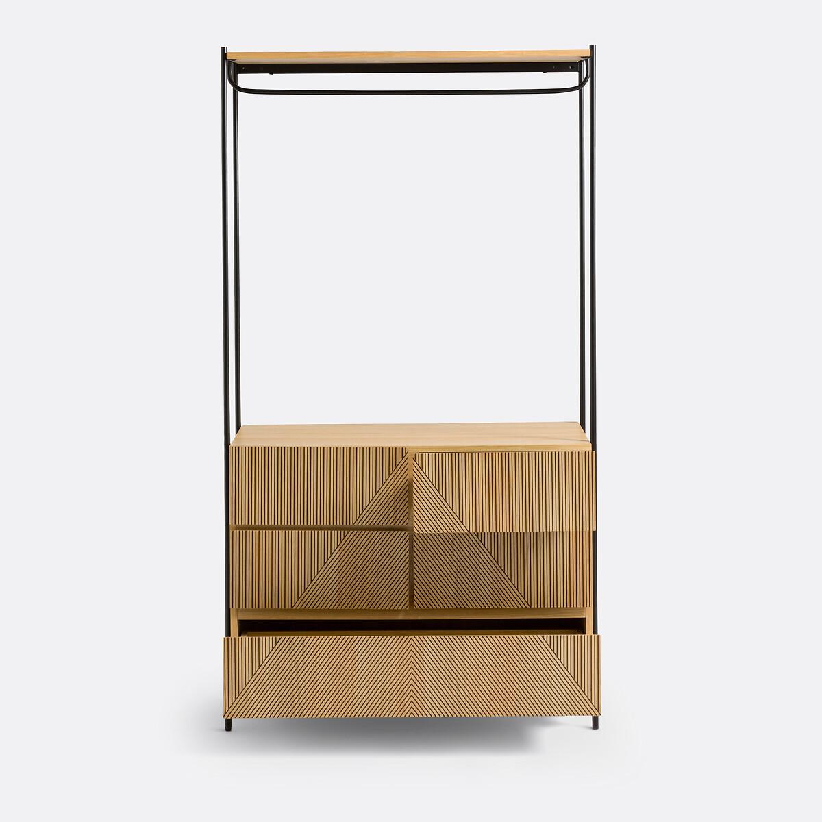 The Lodge Wardrove Module is part of the La Redoute Signatures Collection. A selection of exclusive creations, designed by our in-house design studio. Inspiring, easy to live with, trendy... these products have become our customers' favourites. and no doubt yours!. Designed internally by Aurore Delest : "To create the Lodge dressing module, I wanted to combine vintage with ethnic influences, notably with carved wood. The streaky wire drawing brings rhythm for a graphic spirit and a contemporary style. "The different dressing modules in the Lodge range allow you to easily put together your dressing room. Product Details • 1 hanging rail • 4 small and 1 large drawers • Structure in black metal tubes with epoxy finish, matte effect • Unit and drawers in oak veneered MDF with nitrocellulose varnish finish • FSC® certified woodDimensions. Total: • Width: 104.2cm • Height: 190.7cm • Depth: 50cm. Usable dimensions: • Height of hanging section: 112.7cm • Interior dimensions of 4 upper drawers: L41.5 x H10 x D33cm • Interior dimensions of lower drawer: L92 x H10 x D33cm • Height of legs: 12.7cm • Weight: 67.2kgDelivery:. Assembly required. Available for home delivery. Note! Please check that all access points are large enough to accommodate your delivery (doors, stairs, lifts). • WOOD FROM SUSTAINABLY MANAGED FORESTS. FSC® certified wood comes from forests that are environmentally, socially and economically well managed. Dimensions and weight of parcel2 parcels • L199.5 x H19.5 x D52cm. 16.7kg • L109 x H22 x D73.5cm. 59.1kg