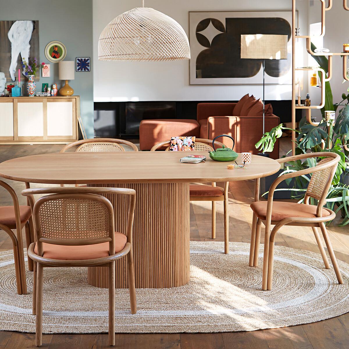 Light wood, soft lines, worked finishes: this is Tamula. Its base, veneered with oak slats, gives it a real character, while its rounded top softens the whole and invites community dining. Designed by La Redoute Interiors. Product Details • Seats 6-8 people • Large oblong top in oak veneered MDF, polyurethane varnish finish • Rounded bevelled top edge in solid oak • Thickness of top: 3cm • Oblong base in MDF veneered with solid oak slats, nitrocellulose varnish finish • Felt pads. Care instructions • To protect your table, consider trivets, coasters and placemats. Dimensions • Width: 180cm • Height: 75cm • Depth: 120cm • Central base:L65.6 x H72 x D45.6cm • Leg space between the central base and the edge of the top: L37 and L57cmDelivery:. This product is sold ready to assemble. Dimensions and weight of parcel2 parcels • L187 x H11 x D129cm. 45kg • L74 x H80 x D54.5cm. 55kg