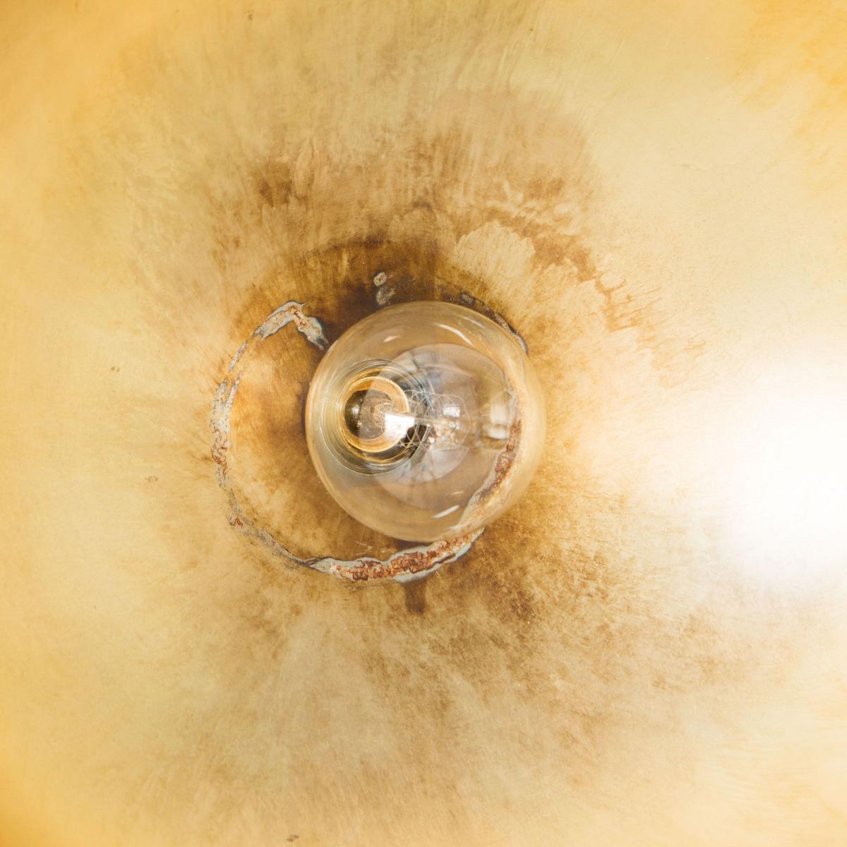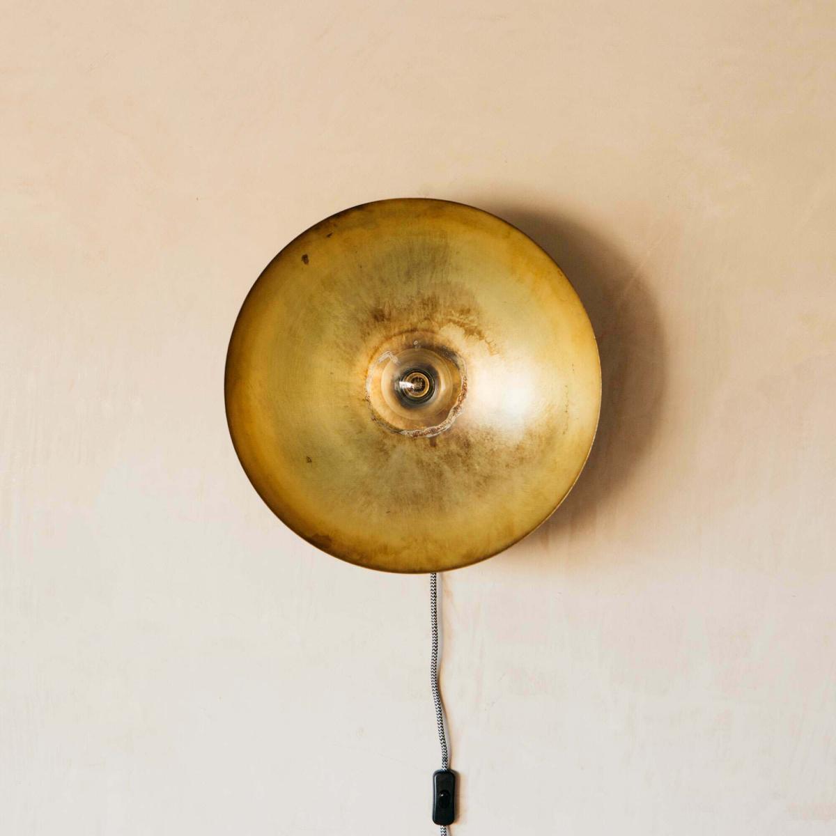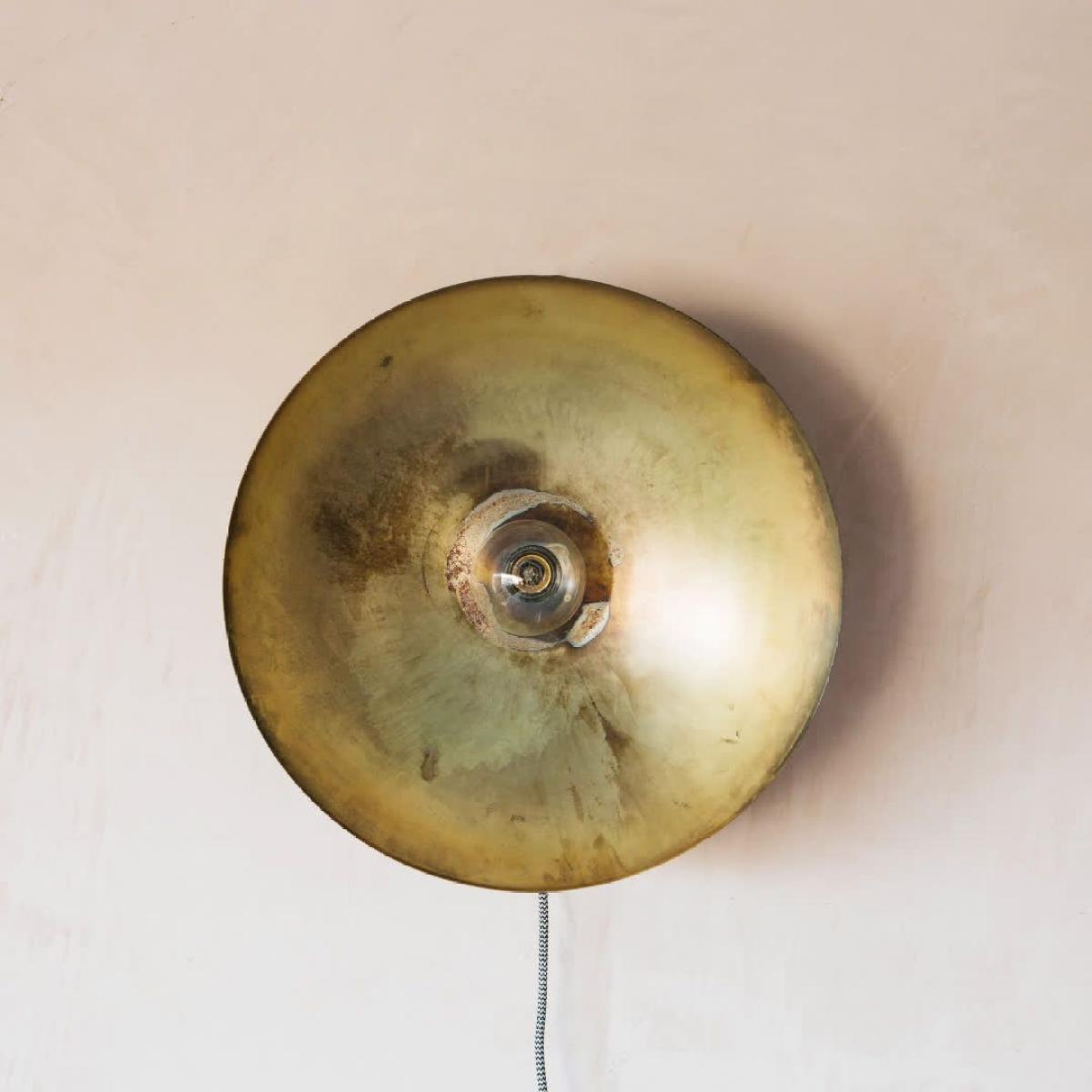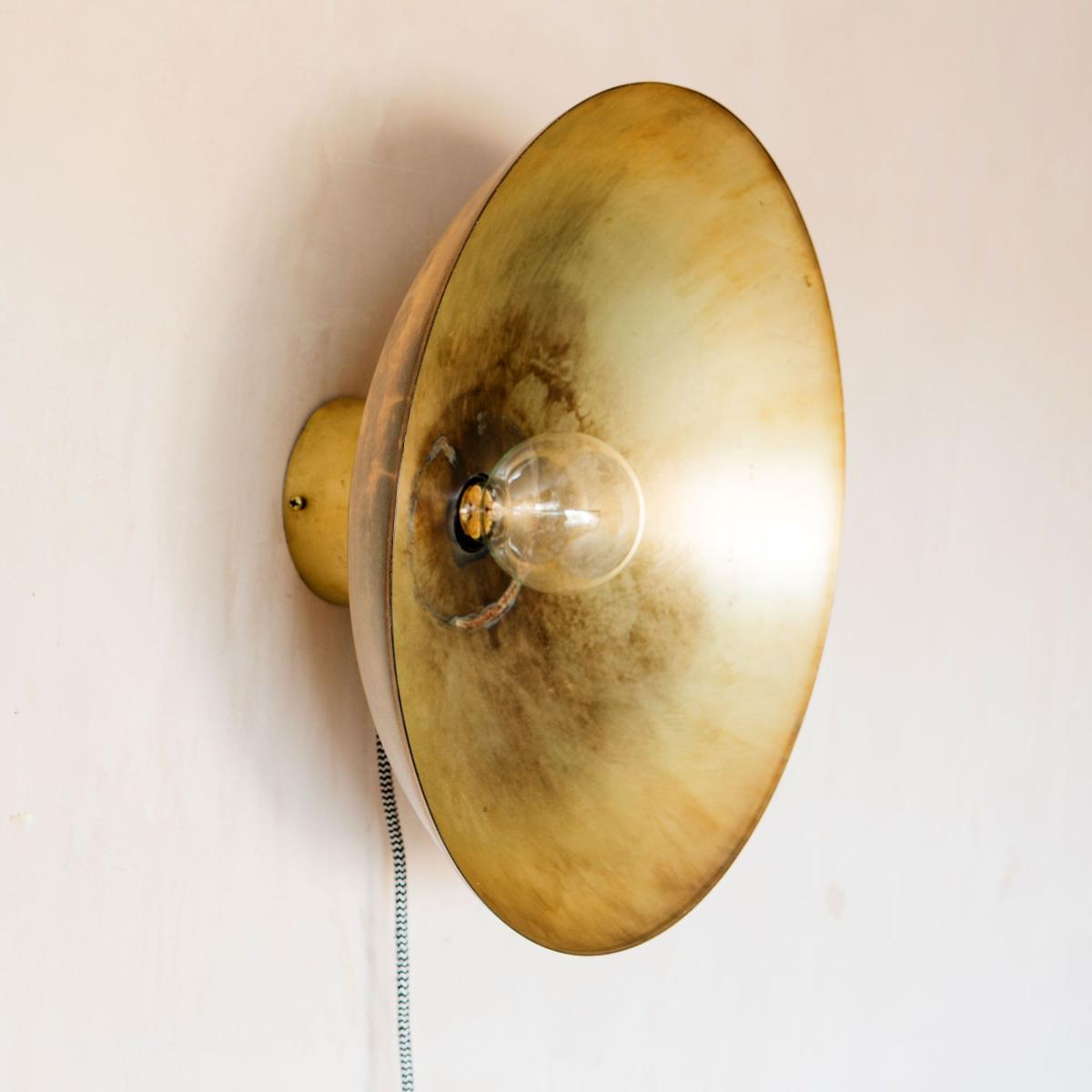 A striking circular wall light with a unique concave shape, handcrafted from iron with an antiqued, blue gold finish.