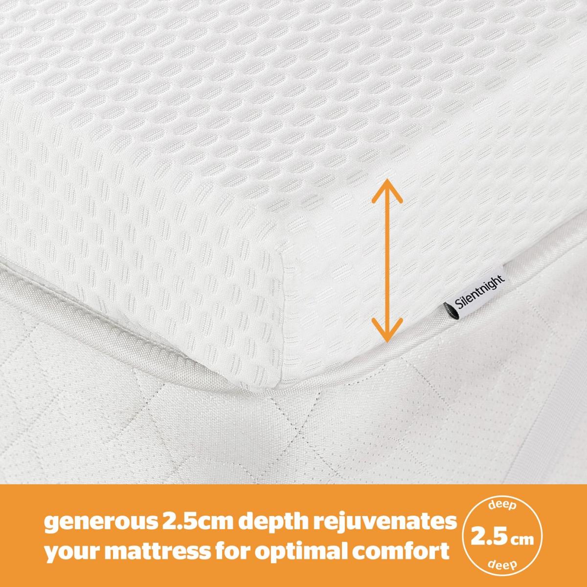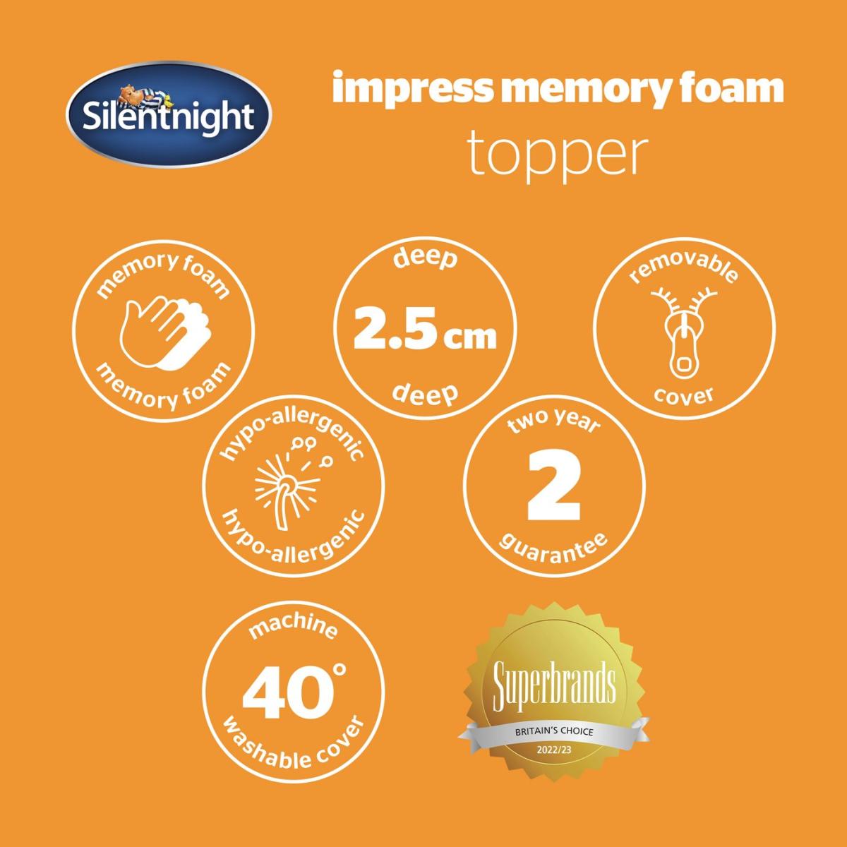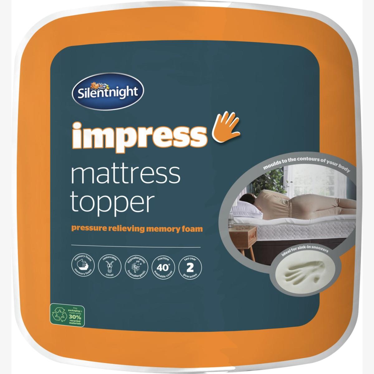 The Impress Memory Foam Mattress Topper by Silentnight has been designed to offer both soothing pressure relief and ultimate comfort. The mattress topper features soft and reactive 2.5 cm deep memory foam that moulds to your unique body shape helping to reduce the pressure points on your spine, giving relief to the muscles and reducing aches and pains. Comes complete with a removable cover that is soft to the touch and will provide exceptional comfort for a perfect night's sleep. Suitable for double beds. Cover made from 100% knitted polyester. Elastic foam filling. Memory foam. Cover is machine washable at 40. C and suitable for tumble drying.