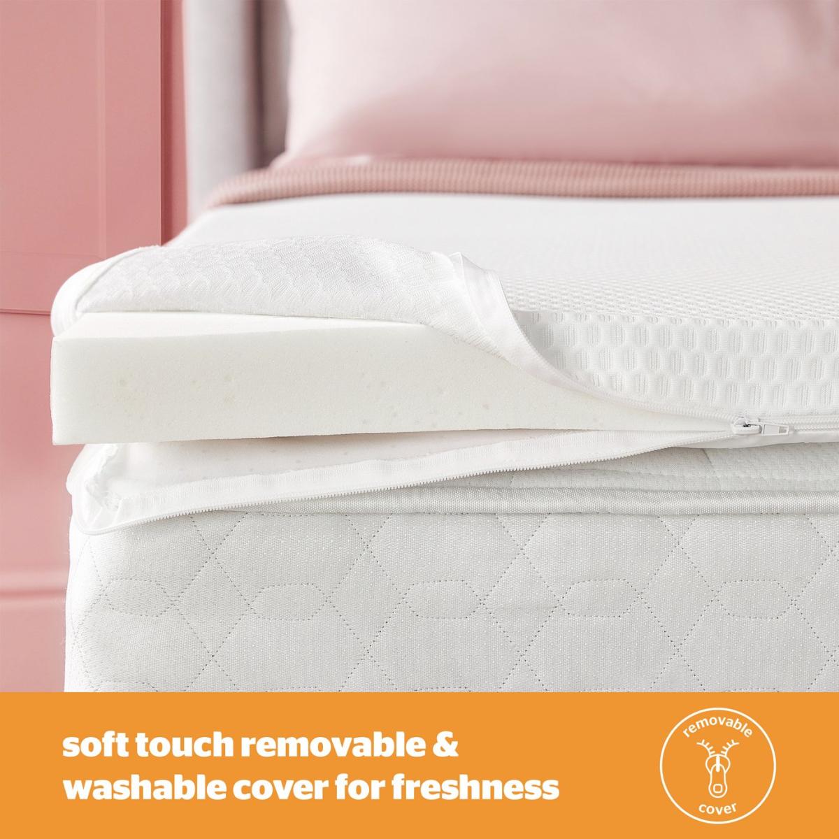 The Impress Memory Foam Mattress Topper by Silentnight has been designed to offer both soothing pressure relief and ultimate comfort. The mattress topper features soft and reactive 2.5 cm deep memory foam that moulds to your unique body shape helping to reduce the pressure points on your spine, giving relief to the muscles and reducing aches and pains. Comes complete with a removable cover that is soft to the touch and will provide exceptional comfort for a perfect night's sleep. Suitable for single beds. Cover made from 100% knitted polyester. Elastic foam filling. Memory foam. Cover is machine washable at 40. C and suitable for tumble drying.