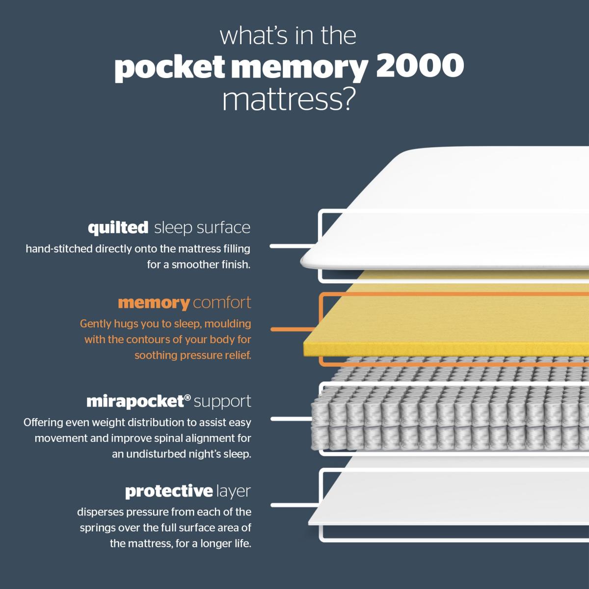 Part of the Premium Pocket Collection, this 2000 Pocket Memory mattress offers comfort that is second to none, with 2000 pocket springs held under tension in their own fabric pockets to provide zoned support, scientifically proven to provide better spinal alignment. Body moulding memory foam responds to your body's temperature for individual comfort and pressure relief where you need it most. The springs in this mattress offer head to toe, edge to edge support for more personal sleep space. This mattress provides a medium comfort. The memory foam layer allows free movement without disturbance, as the foam quickly recovers to support your body. While individual springs spread weight across the mattress for tailored pressure relief. It's finished with a knit cover for a beautifully soft sleep surface, with Allergy UK approved treatment to reduce moisture and dust-mite allergens for an all-round healthier mattress. Designed to perfectly complement the Silentnight Premium Divan Sets: Alaro, Roma, Sassaria and Toulouse. At Argos Home we want you to get the best night's sleep possible, so we offer a 100 night comfort promise on our mattresses. Try your new mattress for up to 100 nights and if you aren't sleeping soundly, we'll offer you an exchange for one that suits you better. Part of the Premium Pocket collection. Medium feel. Pocket sprung mattress with 2000 springs. Knit cover with quilted finish. No roll together. Anti allergy. Mattress size W180, L200, D31cm. No-turn mattress. Rotate mattress regularly. Made in the UK. General information: Manufacturer's 5 year parts and labour guarantee.
