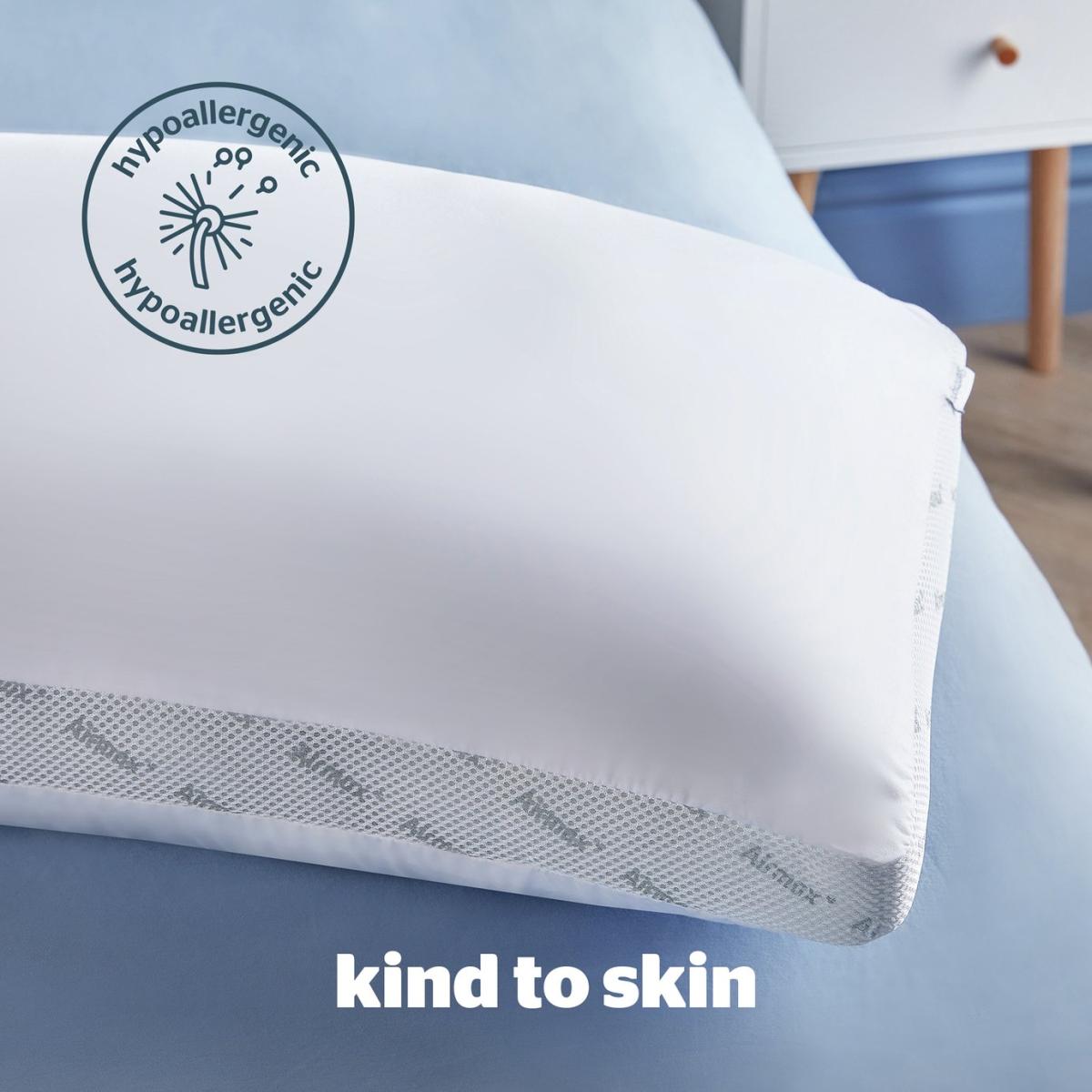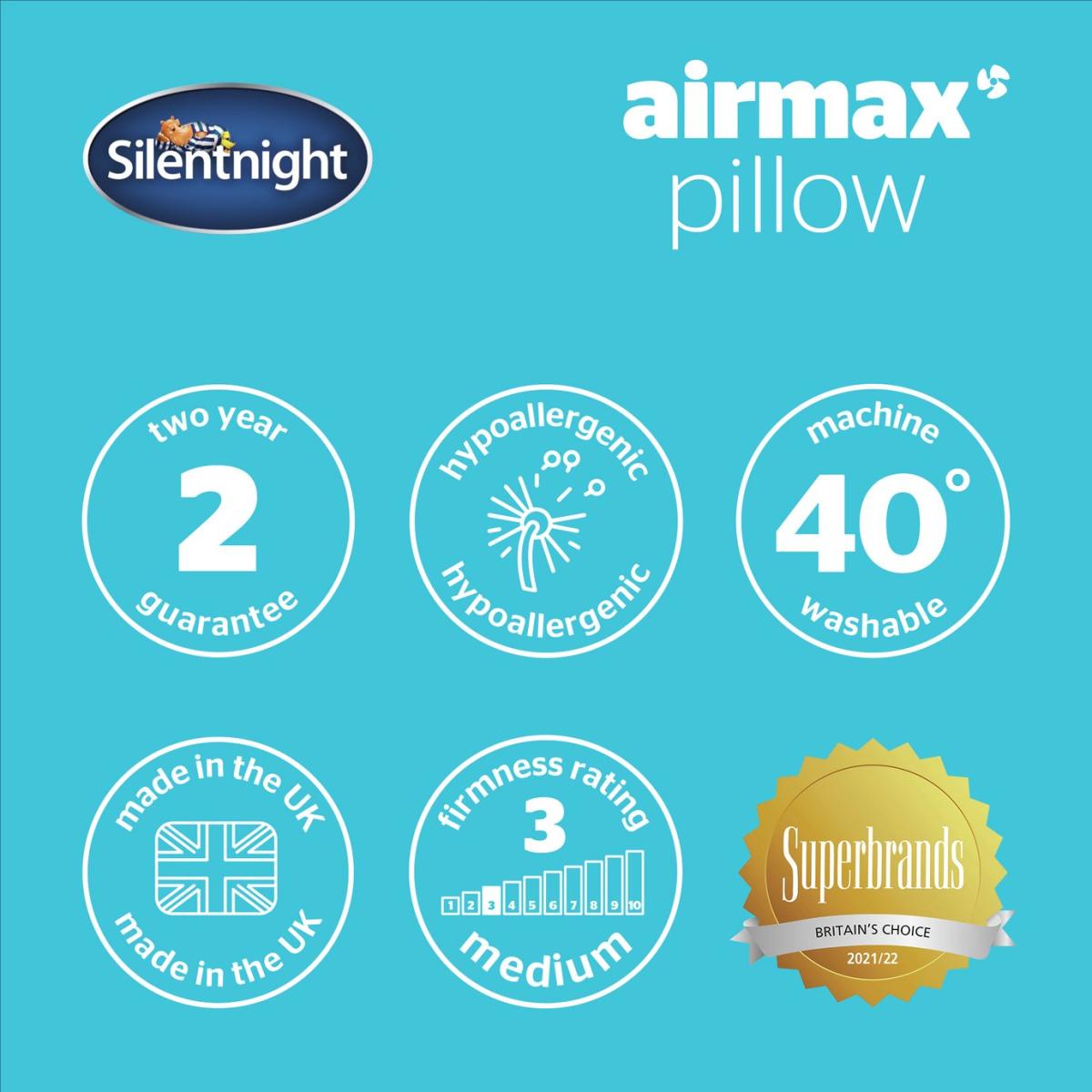 The Silentnight Airmax Pillow provides unparalleled breathability and comfort for a great night's sleep. Specially designed to increase airflow and circulation, the Airmax pillow features air mesh sides to help air to move freely around your head to prevent overheating and to keep you comfortable in every season. Silentnight Airmax Pillow is hypoallergenic which means it does not contain any materials that are likely to cause allergies. It is machine washable so you can keep your pillow feeling fresh and clean for longer.