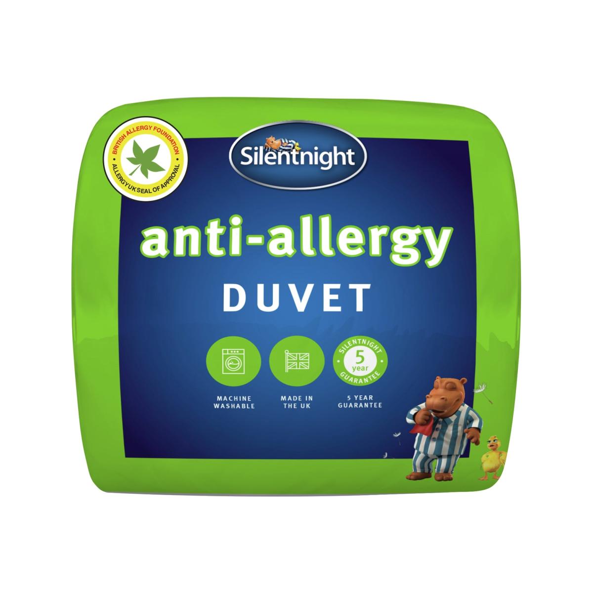 The Silentnight anti-allergy duvet is filled with anti-allergy hollowfibre that actively protects your duvet from bacteria and dust mites to help prevent allergies. Our anti-allergy fibres are approved by the British Allergy Foundation, which means they have the ultimate seal of approval. It is also machine washable at 40. C which means you can keep your duvet fresh and clean for longer. Double duvet. 10.5 tog duvet. Cover made from 100% polyester. Filling made from 100% hollowfibre polyester. Size L200, W200cm. Machine washable at 40 C. Suitable for tumble drying. Contains a biocide to help protect against bacteria and dust mite allergens. Active substance: Dimethyloctadecyl[3-(trimethoxysilyl)propyl]ammonium chloride. Manufacturer's 5 year guarantee.