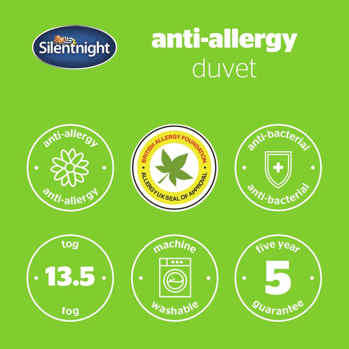 Silentnight Anti-Allergy Duvets are the perfect answer to a fresh, hygienic night's sleep. Providing ultimate protection, they are filled with anti-bacterial, anti-allergy fibres that actively guard against bacteria and dust-mites, keeping your duvet feeling fresh and clean ensuring allergens from the indoor environment are removed. Our anti-allergy fibres are approved by the British Allergy Foundation and have been scientifically tested, making this a great choice for allergy and asthma sufferers. King size duvet. 13.5 tog duvet. Cover made from 100% microfibre. Filling made from 100% hollowfibre polyester. Size L220, W225cm. Machine washable. Suitable for tumble drying. Anti-allergy. Contains a biocide to help protect against bacteria and dust mite allergens. Active substance: Dimethyloctadecyl[3-(trimethoxysilyl)propyl]ammonium chloride. Manufacturer's 5 year guarantee.