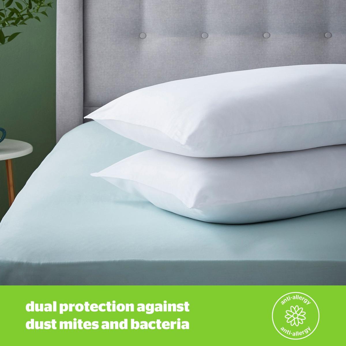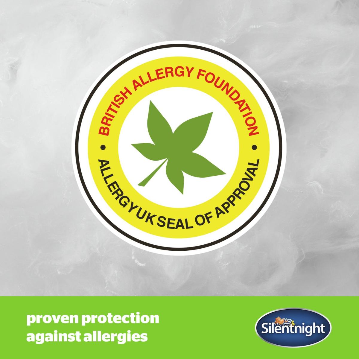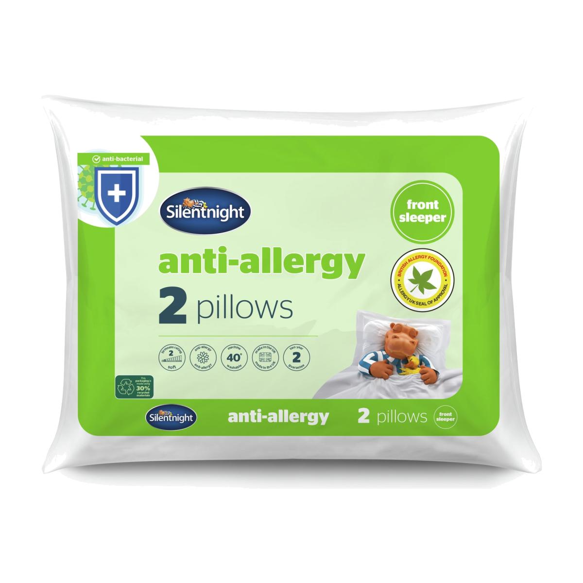 The Silentnight Anti-Allergy pillows are filled with anti-allergy hollowfibre that actively protect your pillows from bacteria and dust mites to help prevent allergies. Our anti-allergy fibres are approved by the British Allergy Foundation, which means they have the ultimate seal of approval. The pillows are also machine washable which means you can keep them fresh and clean for longer. These pillows provide soft comfort, perfect for those who sleep on their front. Scientifically tested and proven to reduce or remove allergens that could otherwise be present in your pillows. Pack quantity: 2. Cover made from 100% polyester. Filling made from 100% polyester. Soft pillow. Suitable for front sleepers. Size L74, W48cm. 1kg. Machine wash as synthetic at 40 C. Suitable for tumble drying. Anti-allergy. Contains a biocide to help protect against bacteria and dust mite allergens. Active substance: Dimethyloctadecyl[3-(trimethoxysilyl)propyl]ammonium chloride. Manufacturer's 2 year guarantee.