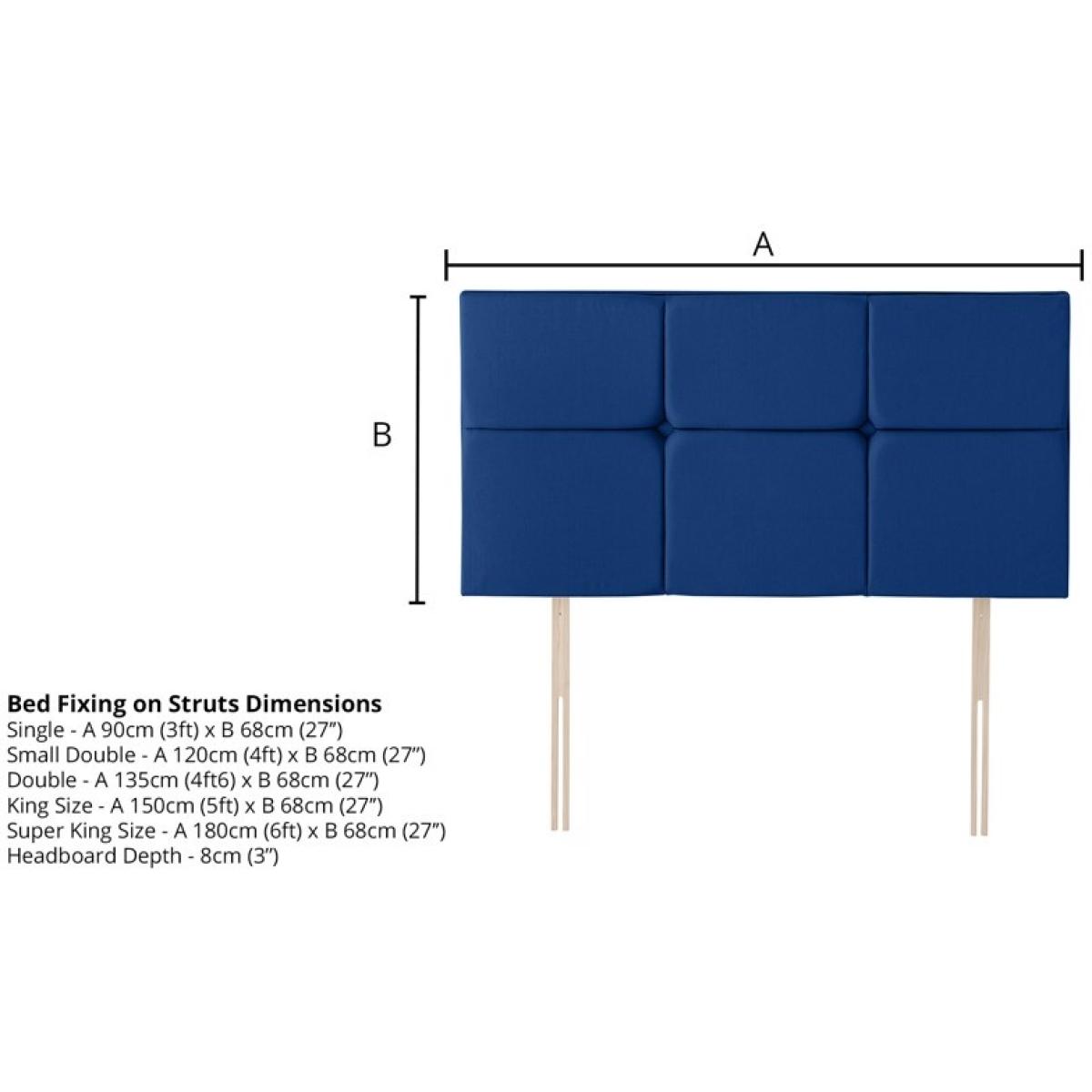 The Silentnight Arezzo Strutted Headboard is the perfect addition to elevate the style and comfort of your bedroom. With its sleek, modern design, this headboard seamlessly complements a variety of bed frames and decor styles. Featuring a soft yet supportive construction, it provides a cushioned surface for comfortable lounging, reading, or relaxing in bed. The Arezzo headboard is crafted with quality materials and finished with a luxurious fabric that adds a touch of sophistication to your room. The strutted design ensures secure, adjustable fitting to most standard bed frames, allowing you to customize the height for your ideal comfort and aesthetic. Whether you're looking to enhance your bedroom's design or enjoy additional support while resting, the Silentnight Arezzo Strutted Headboard offers both functional and stylish benefits, creating a perfect focal point for your space. Bed Fixing on Struts - The bed fixing on struts option uses the traditional headboard design with 2 wooden fixing posts attached to the back. Features: Approved by the National Bed Federation (NBF) ensuring it has been manufactured to the highest UK standards Square padding with buttoned detailing to enhance comfort and styling FSC Certified Timber - The mark of responsible forestry Available in a wide range of Silentnight fabrics and colours Free 5 year guarantee for total peace of mind Dimensions: Single - W 90cm (3ft) x H 68cm (2ft2) x D 8cm (3”) Small Double - W 120cm (4ft) x H 68cm (2ft2) x D 8cm (3”) Double - W 135cm (4ft6) x H 68cm (2ft2) x D 8cm (3”) King Size - W 150cm (5ft) x H 68cm (2ft2) x D 8cm (3”) Super King Size - W 180cm (6ft) x H 68cm (2ft2) x D 8cm (3”) All screens vary in colour reproduction and whilst every effort has been made to display the colour as accurately as possible it is for guidance only.