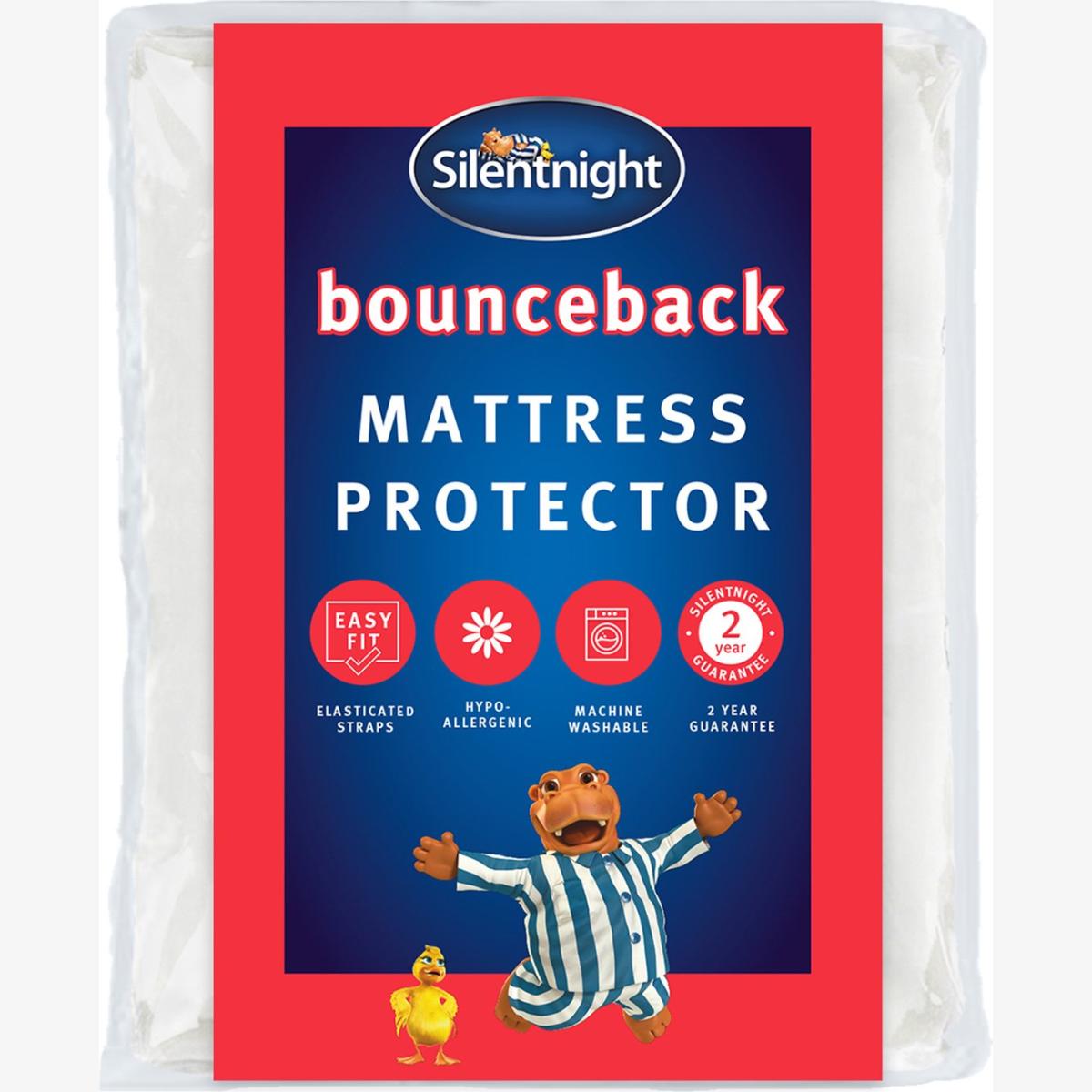 Enjoy endless comfort with bouncy fibres that rebound night after night. The Silentnight Bounceback Mattress protector protects and prolongs the life of your mattress, helping to shield against general wear and tear. It is generously filled with springy hollowfibre, the topper provides gentle support which adds an extra layer of comfort to any mattress. The protector is hypoallergenic which means it is kind to skin and do not include any contents likely to cause allergies. It's machine washable so you can keep that fresh feeling for longer. The Silentnight Bounceback Mattress protector protects and prolongs the life of your mattress, helping to shield against general wear and tear. Suitable for single beds. Non-allergenic. Polyester microfibre cover. Polyester hollowfibre filling. Secured by elasticated corner tapes. Size L193, W90cm. Machine washable. Line dry. Suitable for tumble drying.