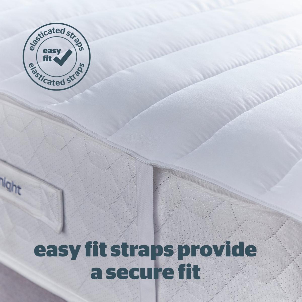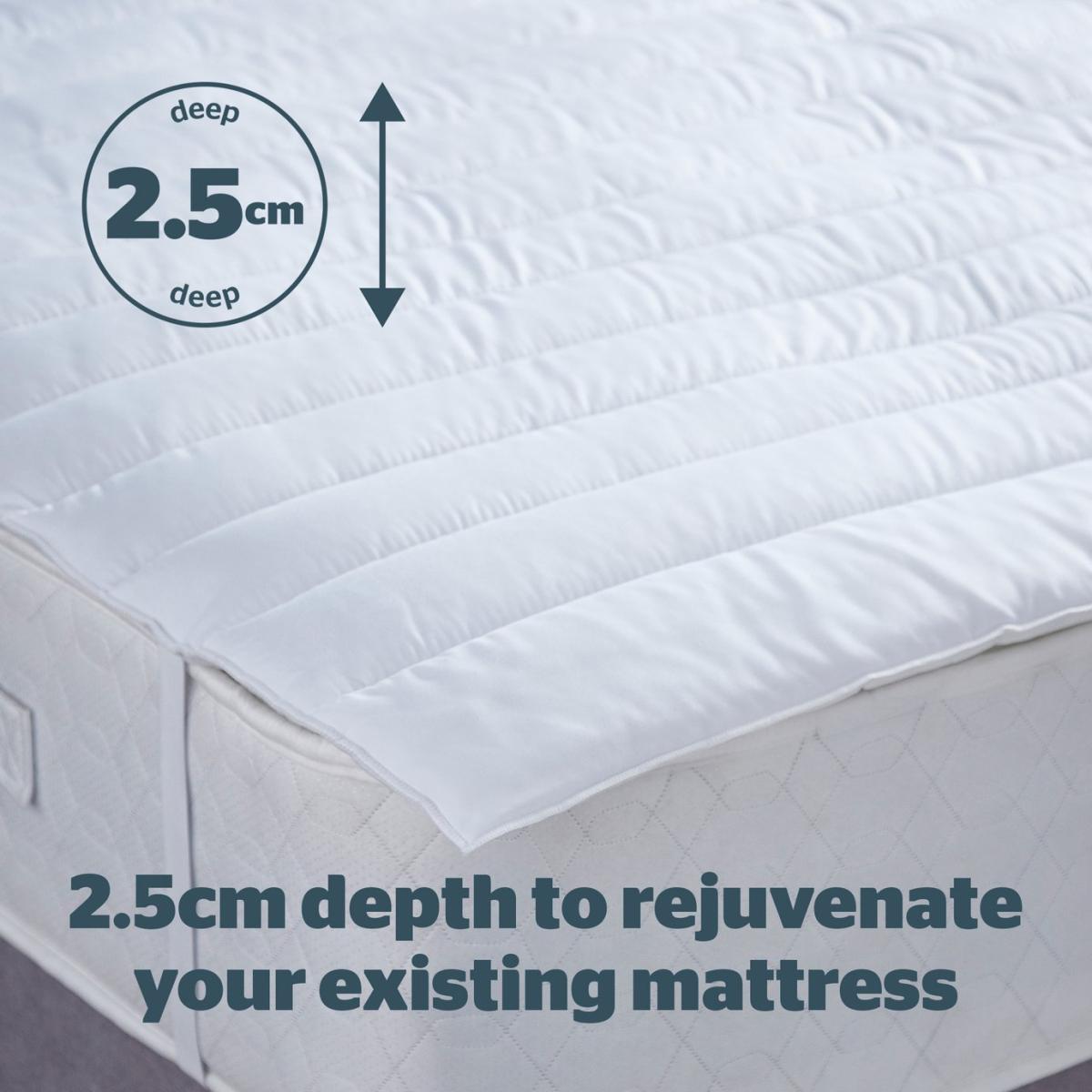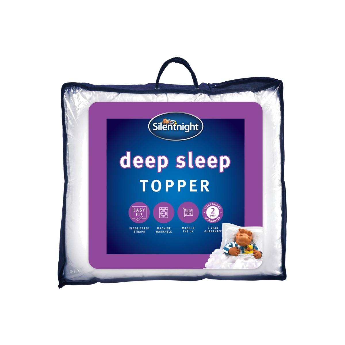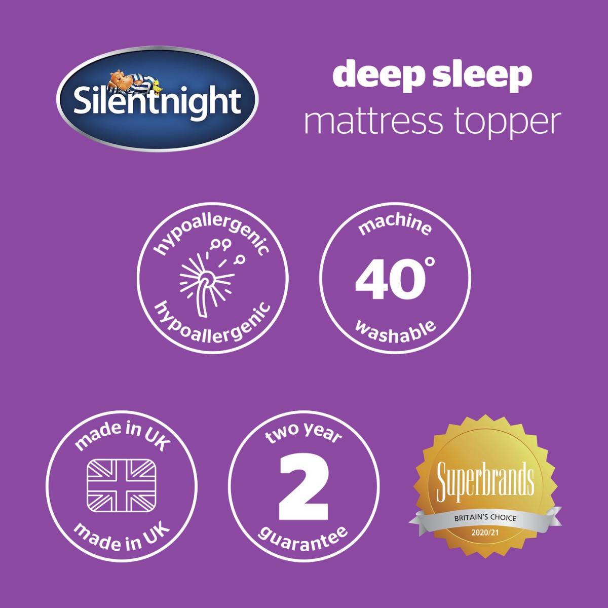 Sink into deeper sleep. Generously filled for endless comfort and support, helping you to sleep more deeply every night. The Silentnight Deep Sleep Mattress Topper is generously filled with hollowfibre and covered in soft microfibre which results in a soft, cosy topper that provides gentle support and adds an extra layer of comfort to any mattress. The topper is hypoallergenic which means it's kind to skin and does not include any contents likely to cause allergies, it's also machine washable so you can keep enjoying a deep sleep. Set includes: 1 topper. Suitable for single beds. Size L193, W90, D2.5cm. Cover made from 100% polyester microfibre. 100% polypropylene reverse. 100% polyester hollowfibre filling. Secured by elasticated corner straps. Non-allergenic. Cover is machine washable and suitable for tumble drying.
