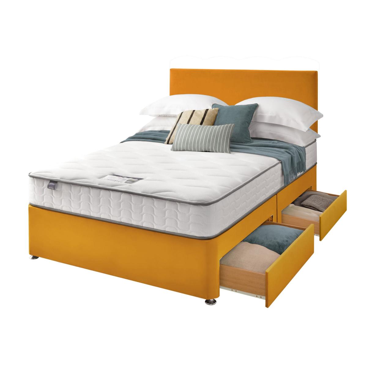 * Divan Bed* Bed Mounted Headboard* Includes Mattress* Trendy and Soft Velvet Upholstery This all-inclusive divan set seamlessly marries functionality and elegance, featuring a refined headboard, and an extraordinary 800 pocket mattress. Silentnight's cutting-edge Mirapocket technology takes centre stage, providing 800 individual pocket springs for unparalleled comfort, support, and pressure relief. The zoned Mirapocket support system ensures even weight distribution, promoting effortless movement and enhancing spinal alignment, while the edge-to-edge support creates a haven for an undisturbed night's sleep. The mattress's responsive pocket springs adapt to your body weight, delivering a luxurious blend of comfort and personalised support. Plump filling layers and a sumptuously soft knitted mattress cover add to the lavishness, with a hypoallergenic finish for peace of mind. The medium-firm comfort rating caters to those who transition between back and side sleeping positions. Please note, the mattress binding colour may differ slightly from image. This does not affect the quality or use of the final product.