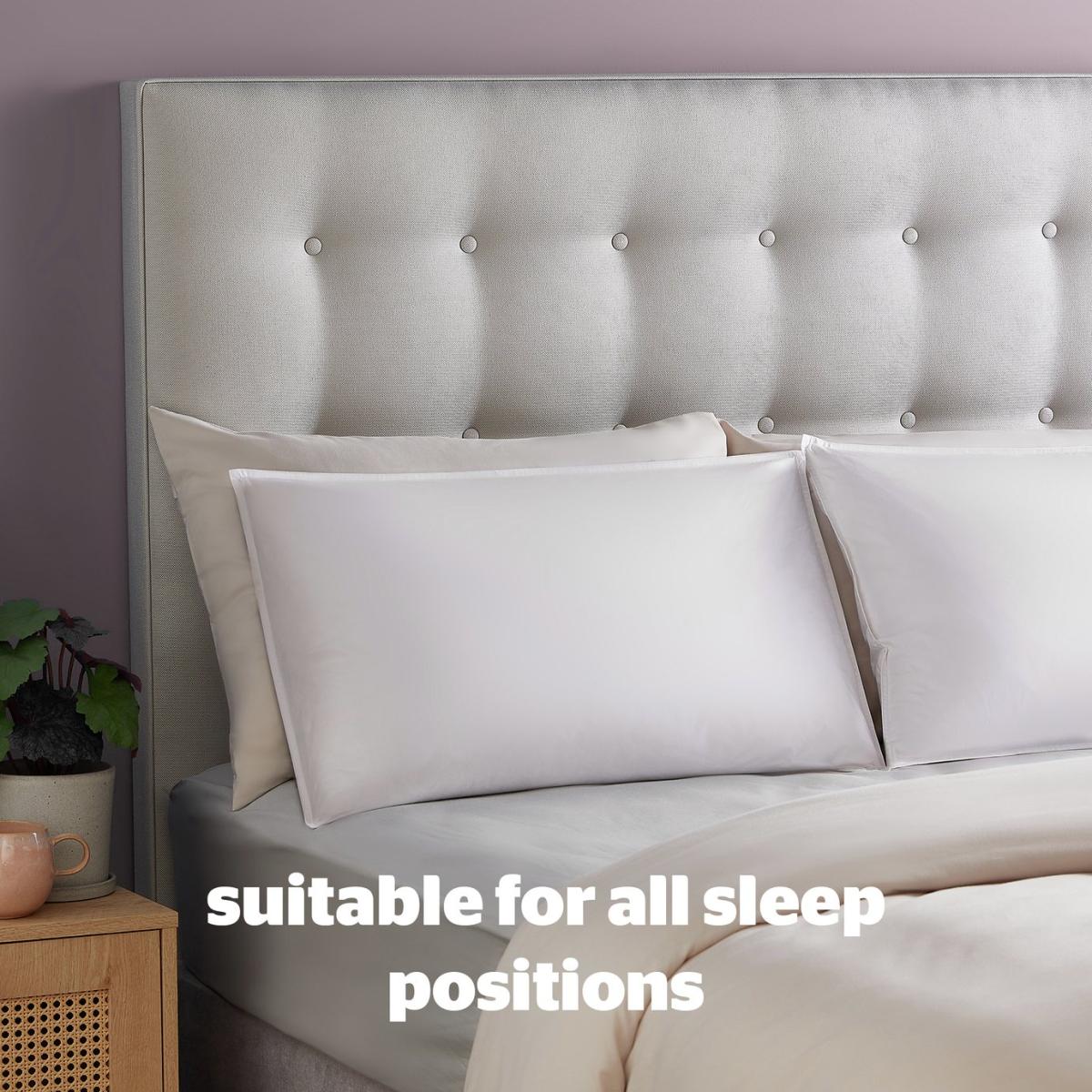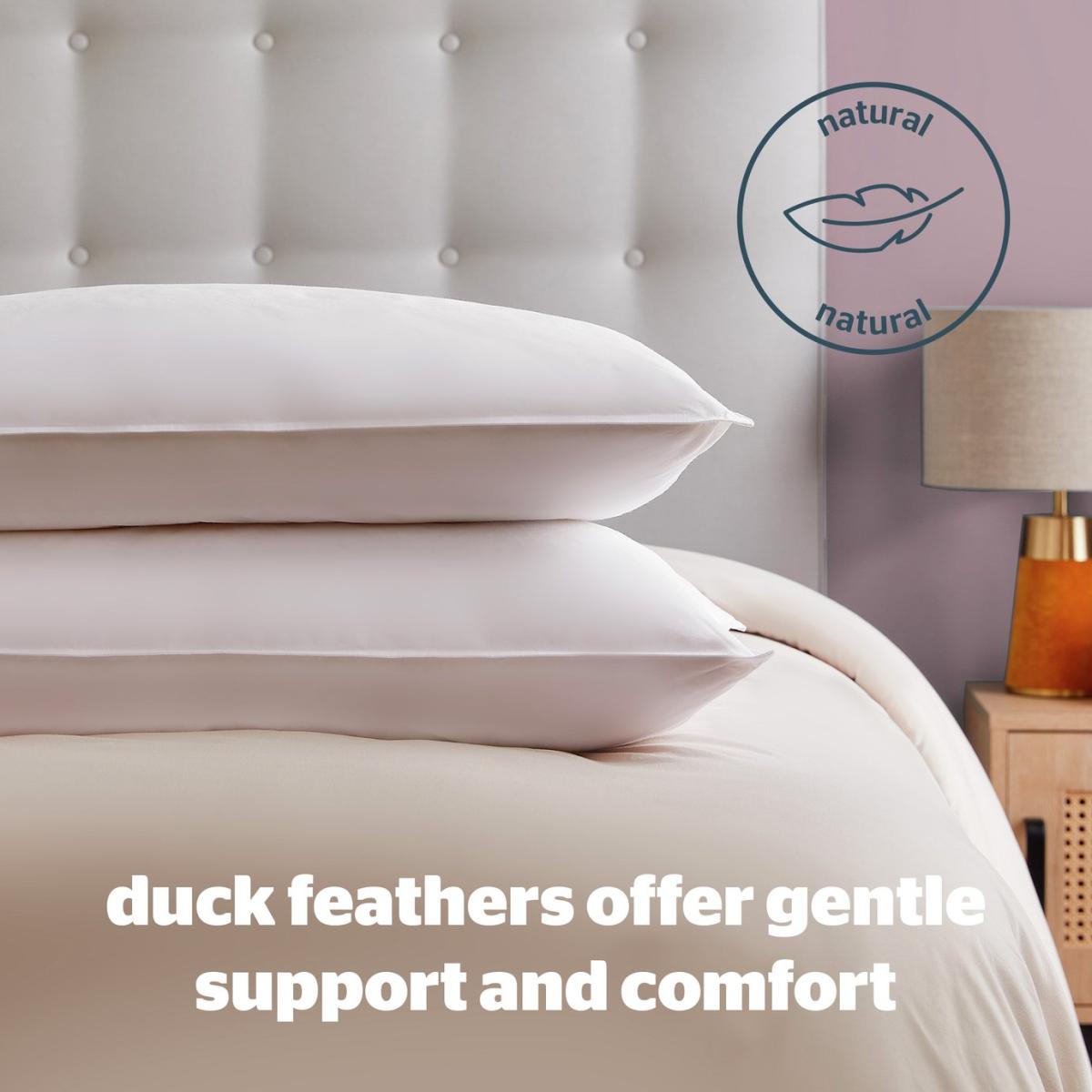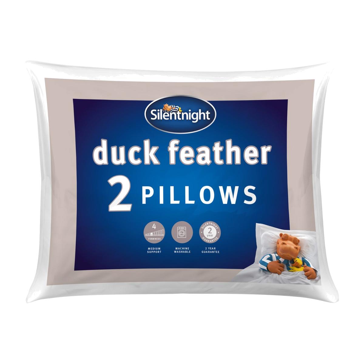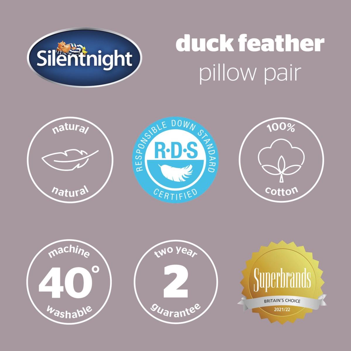 Enjoy ultimate comfort with naturally soft duck feathers encased in a breathable cotton cover. The Silentnight Duck Feather Pillows are filled with wonderfully soft duck feathers to offer luxurious comfort to slowly sink your head into. The feathers are naturally lightweight and airy so give you that extra bit of loft. Encased in a smooth cotton cover which is naturally breathable and cooling to keep you comfortable. The pillows are machine washable so you can experience naturally comfort night after night. Use one pillow for soft comfort. Use two pillows for medium comfort. Pack quantity: 2. Cover made from 100% percale. Filling made from 100% duck feather. Ethically sourced and RDS approved. Medium soft pillow. Suitable for back sleepers. Size L69, W46cm. 1.3kg. Machine washable at 40 C. Suitable for tumble drying. Anti-allergy. Manufacturer's 2 year guarantee.