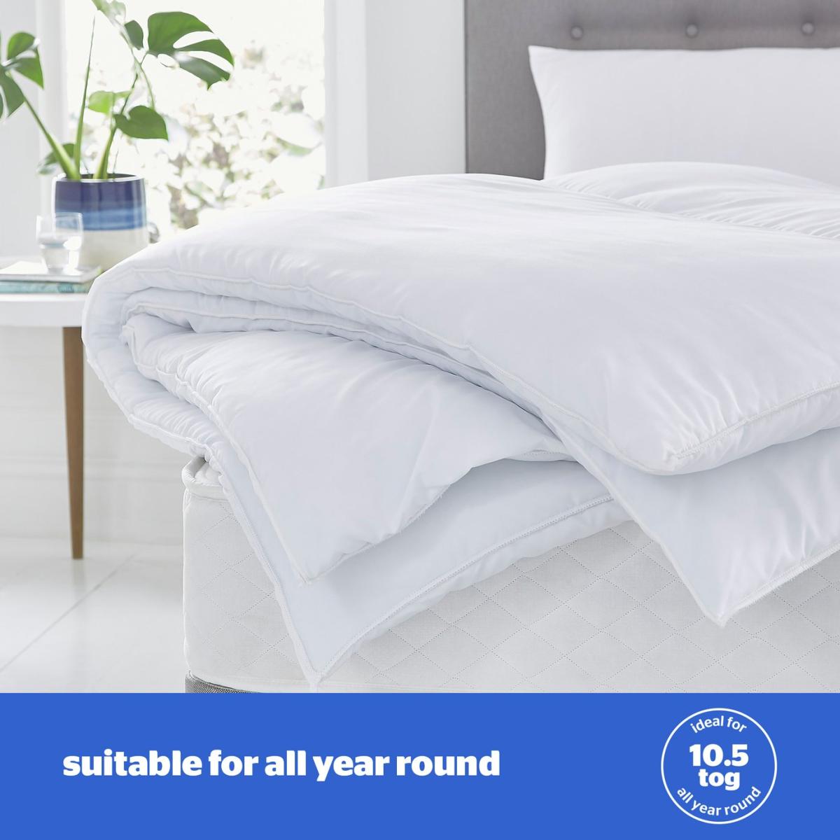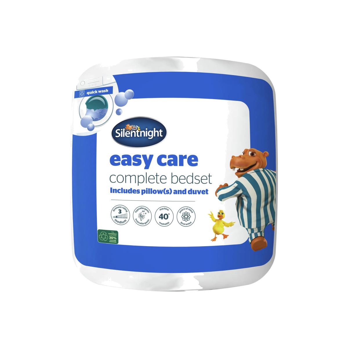 Specially designed to withstand machine washing so you can experience fresh and clean comfort wash after wash. The set includes a 10.5 tog duvet and comfortable pillow. These lovely products are filled with hollowfibre which is lightweight and comforting and wrapped in a soft touch microfibre cover. The Silentnight Easy Care Complete Bed Set is hypoallergenic & each product is machine washable which means you can keep your duvet and pillows fresh and clean for longer. Single set includes one pillow, all other sizes include 2 pillows. Set includes 1 Single Duvet & 1 Pillow. 10.5 tog duvet. 100% polyester. Cover made from 100% polyester. Filling made from 100% polyester. Single bed. Duvet size L135, W200cm. Duvet weight 1.6kg. Soft pillow. Suitable for front sleepers. Pillow size L72, W48cm. Pillow weight 0.6kg. Machine washable at 40 C. Duvet suitable for washing in a standard size washing machine. Suitable for tumble drying.