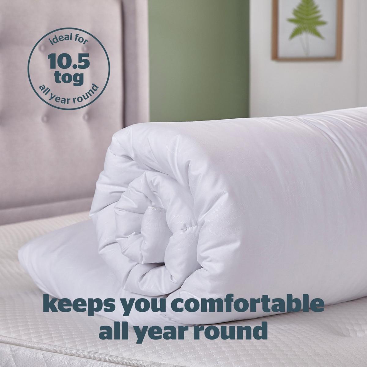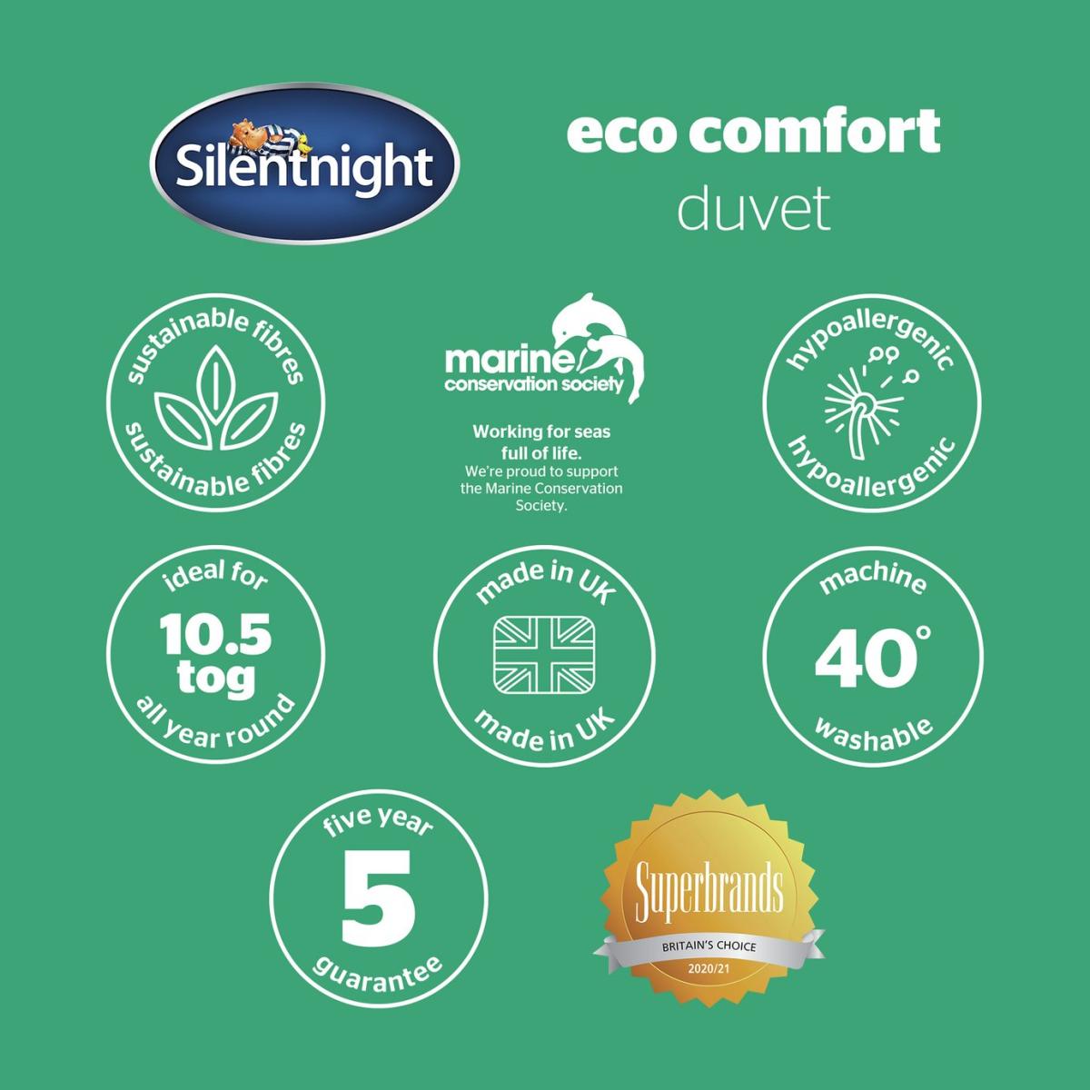 Sleep well knowing you're creating a better tomorrow, with the Silentnight Eco Comfort Duvet. The Eco Comfort Duvet is filled with high performance Eco Comfort Fibres™ made from 100% recycled plastic bottles which have been transformed into a luxuriously soft, light and fluffy fibre filling, bringing you incredible comfort throughout the night. Each duvet has prevented at least 32 plastic bottles going into landfill or our oceans. Encased in chemical treatment free embossed fabric. Beautifully embossed covers that feel soft to the touch for extra comfort. Double duvet. 10.5 tog duvet. Cover made from 100% polyester. Filling made from 100% polyester. Ethically sourced and RDS approved. Size L200, W200cm. Machine washable. Suitable for washing in a standard size washing machine. Suitable for tumble drying. Manufacturer's 5 year guarantee.