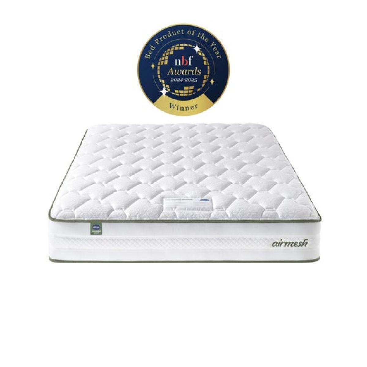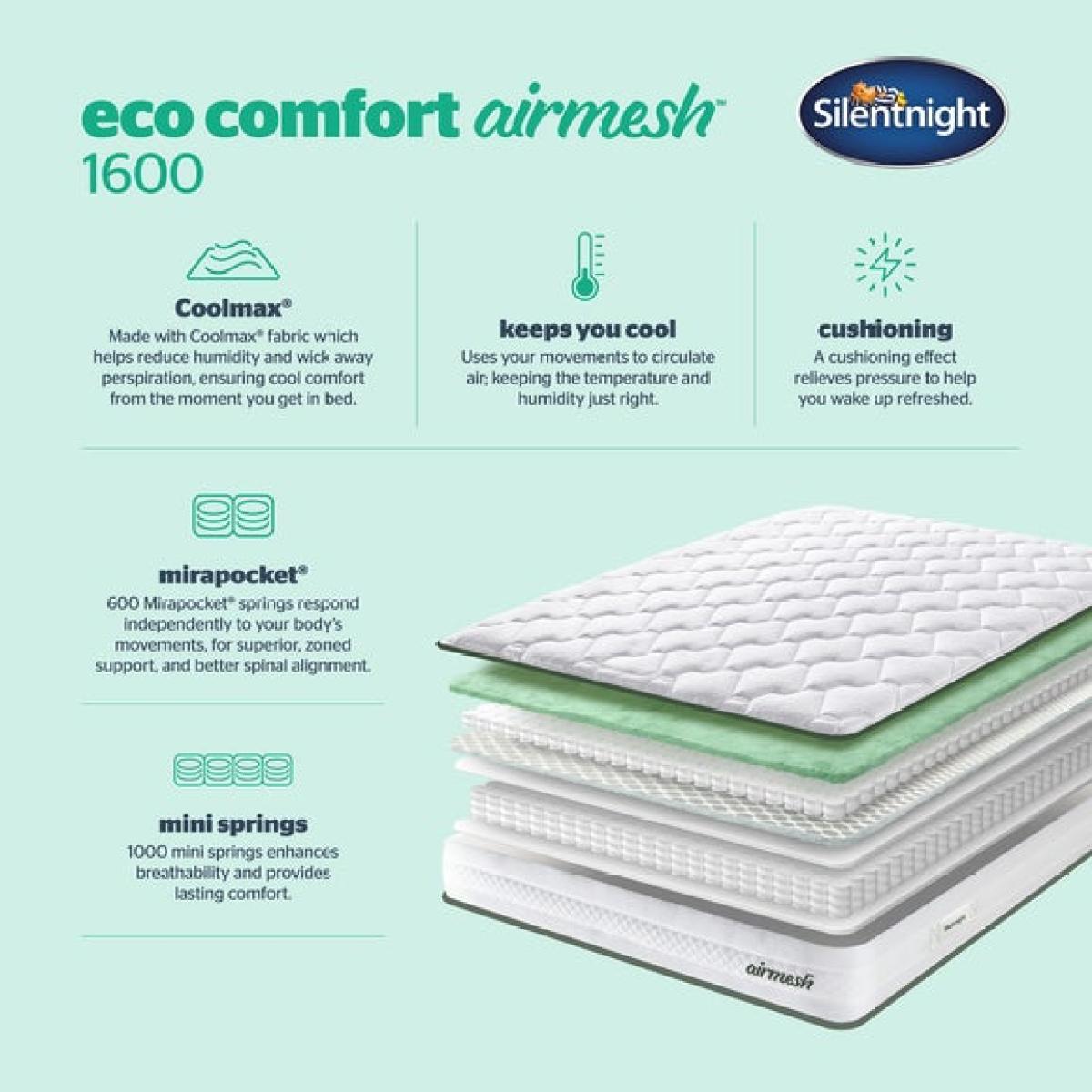 * 1600 springs for zoned support and pressure relief * COOLMAX® fabric helps reduce humidity and wick away moisture * Airmesh™ layer and mesh border boost airflow throughout the night * Eco Comfort™ fibres made with 60% recycled materials * Naturally hypoallergenic and fire-retardant * Backed by a 5-year guarantee Built for cooler nights and better mornings, the Silentnight Eco Comfort Airmesh 1600 Mirapocket® mattress blends breathable comfort with responsive support. With 1600 springs working together, it adapts to your movements and helps ease pressure where it matters most. The COOLMAX® fabric and Airmesh™ layer keep air flowing, so you stay fresh from lights out to wake-up. Eco Comfort™ fibres add softness and breathability, made using recycled materials to help reduce waste. Naturally hypoallergenic and fire-retardant, it’s a smart choice for restful sleep. And with a 5-year guarantee, it’s designed to last.