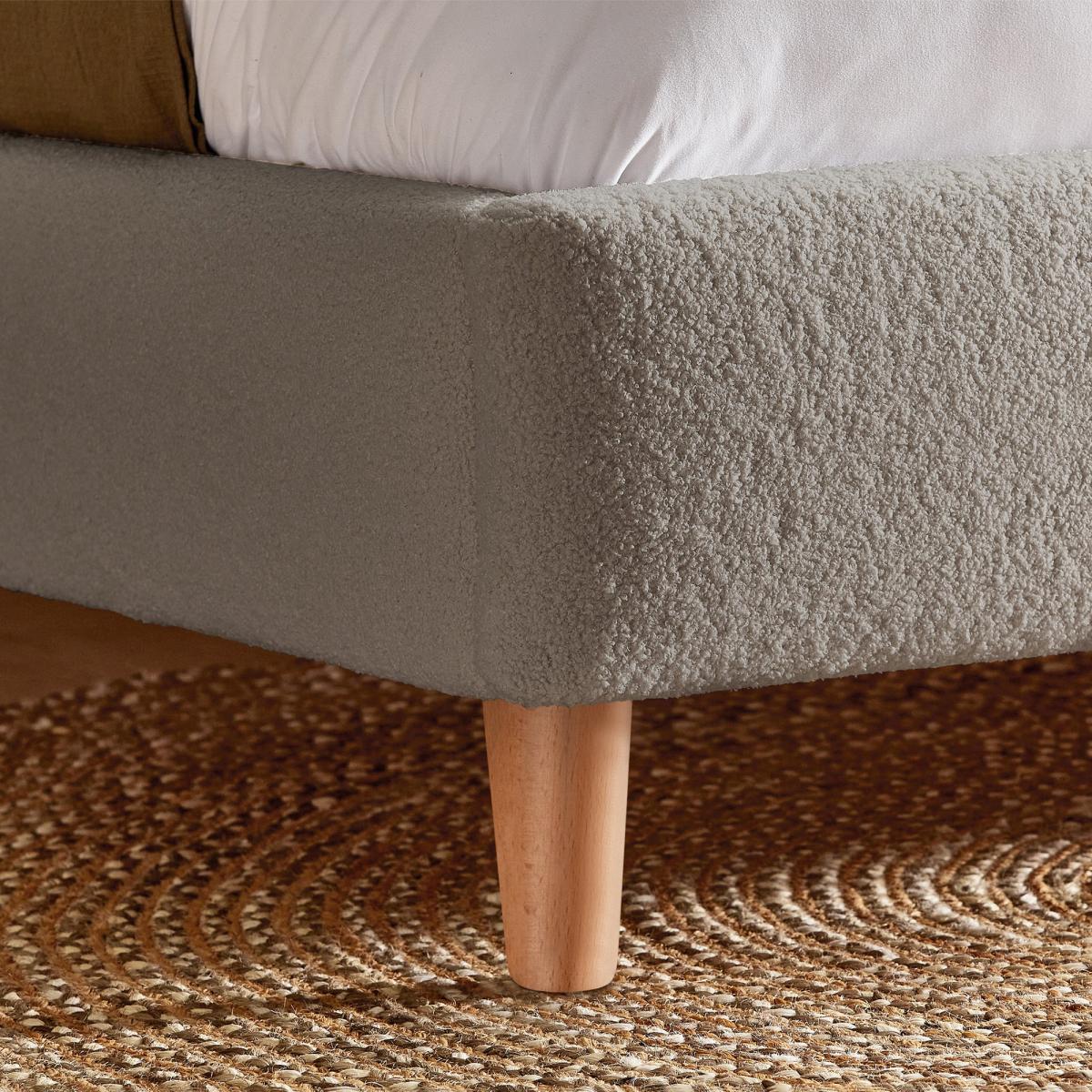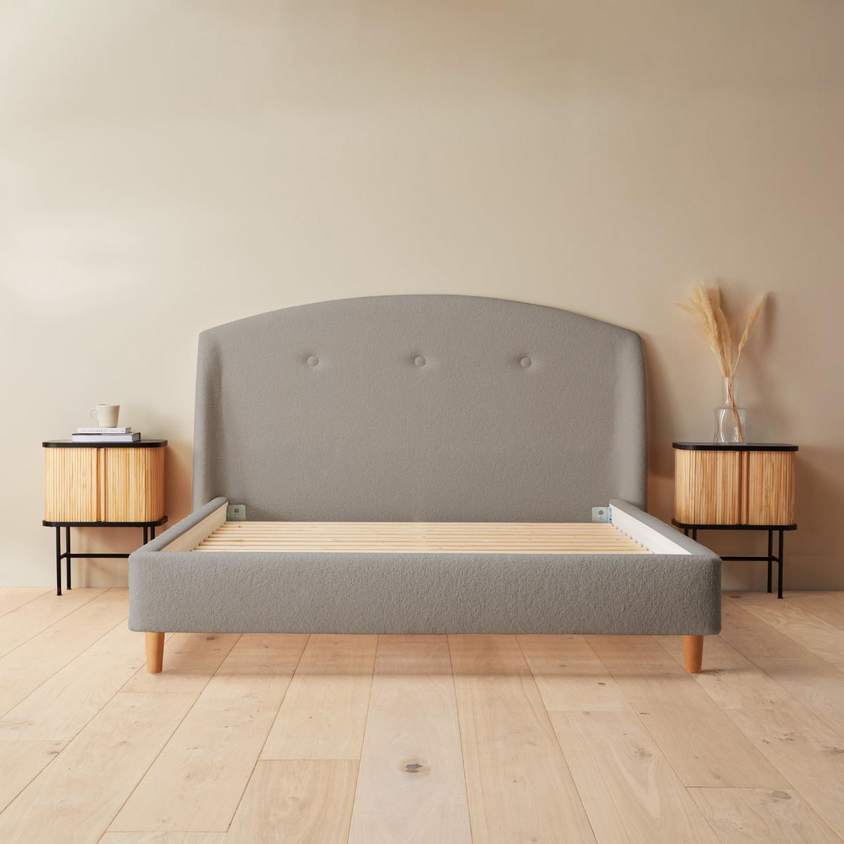 * Upholstered Headboard* Slatted Base* Low Foot End Handcrafted with care in the UK, this bedframe exudes sophistication and luxury with its plush boucle upholstery, adding a touch of opulence to any space. Embellished with three tufted buttons and a tall, padded headboard for supreme comfort, it stands gracefully on crafted wooden legs, infusing your bedroom with a fresh sense of style. Available in an array of beautiful boucle fabric choices, the Evana seamlessly complements your existing decor, elevating the ambiance with its tranquil allure. With adjustable side rails to accommodate mattresses of varying depths and a robust wooden slatted base for optimal support and airflow, the Evana promises nights of restful sleep in utmost comfort.