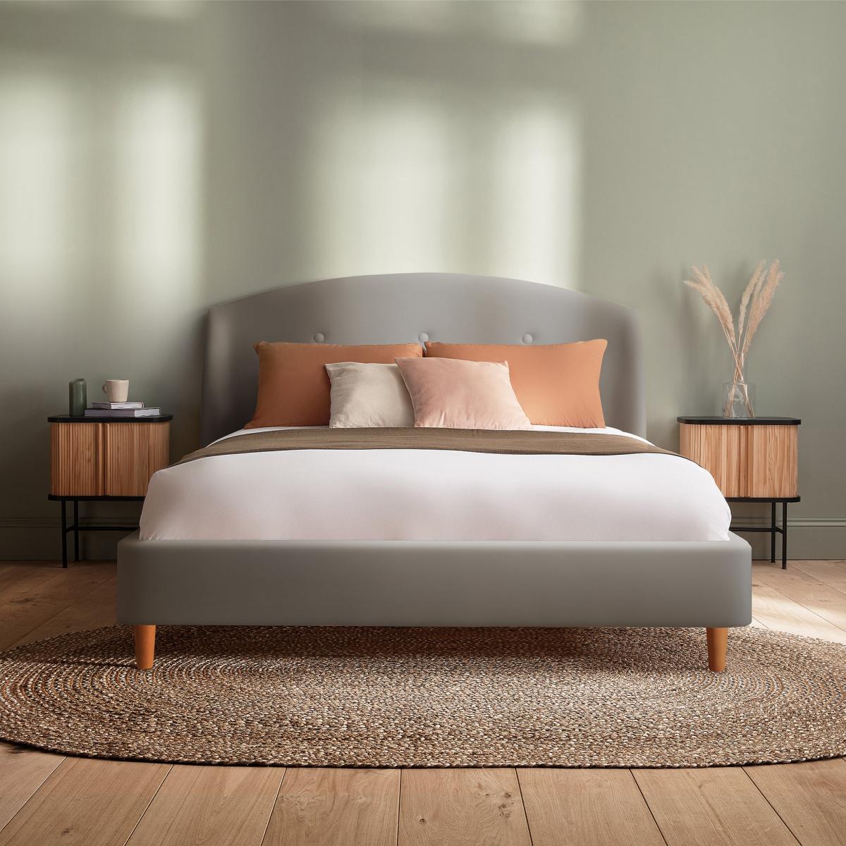 I love the Evana velvet frame in silver for its gently curved headboard and soft fabric - it bridges contemporary and mid-century styles with ease. The neutral hue suits minimalist or Scandi schemes, yet also holds its own in bolder rooms when paired with deep-toned cushions. For styling, position it against a muted accent wall in olive or charcoal, add wooden bedside tables to echo the turned legs, and layer a woven jute rug underneath to introduce texture. Keep your bedding crisp in white or pale grey, then add a couple of warm-toned scatter cushions for contrast. Its low profile also helps small bedrooms feel more open and uncluttered.