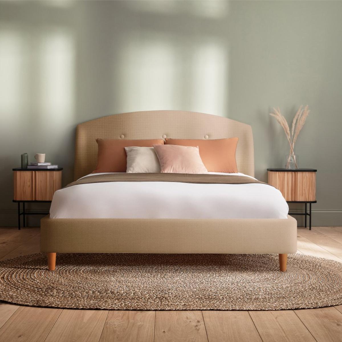 Bring a touch of peaceful elegance to your bedroom with the Silentnight Evana bedframe. Its sophisticated design and upholstery add an element of luxury to any space. Handcrafted here in the UK, using premium upholstery fabric, the Evana bedframe will elevate any existing decor. Complete with three tufted buttons, a tall, padded headboard for optimum comfort and resting on crafted wooden legs, your bedroom will feel brand new with the addition of the Evana. Available in a range of beautiful fabric choices. Adjustable side rails can be rotated to accommodate a deep or shallow mattresses. Whilst the wooden slatted base provides excellent mattress support and airflow. Our made to order furniture service means you can choose from different options, such as fabric, size and shape to create a beautiful bespoke piece of furniture. Because this piece is designed just for you, you might notice the delivery time is a little longer than usual. Bring a touch of peaceful elegance with Evana's sophisticated design and upholstery. Available in a range of fabric colours including our unique Olive Vintage Velvet for a luxurious rich palette and a calming Boucle that creates a peaceful look. Part of the Evana collection. Upholstered frame. Flat weave fabric - 51% acrylic and 20% cotton. Wooden feet. Base with wooden slats. No storage. Size W193.5, L215.5, H32.5cm. Total maximum user weight 220kg. Self-assembly - 2 people recommended. Package Dimensions: Package 1 dimensions: H103, W209, D19cm. Package 1 weight: 25.5kg. Package 2 dimensions: H25, W24, D223cm. Package 2 weight: 32kg. Package 3 dimensions: H29, W137, D8.5cm. Package 3 weight: 19kg. General Information: By choosing FSC certified products, you are supporting responsible management of the world's forests. Manufacturer's 5 year parts and labour guarantee.