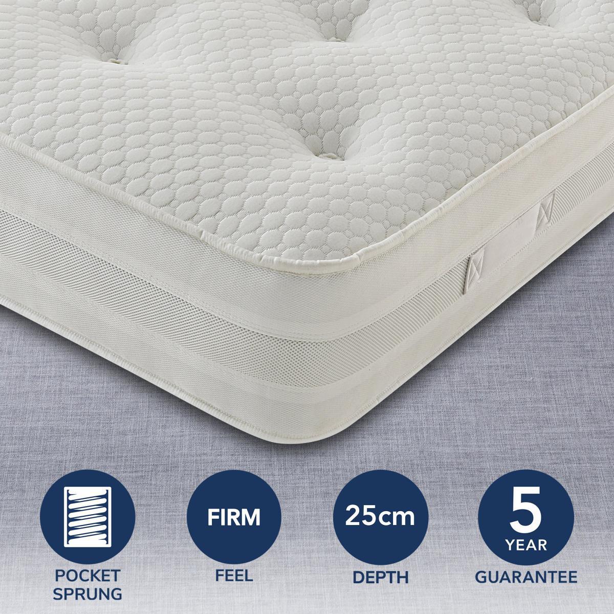 A firm orthopaedic mattress from Silentnight created with Mirapocket technology. Each mattress with Mirapocket technology contains individual springs that are held under tension in their own fabric pockets. Each spring responds to your body, spreading your weight evenly across the bed providing zoned support where you need it most and luxurious, tailored comfort that is second to none. Our Mirapocket spring system will also offer the following benefits:. Offers various spring to meet your individual comfort needs, allowing you to find your perfect comfort solution for a great night's sleep. Individual responsive spring system providing zoned support. Pressure relief for a comfortable night's sleep. Edge to edge support providing more personal sleep space. Hand tufting through the mattress provides a luxury traditional appearance while Eco Comfort Fibres allow for a more refreshing experience that's great both you and the planet - as they're made from 100% recyclable plastic bottles. This Eco Comfort Fibre layer encourages natural airflow to help prevent overheating and offers premium comfort. Please note, unfortunately we cannot deliver this item to the Channel Islands. * For health and hygiene reasons, we are unable to offer refunds or exchanges on mattresses unless they are returned unused and in their original packaging. For more information please see our Easy Returns section. For more information on different mattress types, please visit our Mattress buying guide. To check out our handy sizing guide to help you find out if you’ll be able to get your new mattress into your home.