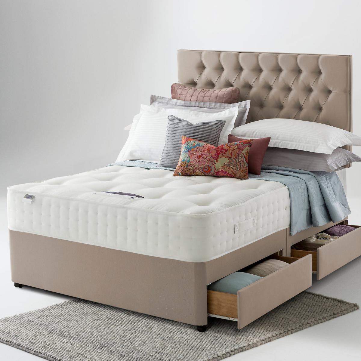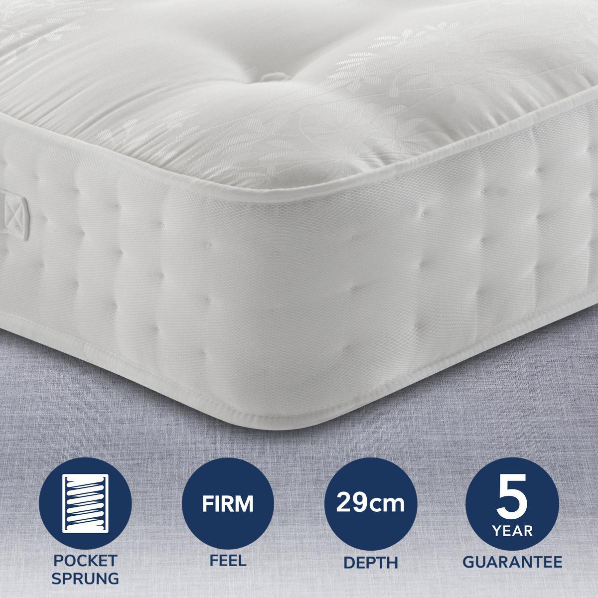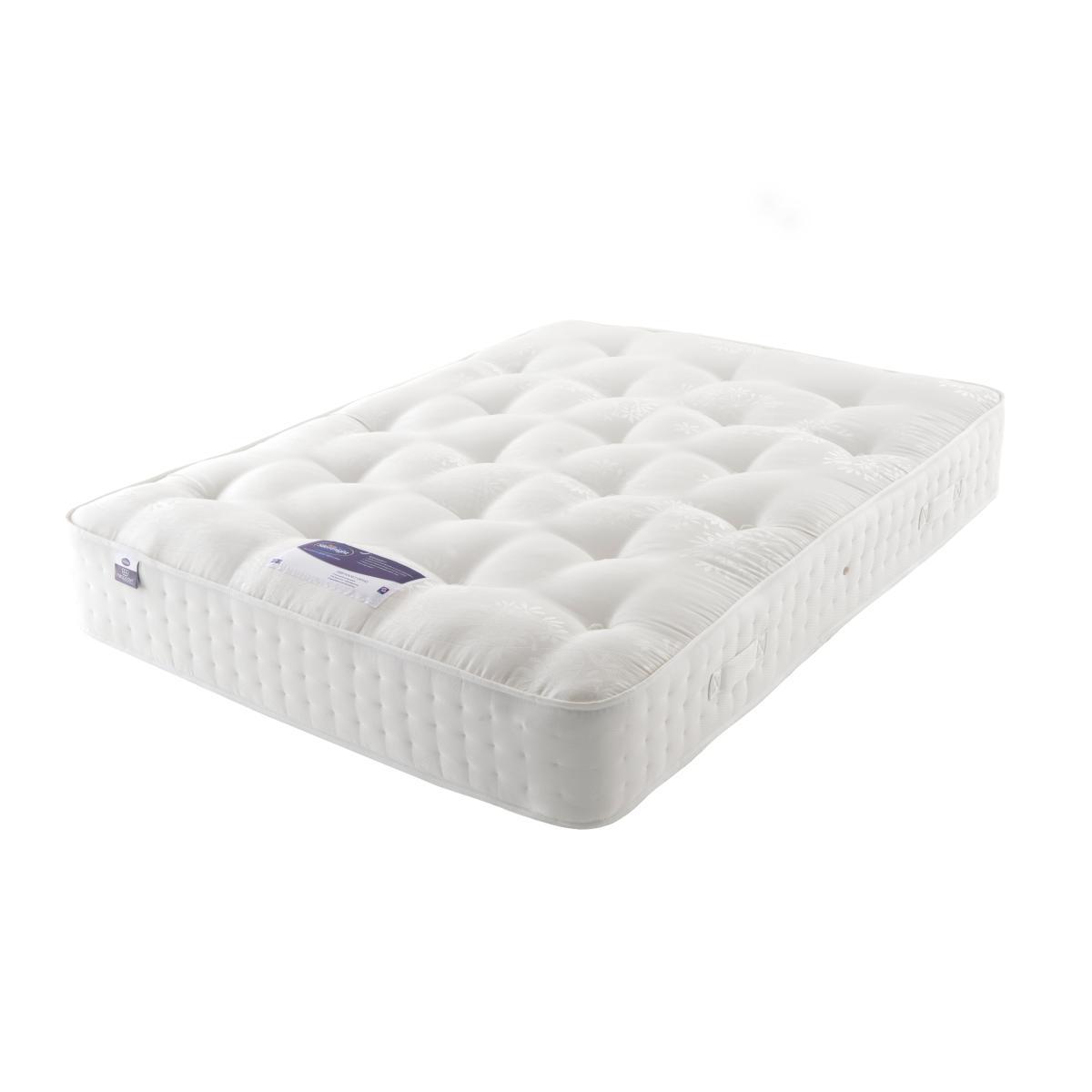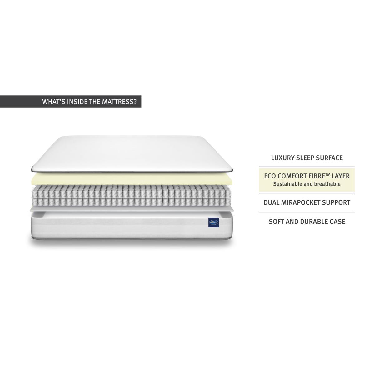 Featuring Silentnight's sustainable Eco Comfort Fibres, this premium mattress offers luxury comfort with outstanding natural breathability for a fresher sleeping environment every night. With a sumptuous dual layer 2000 pocket spring system, this mattress provides zoning across the surface which is scientifically proven to provide better spinal alignment to aid aches and pains through the night whilst also ensuring tailored comfort and support where you need it most: around the lower back and hips. Each spring independently reacts to the unique weight and movement of your body, providing even weight distribution and maximum sleeping space. The Eco Comfort Fibre layer in this mattress is made from 100% recyclable plastic bottles - to bring you premium comfort - and so far we’ve prevented over 105 million plastic bottles from entering the ocean, so it's great for both you and the environment. With a firm feel and smooth damask cover, this mattress is great for those who sleep on their back or stomach. Finished with hand tufting for a traditional look and feel. Please note, unfortunately we cannot deliver this item to the Channel Islands. * For health and hygiene reasons, we are unable to offer refunds or exchanges on mattresses unless they are returned unused and in their original packaging. For more information please see our Easy Returns section. For more information on different mattress types, please visit our Mattress buying guide. To check out our handy sizing guide to help you find out if you’ll be able to get your new mattress into your home.