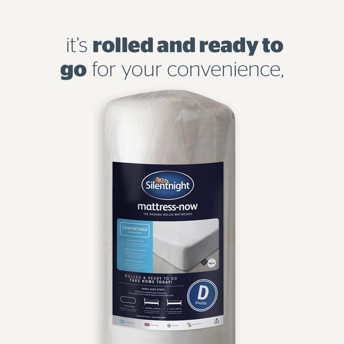 Silentnight's value rolled foam mattress offering all the basics you need for a great night's sleep without breaking the bank. With a high density Miratex foam support system, the Comfortable Foam mattress provides edge to edge support for your entire body, with no roll together and maximised sleeping space. The luxury knitted cover means it's soft to touch as well as being Allergy UK approved, with treatment which reduces moisture, dust-mites and allergens for a fresher and healthier sleep. This mattress is rolled for convenience and easy handling. Please allow up to 48 hours for the mattress to expand to its full depth once unrolled. At Argos Home we want you to get the best night's sleep possible, so we offer a 100 night comfort promise on our mattresses. Try your new mattress for up to 100 nights and if you aren't sleeping soundly, we'll offer you an exchange for one that suits you better. Part of the Mattress-now collection. Medium feel. Foam core mattress. Knit cover with flat top finish. No roll together. Anti allergy. Mattress size W135, L190, D14cm. No-turn mattress. Rotate mattress regularly. Made in the UK. General information: Manufacturer's 5 year guarantee.