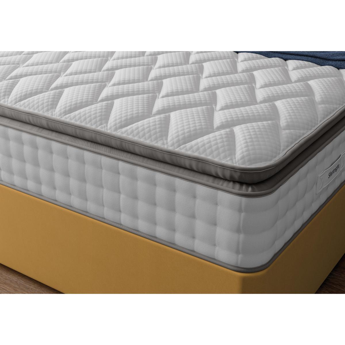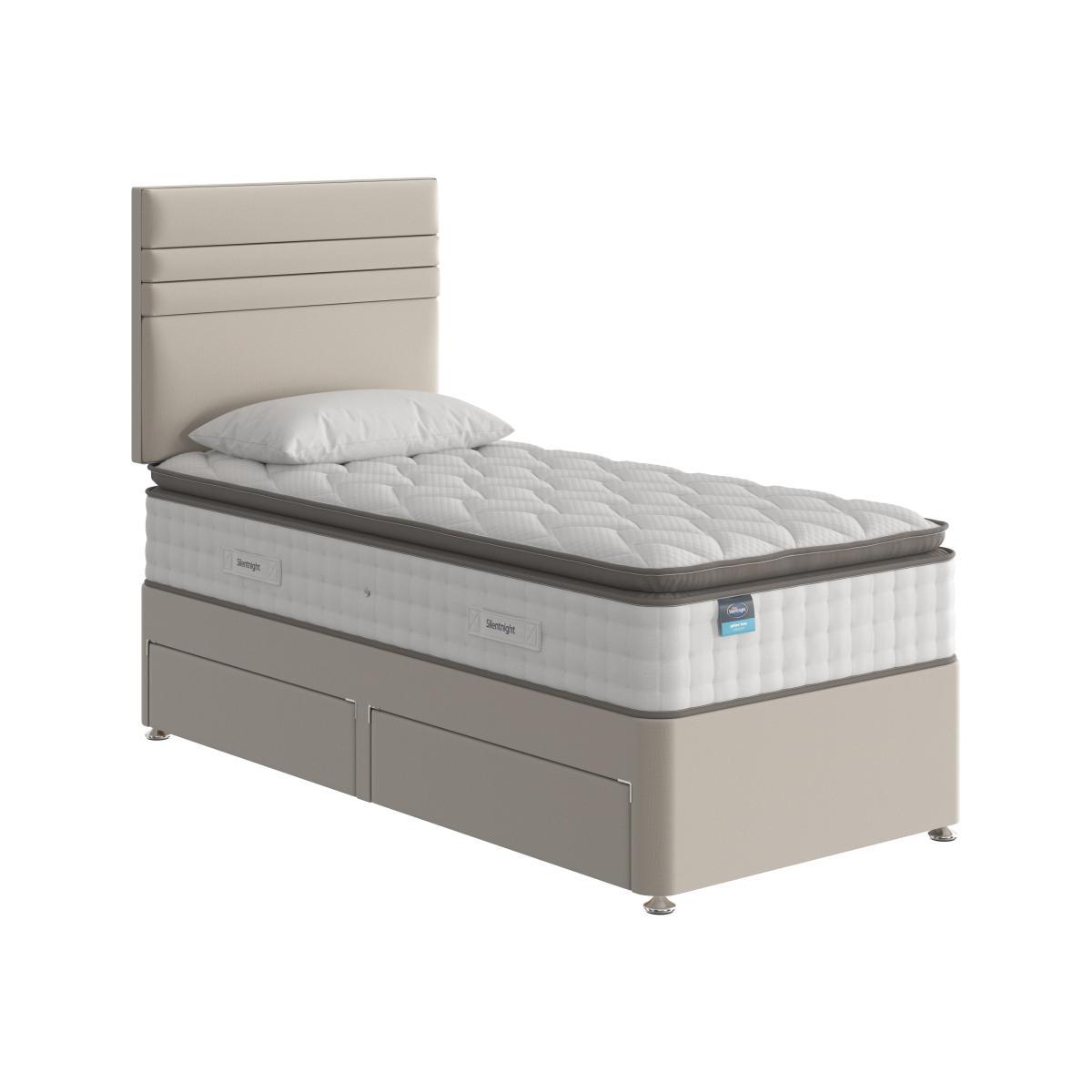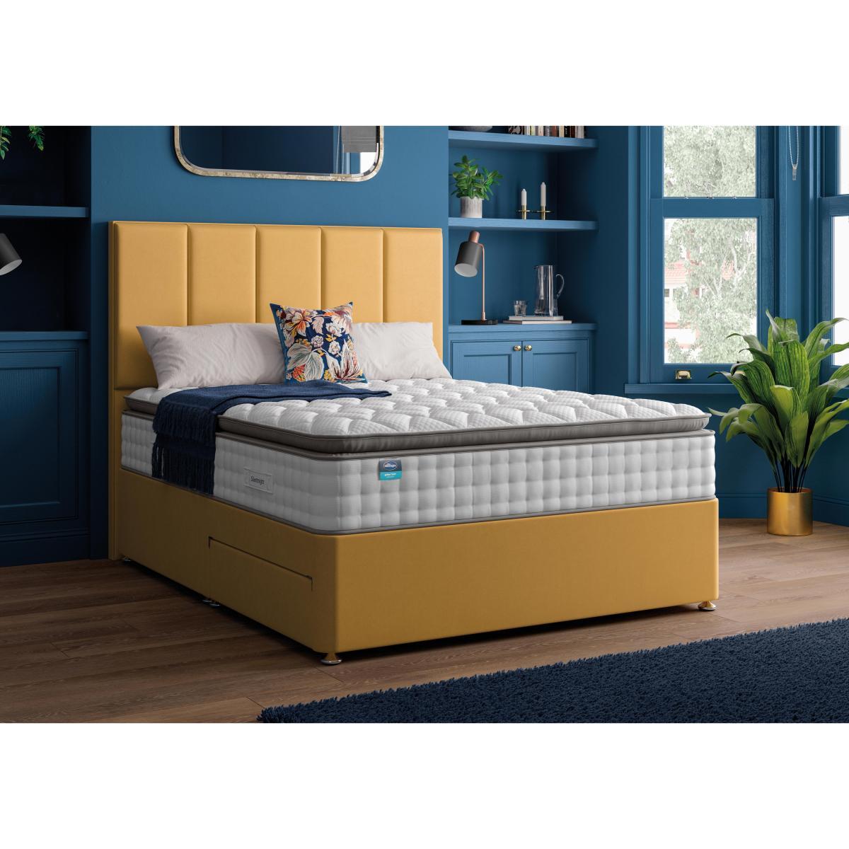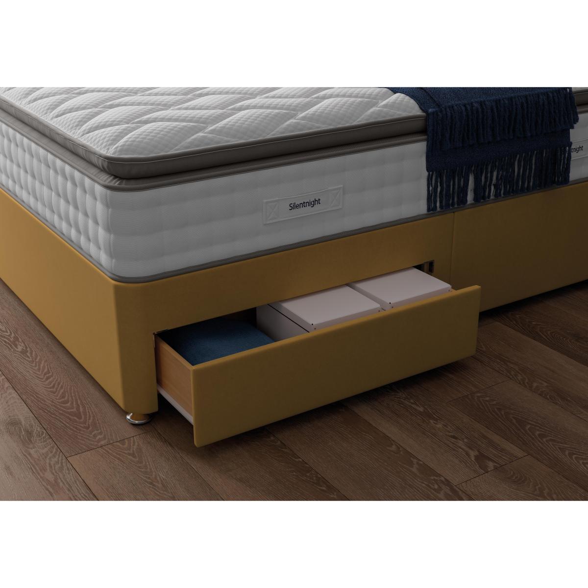 The Silentnight Geltex Luxe 2000 pillow divan includes an ultra-comfortable Pillow Top mattress with pocket springs and cooling Geltex. With useful drawer storage too. Headboard shown available separately. Why you'll love it. Supportive, cooling comfort from Silentnight. At an amazing value price. 2000 responsive pocket springs. Topped with innovative, temperature regulating Geltex. And a microquilted, Geltex filled mattress topper. Geltex draws heat from your body as you sleep. So you stay fresh and cool all night long. A ventilated border promotes airflow. Easy care, non-turn mattress. You only need to rotate it occasionally. Luxury fabric upholstered divan base in a wide choice of colours. With no drawers or drawer storage in a choice of configurations. UK made. A Furniture Village exclusive. What you need to know. Mattress type: Pocket springs with Geltex. Depth: 34cm. Firmness: Medium feel. Springs: 2000 pocket springs. Pillow Top: No. Fillings: Pocket springs topped with temperature regulating Geltex. Borders:Ventilated.li>. Edge to edge support: Yes. Cover: Knitted. Requires turning: No. Sizes: Single, double, king, super king. Type of base: Platform top. Drawer configurations available: 2 drawer, 4 drawer, 2+2 drawer. Double, king and super king divan bases are delivered in two pieces for ease of delivery. Mattress care: Please allow mattress to fully recover before use. It may have a faint odour which will dissipate after airing for 4 hours. Due to the pressure relieving properties of the material it may take some time before you become accustomed to the level of comfort and support. Rotate regularly to minimise settling. We recommend the use of a mattress protector.