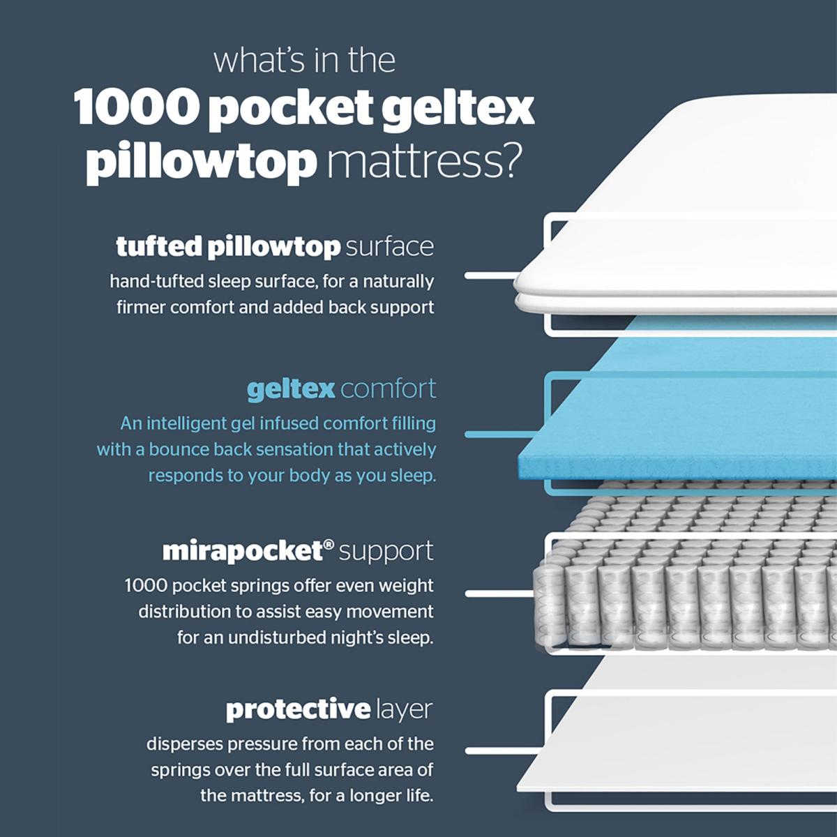 With a Geltex mattress you can twist and turn without waking. And with a Geltex Pillow Top you get an extra layer of comfort. An open-cell structure makes the Geltex comfort layer far more breathable than memory foam. Geltex has been proven to soothe minor aches and pains so you wake up well-rested and ready for anything. Rigorous testing shows that even after eight years your Geltex mattress will perform just as well as it did the day you bought it. The Geltex comfort layer is complemented by our Mirapocket spring unit. 1000 individually responsive springs adjust to your weight for luxurious comfort and tailored support and offer even weight distribution to assist easy movement and improve spinal alignment for an undisturbed nights sleep. Single sided, easy care mattress. Simply rotate head to toe for longevity. For the best comfort, once you have removed it from its packaging, leave your mattress to settle for 24 hours before you sleep on it. Need to throw out your old mattress first? View our information on mattress recycling and collections. * For health and hygiene reasons, we are unable to offer refunds or exchanges on Mattresses unless they are returned unused and in their original packaging. For more information please see our Easy Returns section.