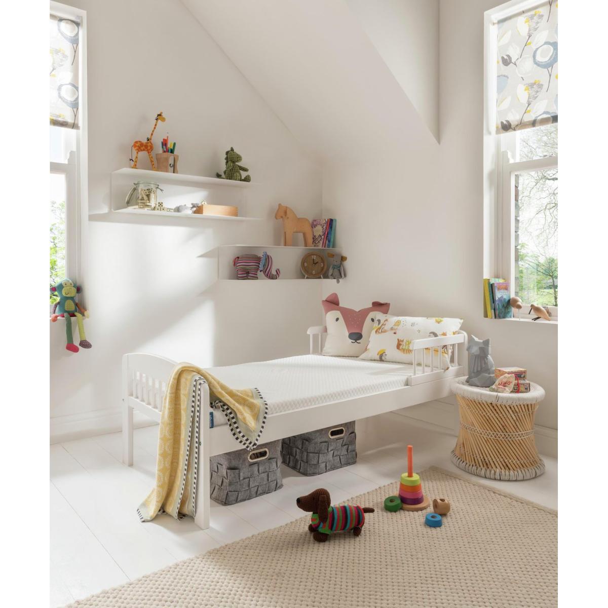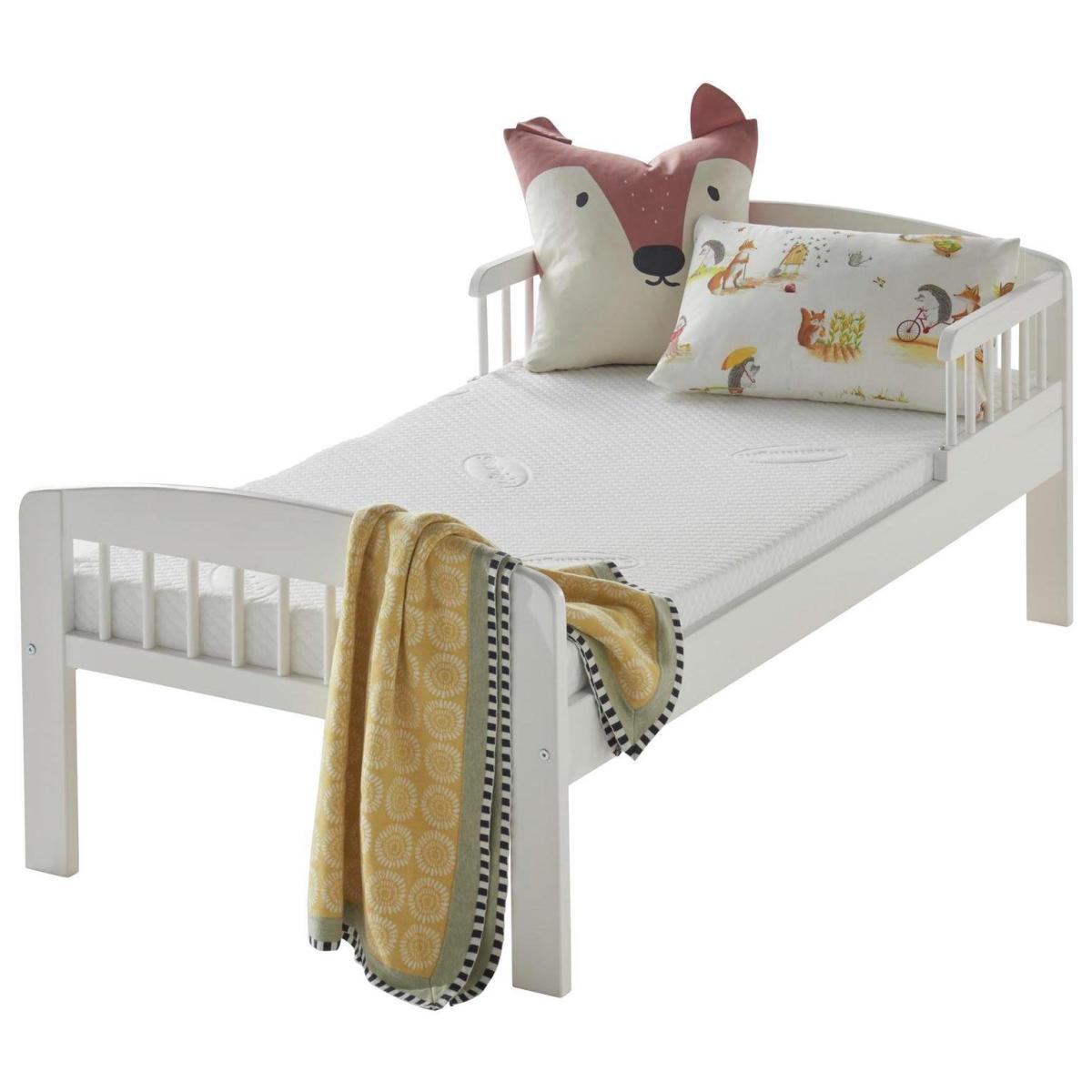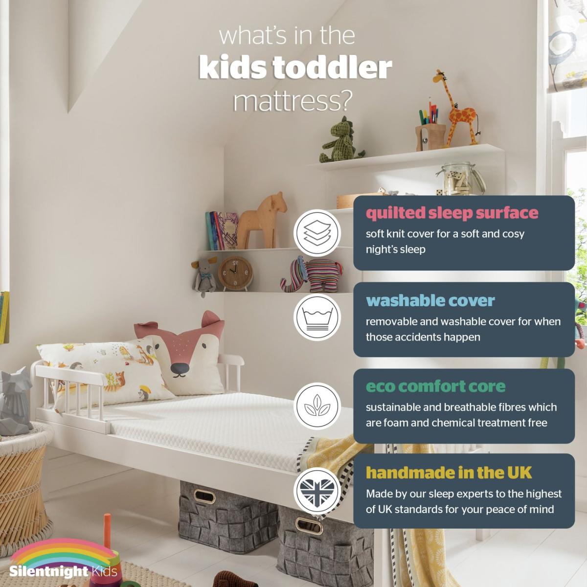 Help your child sleep, learn, rest and play with the Silentnight Healthy Growth toddler mattress. With a foam free core it uses Silentnight's eco-friendly Eco Comfort fibres, made from 100% recyclable plastic bottles, to deliver premium comfort that doesn't harm our planet. It's also extra breathable for a more refreshing, hygienic and super-comfortable sleeping experience. The cover is easy to remove and wash making it simple to deal with those inevitable accidents during the night. This toddler mattress will help your child transition from a cot to a full-sized bed as easily as possible – and make bedtime that little bit calmer. At 70cm x 140cm it can replace a current cot bed mattress but can also be used in fun character beds and is suitable for children aged 18 months to 4 years. Every Healthy Growth mattress that leaves Silentnight's UK factory is free-from FR chemical treatments, containing only clean and odourless fillings for a purer sleeping environment. Silentnight know that sleep is fundamental to every child's ability to grow, rest and recover. They go through so many changes in these early years, so a mattress that supports healthy development is key to your child's mood, memory, physical growth and behaviour. Part of the Healthy Growth collection. Firm feel. Fibre core mattress. Knit cover with quilted finish. Fire retardant. Rotate mattress regularly. Mattress size W70, L140, D10cm. General information: Manufacturer's 5 year guarantee.