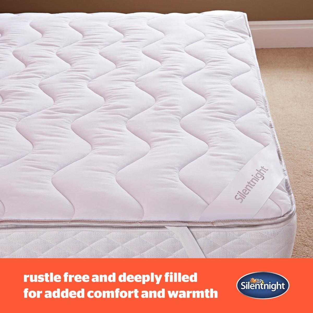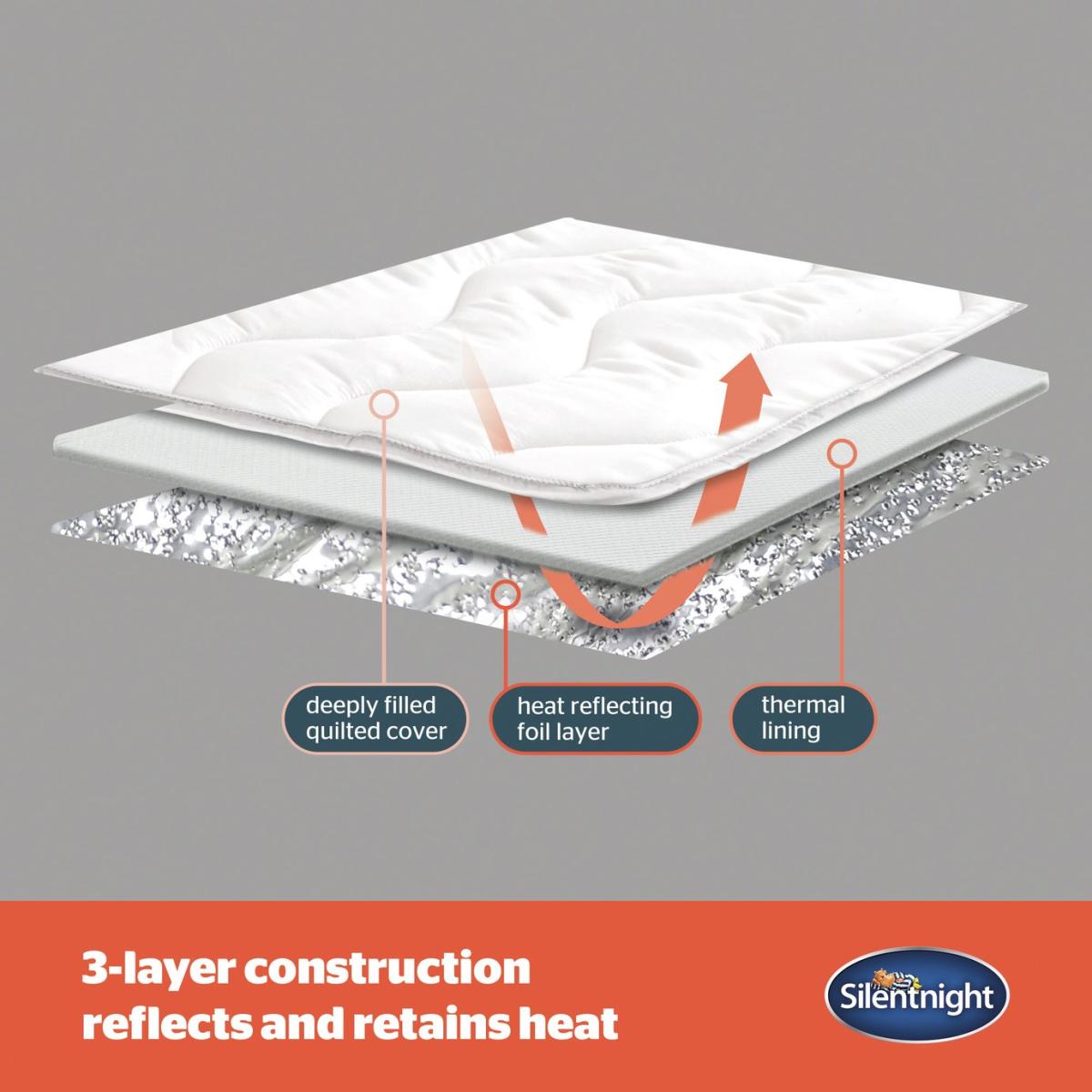 The Silentnight Heat Genie, Self-Heating Mattress Topper features a unique heat reflecting foil combined with a thermal lining and deeply filled quilted top layer to add up to 7.5 tog of extra warmth to your bed. The foil lining helps retains warmth, keeping your bed cosy and warm without the need for electricity, this helps you save money on heating bills. The elasticated straps make this topper easy to fit over your current mattress. The topper is also machine washable which means you can keep your topper feeling fresh and clean for longer. Keep warm for less. A unique 3-layer construction adds 7.5 tog of extra warmth to your bed. Featuring a heat reflecting foil, thermal lining and a deeply filled quilted top. Set includes: 1 Mattress Topper. Suitable for double beds. Size L193, W137, D3cm. Cover made from 100% Polyester. Non woven reverse. 100% Polyester filling. Secured by elasticated corner straps. Cover is machine wash as synthetic at 40. C and suitable for tumble drying.
