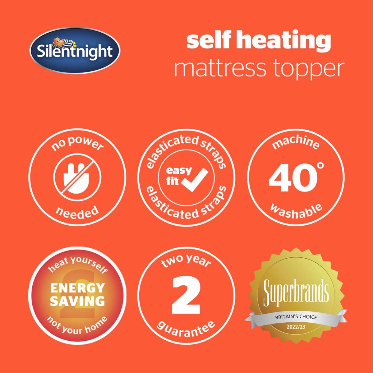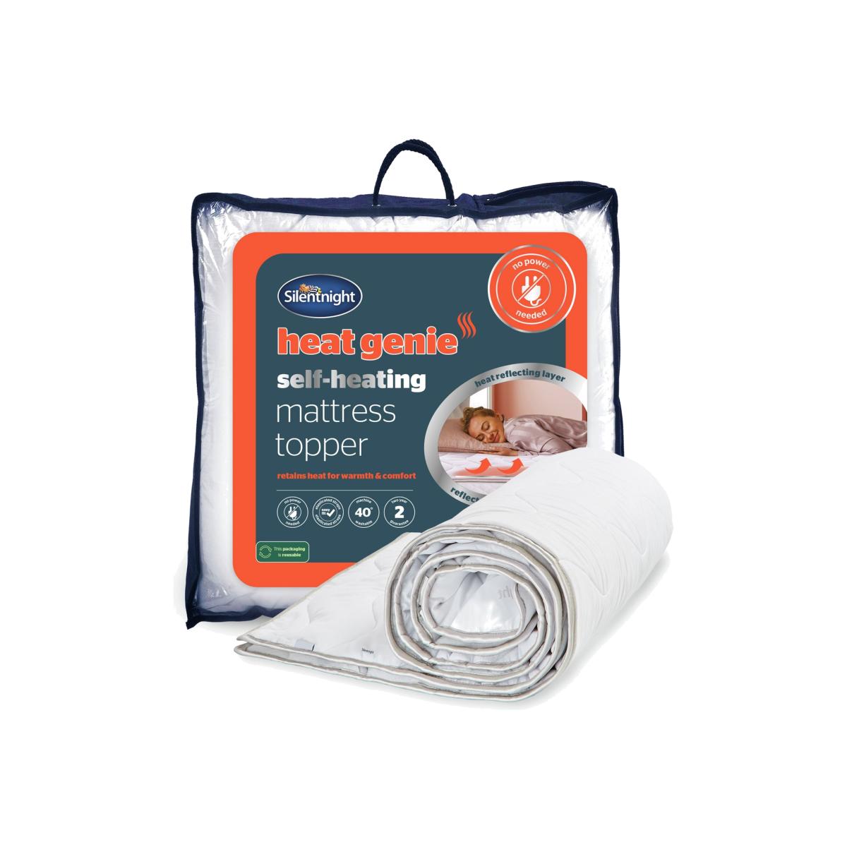The Silentnight Heat Genie, Self-Heating Mattress Topper features a unique heat reflecting foil combined with a thermal lining and deeply filled quilted top layer to add up to 7.5 tog of extra warmth to your bed. The foil lining helps retains warmth, keeping your bed cosy and warm without the need for electricity, this helps you save money on heating bills. The elasticated straps make this topper easy to fit over your current mattress. The topper is also machine washable which means you can keep your topper feeling fresh and clean for longer. Keep warm for less. A unique 3-layer construction adds 7.5 tog of extra warmth to your bed. Featuring a heat reflecting foil, thermal lining and a deeply filled quilted top. Set includes: 1 Mattress Topper. Suitable for single beds. Size L193, W90, D2cm. Cover made from 100% Polyester. Non woven reverse. 100% Polyester filling. Secured by elasticated corner straps. Cover is machine wash as synthetic at 40. C and suitable for tumble drying.