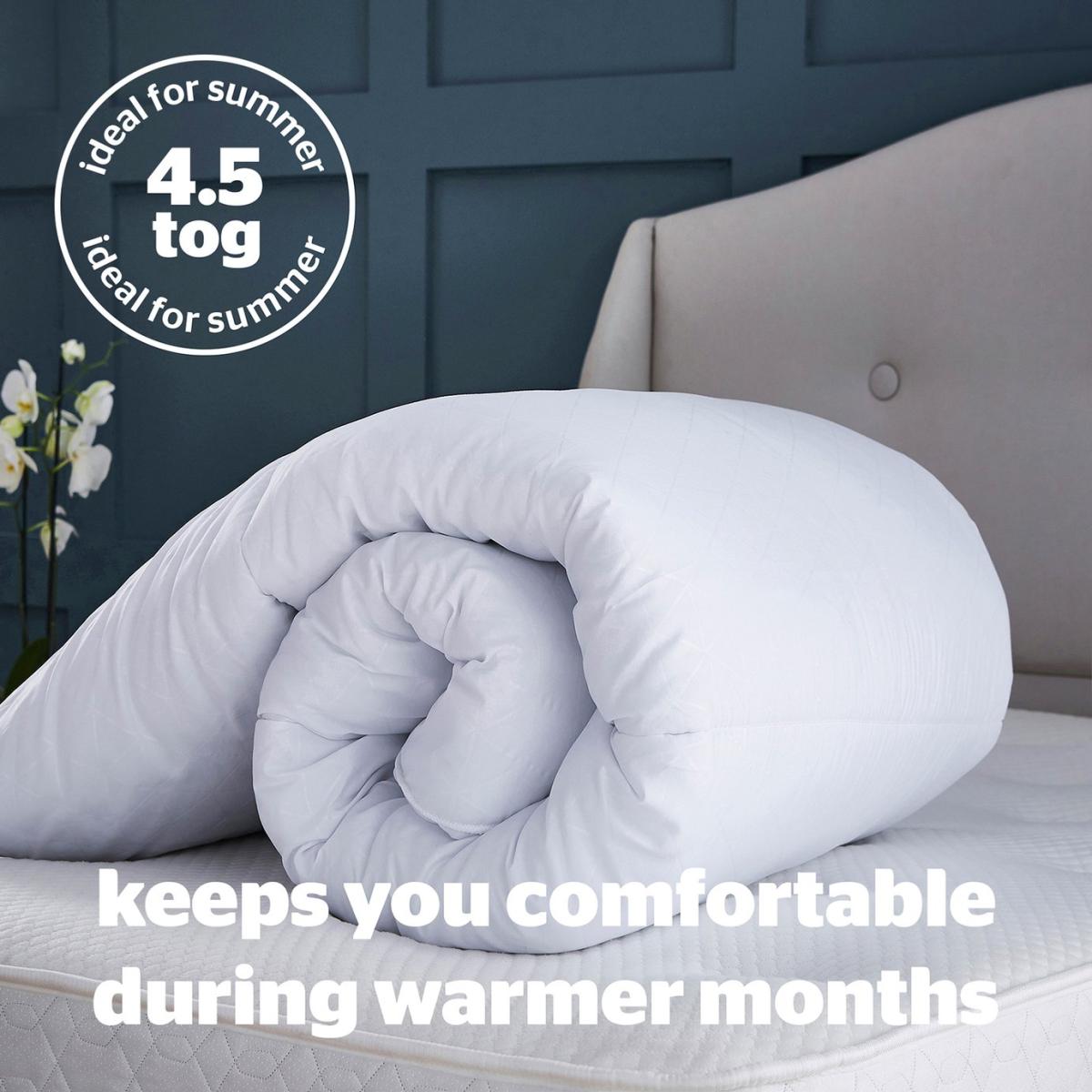 Indulge in the 5 star comfort of a hotel every night with this luxuriously soft and silky boutique style duvet, featuring an elegant embossed finish. The Silentnight Hotel Collection Duvet is encased in a wonderfully stylish and incredibly soft embossed cover and filled with the finest sumptuous fibres for luxurious comfort. The duvet is hypoallergenic which means it is kind to skin and does not include any contents likely to cause allergies. You can keep enjoying hotel quality night after night as it's are fully machine washable. Super king duvet. 4.5 tog duvet. Cover made from 100% polyester. Filling made from 100% polyester. Size L260, W220cm. Machine washable at 40 C. Suitable for tumble drying. Non-allergenic. Manufacturer's 5 year guarantee.