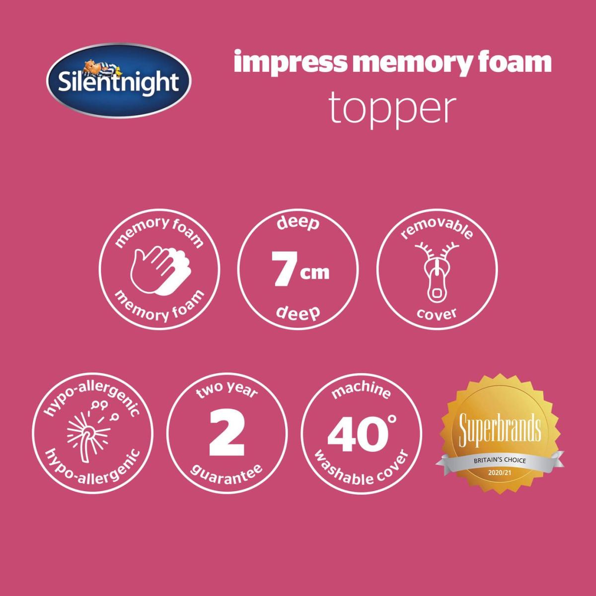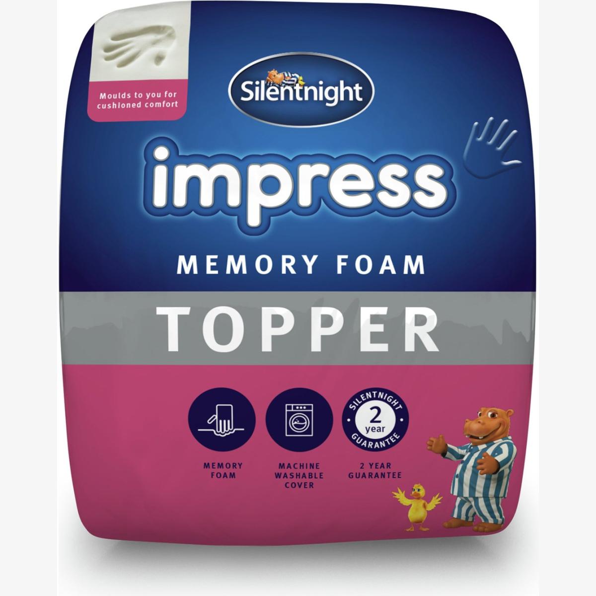 The Impress Memory Foam Mattress Topper by Silentnight has been designed to offer both soothing pressure relief and ultimate comfort. The mattress topper features soft and reactive 7cm deep memory foam that moulds to your unique body shape helping to reduce the pressure points on your spine, giving relief to the muscles and reducing aches and pains. Comes complete with a removable cover that is soft to the touch and will provide exceptional comfort for a perfect night's sleep. Silentnight are the UK's most trusted bed brand with over 75 years' experience in creating products that offer solutions for every sleeper. Set includes:1 x Mattress Topper. Suitable for super king beds. Size L200, W180, D7cm. Cover made from Polyester. Memory Foam reverse. Memory Foam filling. Memory foam. Cover is machine washable covers.