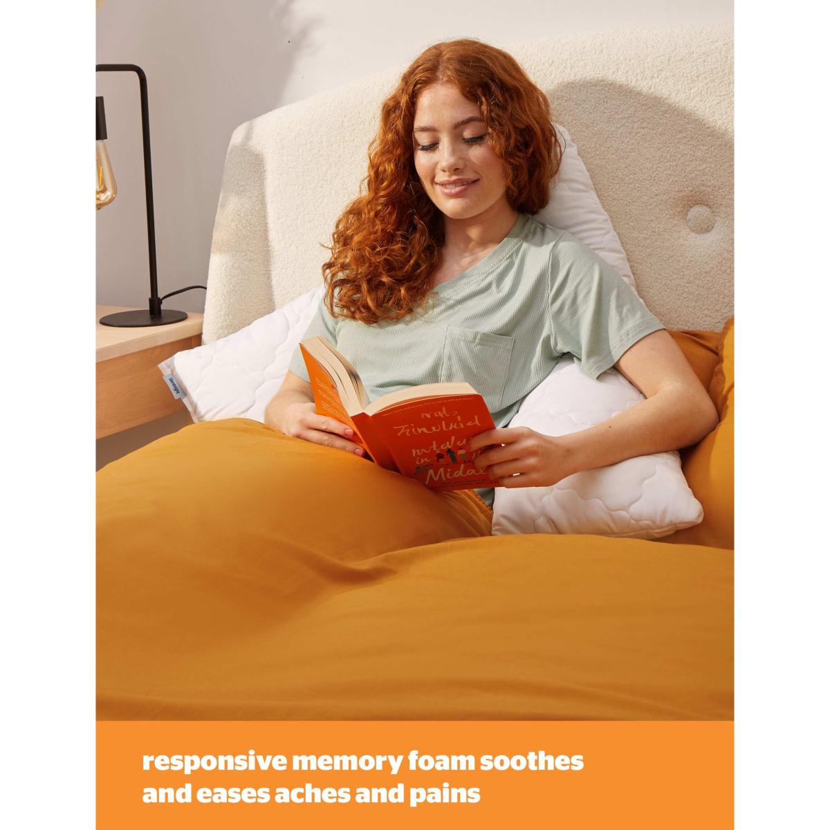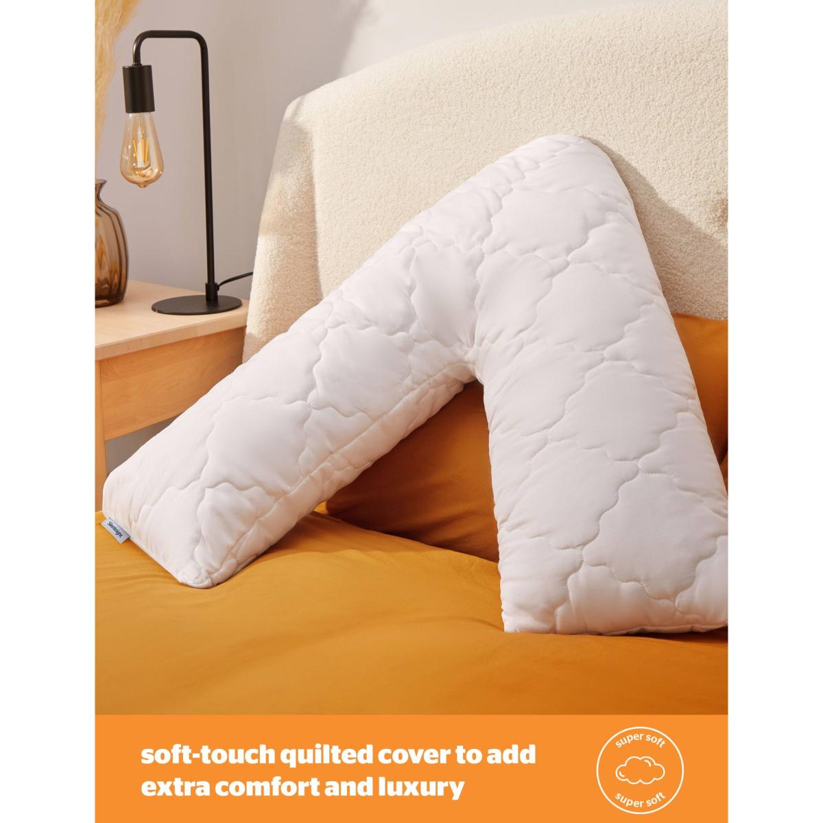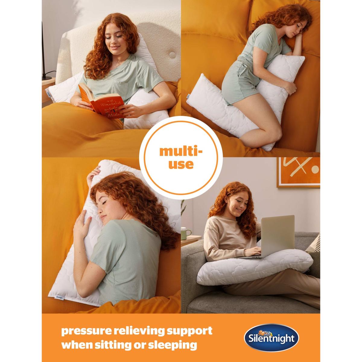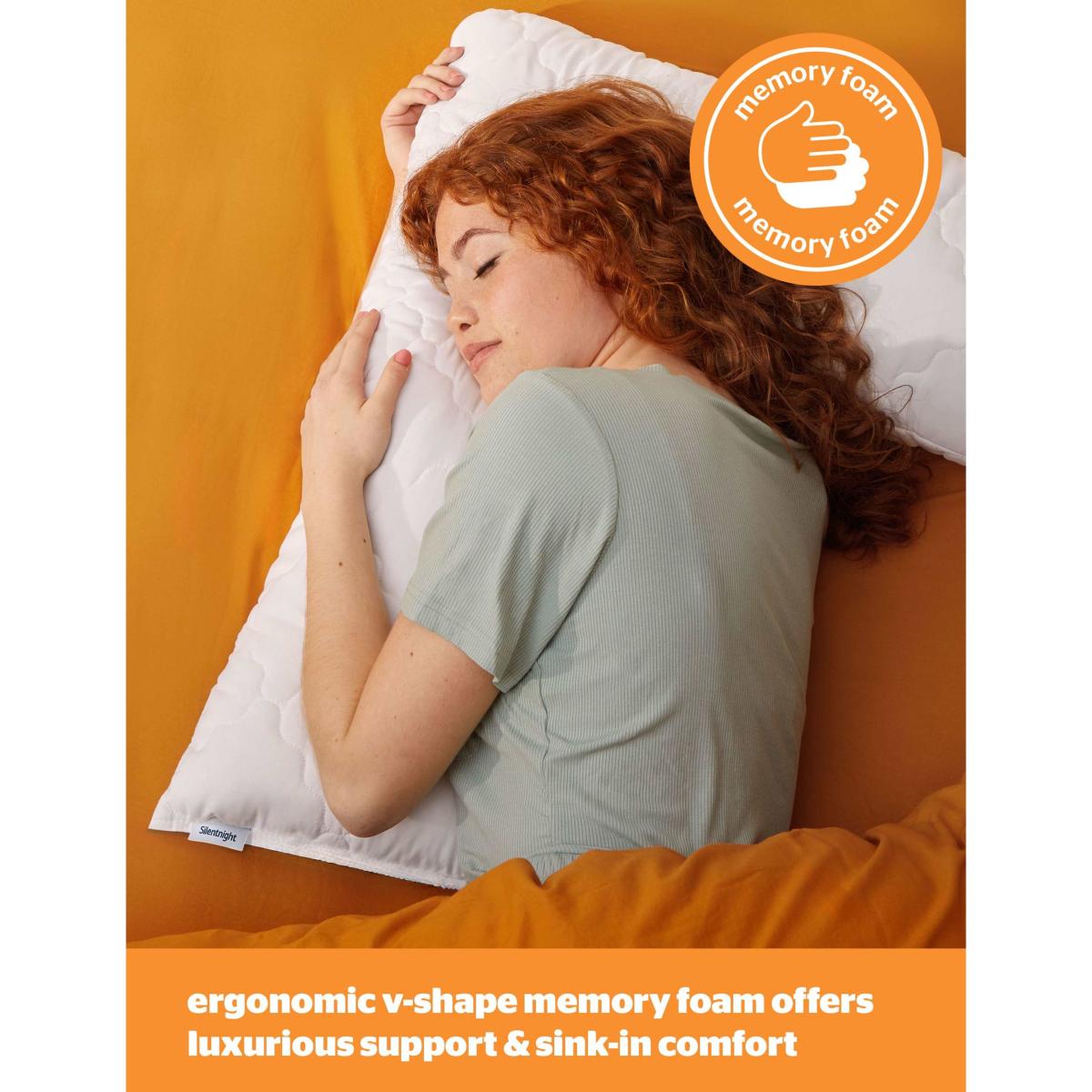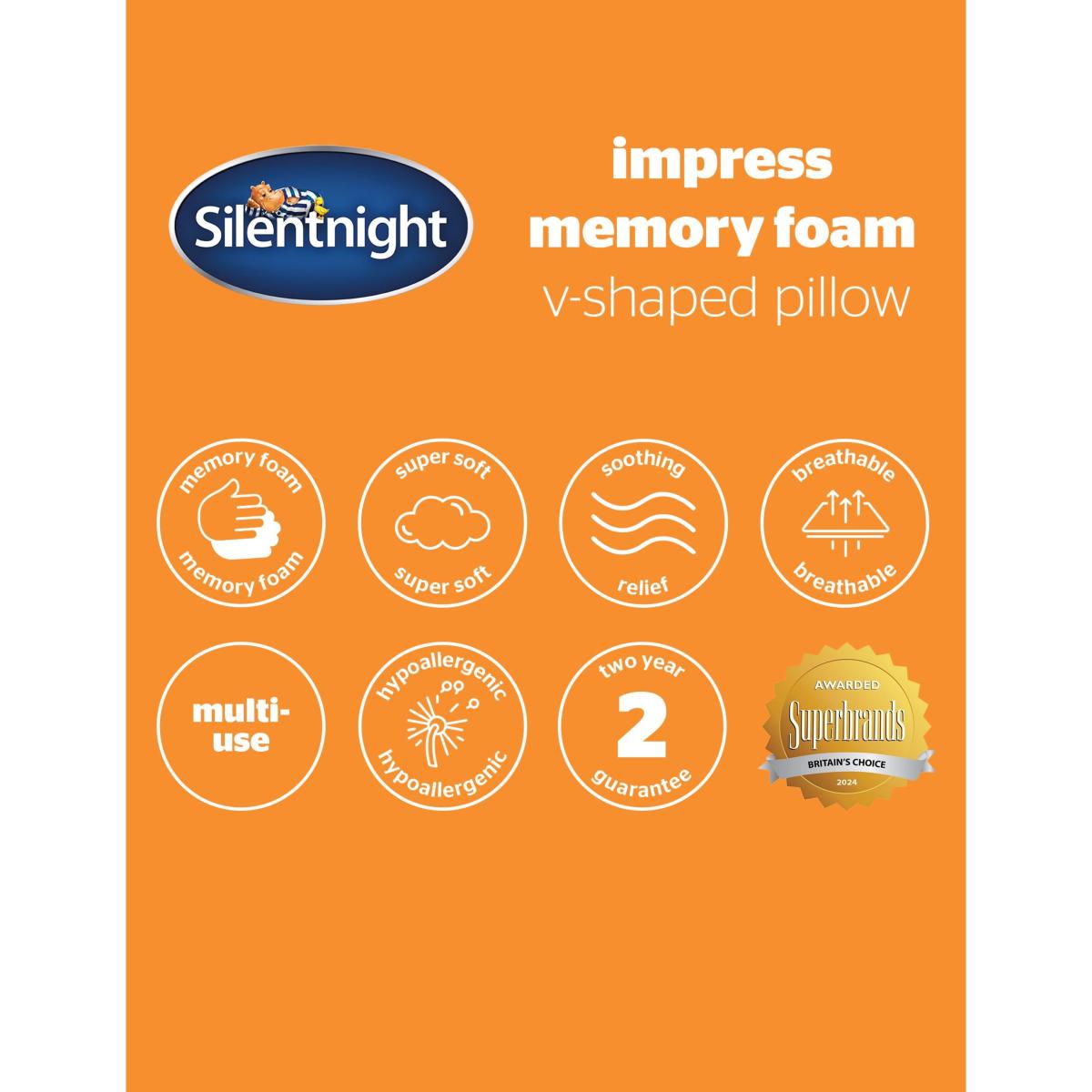 EXTRA SUPPORT & SINK-IN COMFORT:Contoured V-shape memory foam provides luxurious support for your head, back and neck, to increase comfort whilst you sleep or relax. SOOTHING RELIEF:Soothes and eases aches and pains by relieving pressure thanks to responsive memory foam fill and therapeutic ergonomic design. BREATHABLE MEMORY FOAM:All the benefits of luxury memory foam, with added breathability. The premium shredded memory foam filling allows air to move more freely inside your pillow than a standard memory foam block. Providing responsive support and breathable comfort. QUILTED COVER:Soft-touch quilted cover to add extra comfort and luxury. MULTI-USE: Sleep, relax or sit back for comfort your way. Suitable for back support, sleeping in multiple positions, post-surgery recovery, nursing and pregnancy and for orthopaedic use. HYPOALLERGENIC:This product does not contain any materials likely to cause allergies. The Silentnight Impress Memory Foam V Shape Pillow is uniquely designed to provide extra support where you need it the most. The shape of the pillow ensures that your head, neck and shoulders are fully supported to relieve pressure. Filled with luxurious, breathable and responsive shredded memory foam that moulds to the contours of your head and neck for soothing sink-in comfort. The pillow can also be used in multiple ways; it provides extra support while you sleep, or it can be used while you are sat upright watching television or reading.