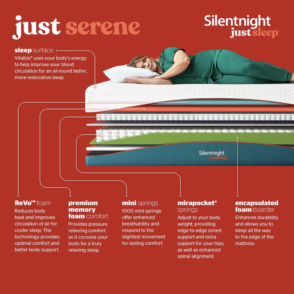A relaxed, refreshed nights sleep is only a click away. Our Just Serene mattress relieves pressure and supports your spine, complemented by our body-moulding memory foam comfort layer. Sink in to energy absorbing memory foam while our 1000 zoned springs support in all the right places. Features breathable fabric borders, allowing air to flow. Our Just Serene mattress sleep surface is finished with a soft-knit fabric which is hypoallergenic The Just Serene mattress is also rolled for convenience and easy to get up staircases. Responsive Memory foam gently moulds to your body's contours, absorbing energy and relieving built up pressure as you sleep. The 1000 individually responsive pocket springs in this mattress conform and adjust to your body weight, providing edge-to-edge zoned support and extra support for your hips, as well as enhanced spinal alignment. We've made sleep easier than ever. Designed with ease and convenience in mind and with fast delivery, our Just Serene mattress comes rolled and wrapped so you can easily take it to your room of choice. Our 10 year guarantee on all of our Just Sleep mattresses allows you the peace of mind you need to sleep easily. Part of the Just Sleep collection. Medium soft feel. Pocket sprung with memory foam layer mattress with 1000 springs. Knit cover with flat top finish. No roll together. Mattress size W150, L200, D29cm. No-turn mattress. Rotate mattress regularly. Made in the UK. Rolled mattress. General information: Manufacturer's 10 year guarantee.