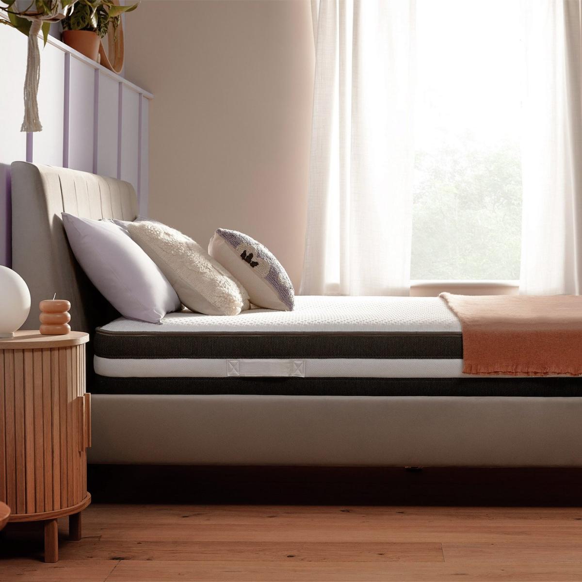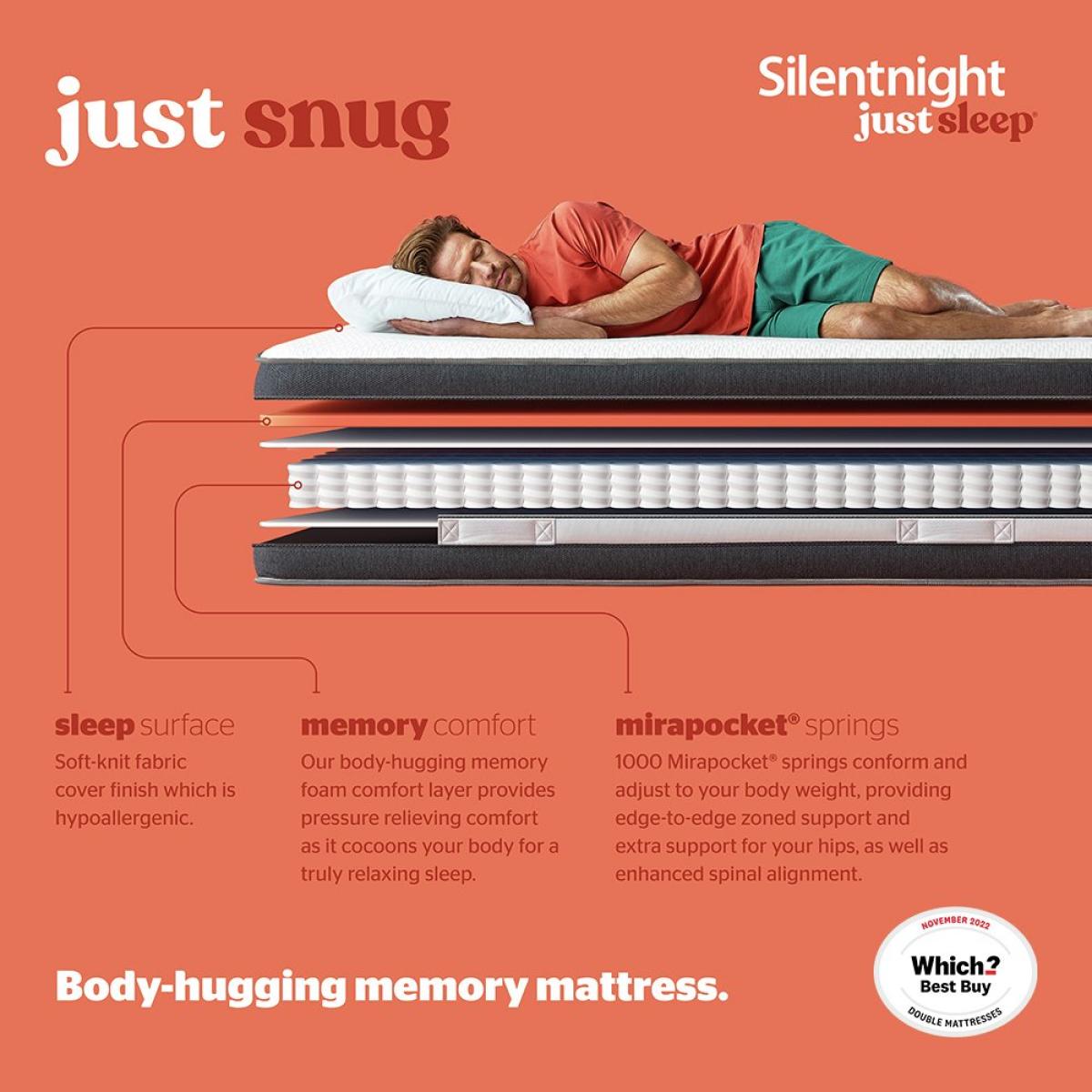 Our Just Snug mattress relieves pressure, and supports your spine, ensuring you experience your most comfortable night's sleep yet. The responsive Memory foam gently moulds to your body's contours, absorbing energy and relieving built-up pressure as you sleep, while the 1000 individual responsive pocket springs respond to your movements, resulting in premium comfort that's tailored to you. Finished with a soft-knit fabric which is hypoallergenic, plus it's rolled for convenience and easy to get up staircases. The 1000 individually responsive pocket springs in this mattress conform and adjust to your body weight, providing an edge-to-edge sleep surface and extra support for your hips, as well as enhanced spinal alignment. Working independently, the spring unit distributes weight evenly whilst responding to your movements throughout the night, resulting in premium comfort that's tailored to you. Which? Best Buy award winner November 2022. Designed with ease and convenience in mind and with fast delivery, our Just Snug mattress comes rolled and wrapped so you can easily take it to your room of choice. Our 10 year guarantee on all of our Just Sleep mattresses allows you the peace of mind you need to sleep easily. Part of the Just Sleep collection. Medium firm feel. Pocket sprung with memory foam layer mattress with 1000 springs. Knit cover with flat top finish. No roll together. Mattress size W150, L200, D25cm. No-turn mattress. Rotate mattress regularly. Made in the UK. Rolled mattress. General information: Manufacturer's 10 year guarantee.