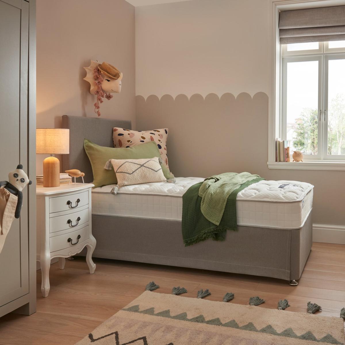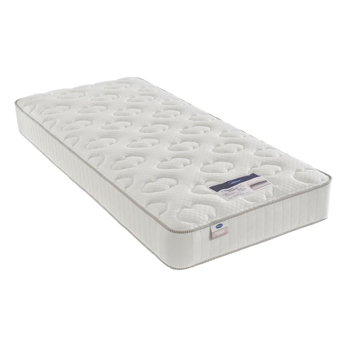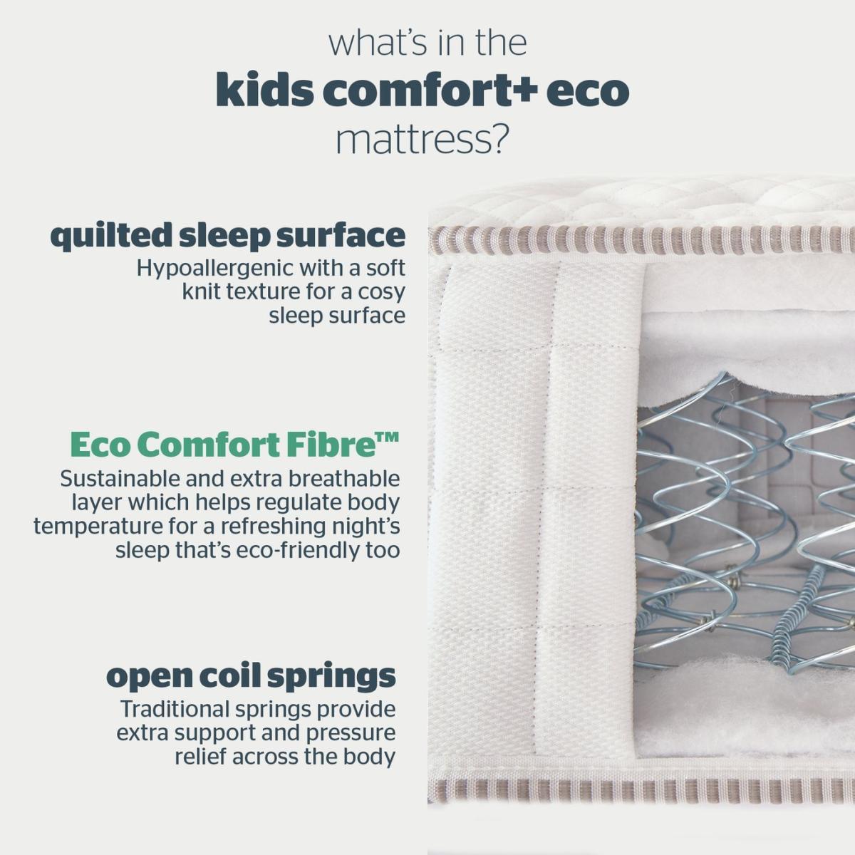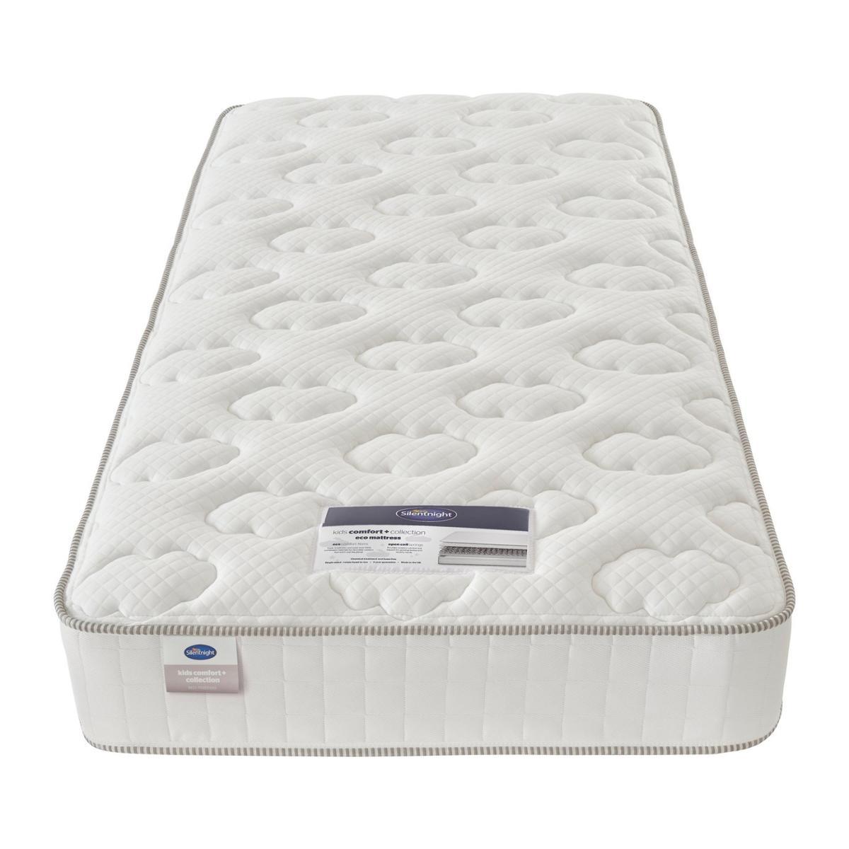 Designed to offer premium comfort and support, the Comfort+ Eco mattress supports your child's growing body as they sleep. Safer for them and kinder to the environment, Eco Comfort Fibres ensure the free flow of air to reduce moisture build-up and help regulate body temperature, for a more breathable night's sleep. Together with the open coil spring system, the mattress is zoned to help healthily align the spine as they grow and provide full body support from head to toe. Finished with a soft knit cover for a super snug, cloud-like feel. Helping to protect your children from common nasties, the mattress is hypoallergenic which reduces the effects of allergy triggers including dust mites, mould and bacteria. This mattress is not suitable for top of bunk. The Comfort+ range is suitable for kids who are choosing their first mattress or pre-teen mattress, supporting their growing bodies at each stage. Handmade by our sleep experts in the heart of the UK. Part of the Silentnight Comfort+ collection. Medium firm feel. Open coil mattress with 325 springs. Knit cover with quilted finish. No roll together. Fire retardant. Anti allergy. Rotate mattress regularly. Mattress size W90, L190, D23.5cm. General information:Manufacturer's 5 year guarantee.