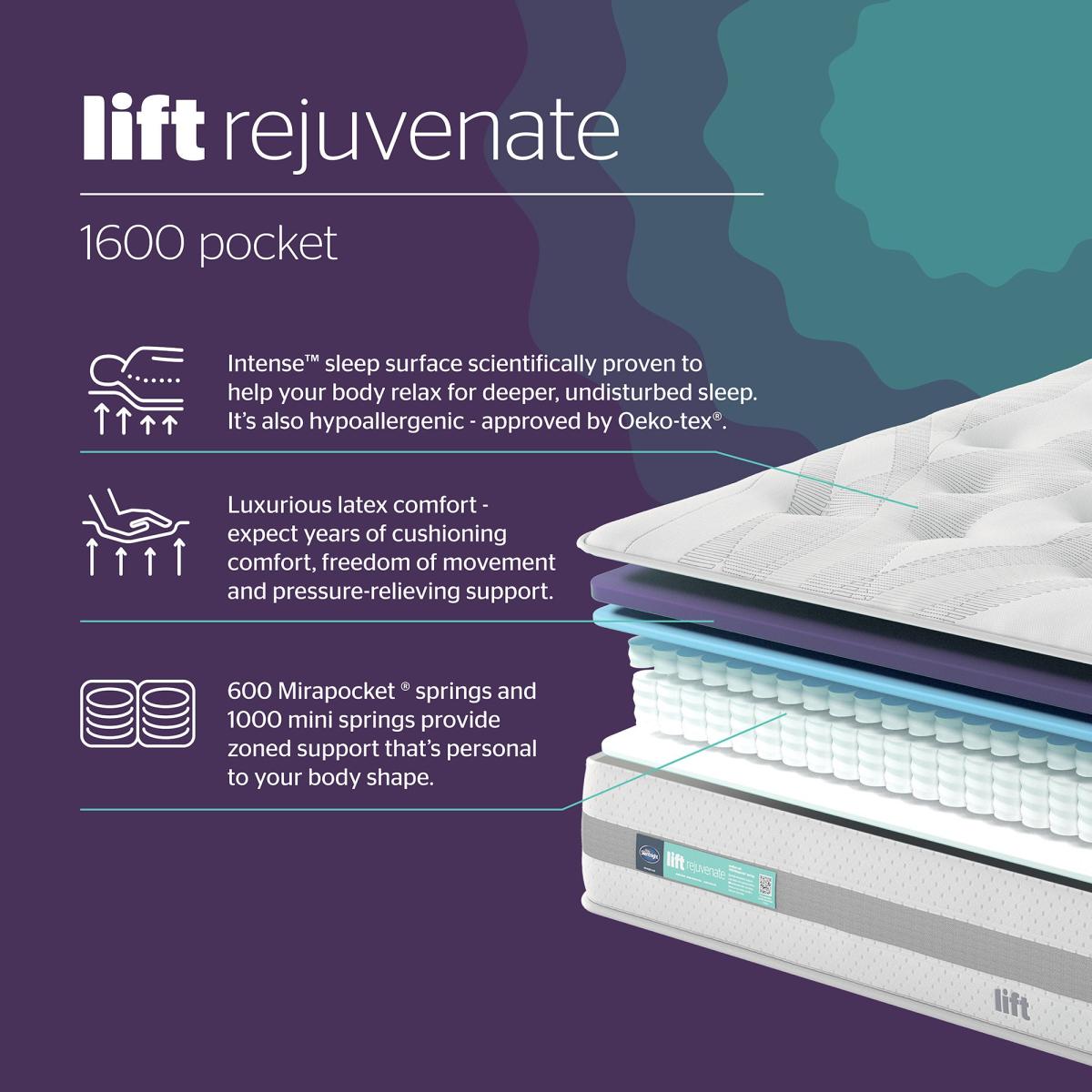 The mattress that keeps you going and going and going. Silentnight's Lift Rejuvenate mattress features their Intense™ sleep surface, scientifically proven to help your body relax for deeper, undisturbed sleep. Paired with latex comfort, 1000 mini springs and 600 Mirapocket springs offering back-saving pressure relief and optimal spinal alignment. Deeper, undisturbed sleep Silentnight's scientifically proven Intense™ fabric technology has been woven into the sleep surface, to help your body relax for deeper, undisturbed sleep. Approved by Oeko-tex and FR chemical treatment free, offering a cleaner, fresher night's sleep. Luxurious latex comfort Expect years of cushioning comfort, freedom of movement and pressure relief. Latex is a plush, adaptive material that responds to your body shape and moves when you do, so your weight is evenly distributed as you sleep, helping to relieve pressure and soothe aches and pains for individualised, ideal comfort. Back-saving spinal support Featuring a unique combination of 1000 mini and 600 Mirapocket springs, this mattress adjusts to your movements throughout the night, resulting in tailored support that’s personal to your body shape and giving you extra support to your hips and shoulders. Need to throw out your old mattress first? View our information on [mattress recycling and collections](https://www. dunelm. com/info/about/mattress-and-furniture-recycling).