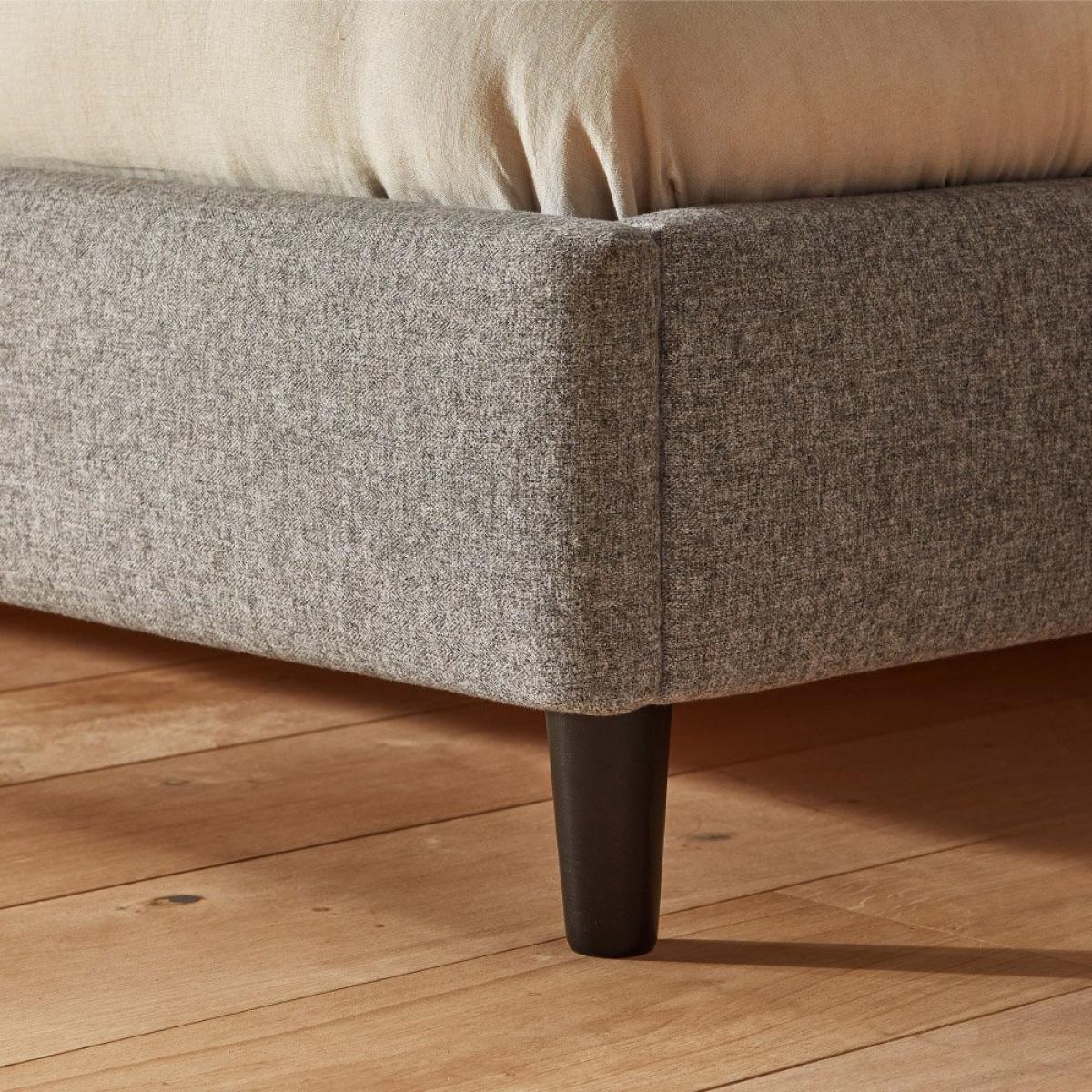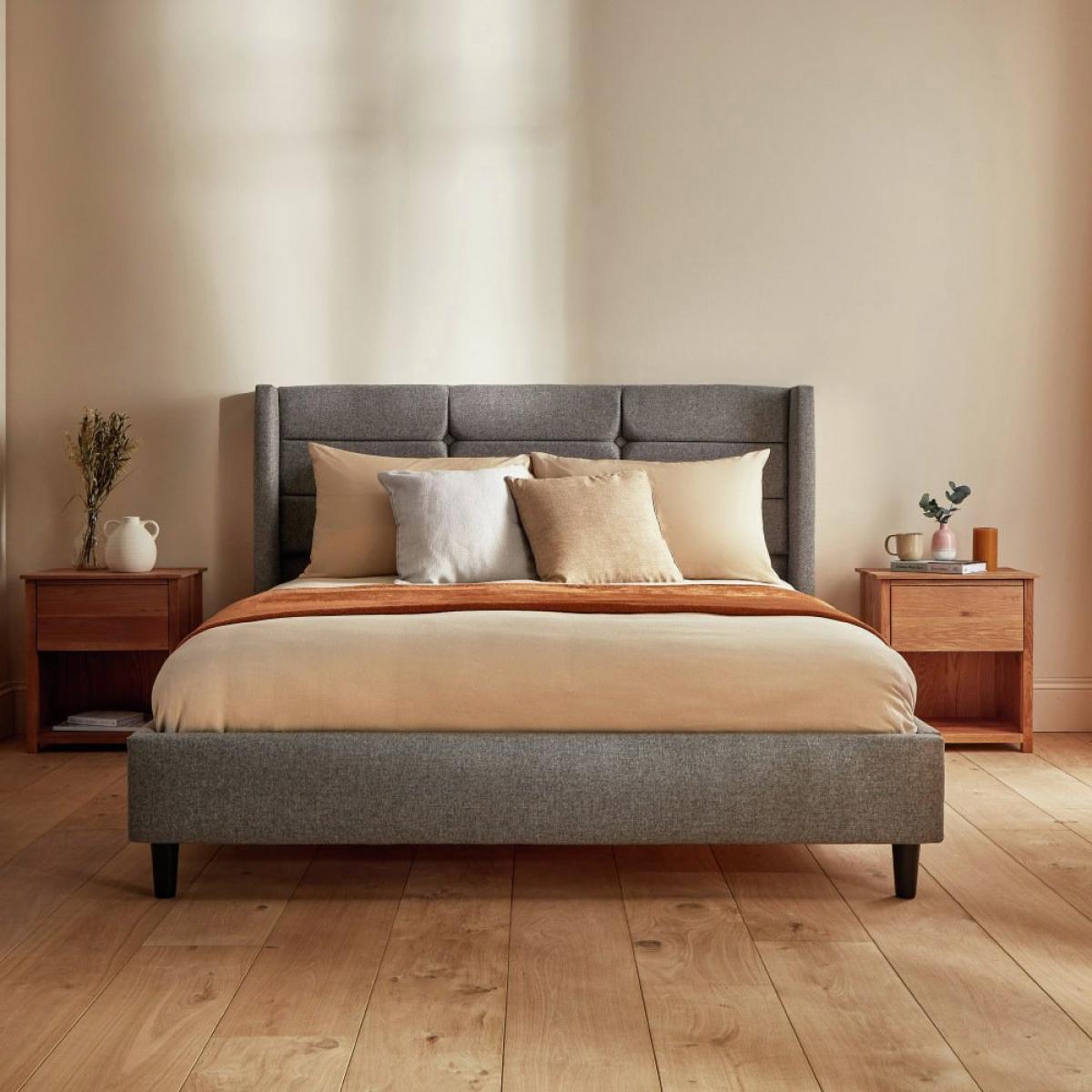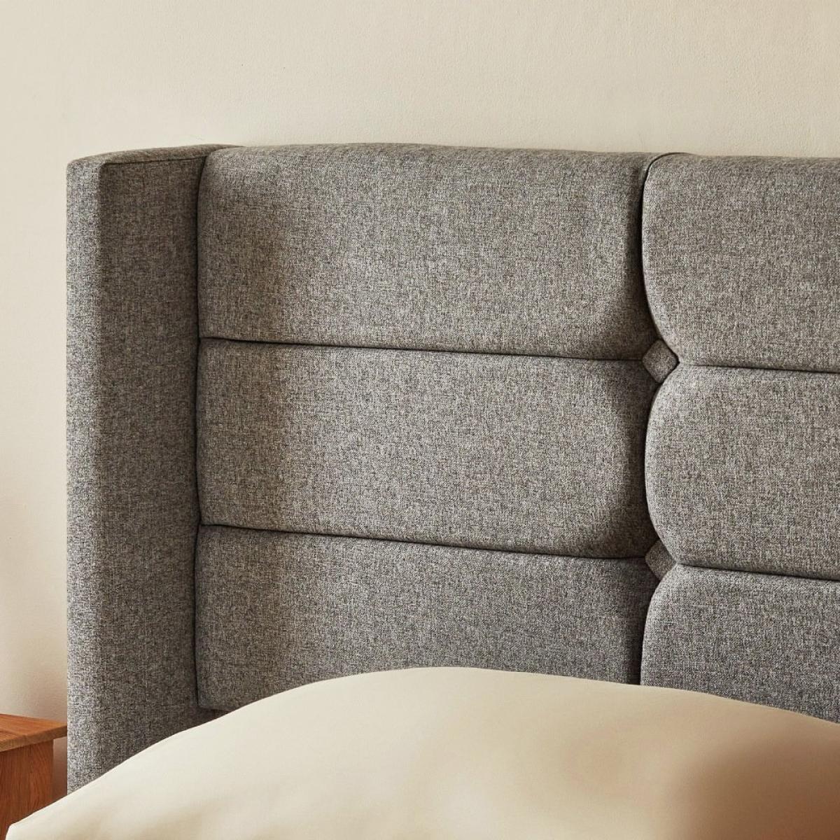 Finesse meets grace in the Lilith upholstered bedframe. Carefully crafted padding paired with exaggerated wings bring opulence to your bedroom. Handcrafted here in the UK, the bed is upholstered in a choice of natural woven textured fabrics, perfectly suited to add softness to any bedroom. The sumptuous, padded headboard adds a contemporary feel whilst ensuring optimum comfort. Complete with wooden legs, the Lilith makes a bold addition to your bedroom. Adjustable side rails can be rotated to accommodate a deep or shallow mattresses. Whilst the wooden slatted base provides excellent mattress support and airflow. Our made to order furniture service means you can choose from different options, such as fabric, size and shape to create a beautiful bespoke piece of furniture. Because this piece is designed just for you, you might notice the delivery time is a little longer than usual. Choose from our traditional flat woven charcoal fabric, durable and long lasting or the new tweed woven Pebble, a herringbone style perfect to create a traditional country chic look. Part of the Lilith collection. Upholstered frame. Herringbone fabric - 100% polyester. Wooden feet. Base with wooden slats. No storage. Size W163.5, L215.5, H32.5cm. Total maximum user weight 220kg. Self-assembly - 2 people recommended. Package Dimensions: Package 1 dimensions: H102, W175, D22.5cm. Package 1 weight: 29kg. Package 2 dimensions: H25, W24, D223cm. Package 2 weight: 30.5kg. Package 3 dimensions: H29, W152, D8.5cm. Package 3 weight: 15.5kg. General Information: By choosing FSC certified products, you are supporting responsible management of the world's forests. Manufacturer's 5 year parts and labour guarantee.