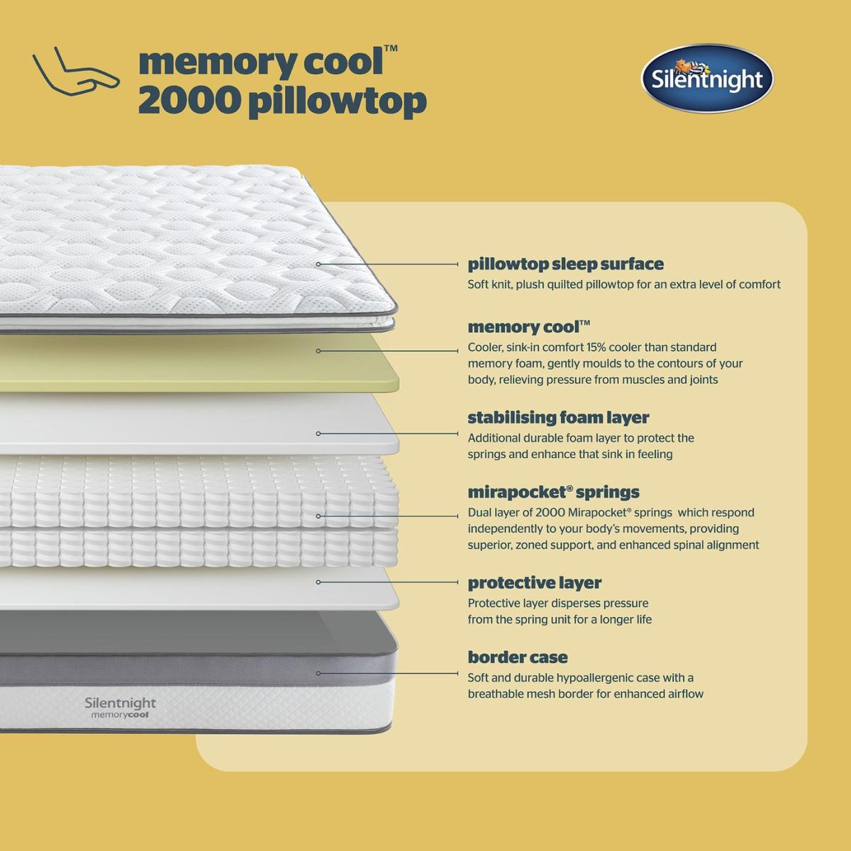 Sink into comfort, stay cooler all night with the Silentnight Memory Cool 2000 Pillowtop. Memory Cool gently contours to your body, easing pressure on joints and offering a soothing weightless feel as you drift off. Graphite infused particles within the foam absorb and dissipate heat, allowing you to stay 15% cooler than standard foam. A dual layer of 2000 Mirapocket springs offers zoned support and enhances spinal alignment. Finished with a plush pillowtop for extra softness, this mattress delivers cool, supported sleep - night after night. Our advanced graphite infused Memory Cool moulds perfectly to your body, relieving pressure and absorbing energy, all while actively transferring heat away to create a sleep environment 15% cooler than standard memory foam for a more restful night's sleep. The sink in nature of Memory Cool prevents excessive movement during sleep and reduces roll together, minimising partner disturbance and providing undisturbed sleep night after night. The unique zoned spring system of the 2000 Mirapocket support unit keeps you comfy, supported, and uninterrupted, all night. Its head-to-toe spring alignment reduces partner disturbances, and the parallel spring design provides support all the way to the edge. So, you can both enjoy a spacious, undisturbed sleep. Medium feel. Pocket sprung with memory foam layer mattress with 2000 springs. Knit cover with deep quilt finish. No roll together. Mattress size W90, L190, D31.5cm. Mattress Weight 26kg. No-turn mattress. Rotate mattress regularly. Made in the UK. Package Dimensions: Package 1 dimensions: H190, W90, D31.5cm. General information: By choosing FSC certified products, you are supporting responsible management of the world's forests. Manufacturer's 5 year guarantee.