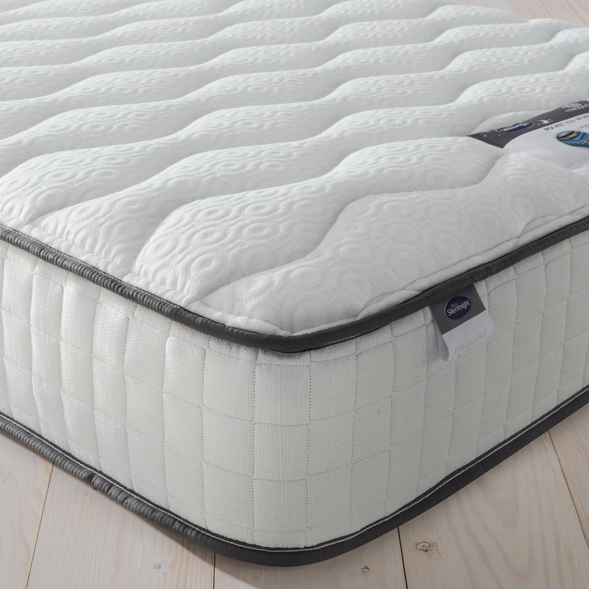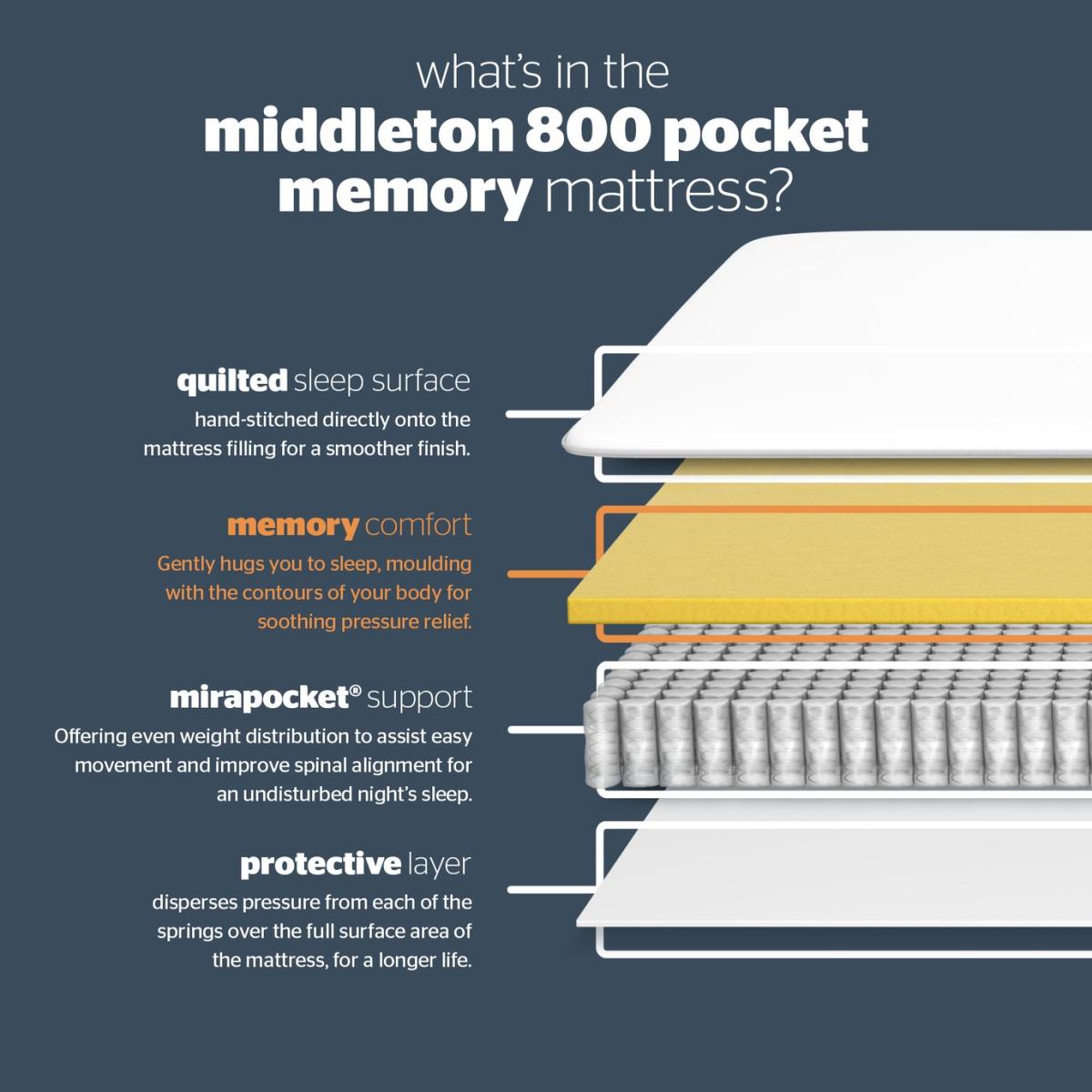 The Silentnight Middleton Memory is an 800 pocket sprung mattress with a medium firm feel; great for protecting the back, but not too firm so you can still sink into sleep with comfort. Featuring a layer of body moulding memory foam that responds to your temperature and spreads weight evenly, to offer perfect pressure relief and cocooning comfort. This mattress is finished with a soft knit cover for added comfort through the night. Made here in the UK, it's easy care, meaning there's no need for turning and it will last for years to come. The memory foam in this mattress allows you to gently sink into blissful slumber while the 800 individually responsive pocket springs help with no roll together meaning you won't disturb a sleeping partner when you move around in the night. All Silentnight products are hypoallergenic for healthier sleep. At Argos Home we want you to get the best night's sleep possible, so we offer a 100 night comfort promise on our mattresses. Try your new mattress for up to 100 nights and if you aren't sleeping soundly, we'll offer you an exchange for one that suits you better. Part of the Middleton collection. Medium firm feel. Pocket sprung with memory foam layer mattress with 800 springs. Knit cover with quilted finish. No roll together. Anti allergy. Mattress size W150, L200, D26cm. No-turn mattress. Rotate mattress regularly. Made in the UK. General information: Manufacturer's 5 year parts and labour guarantee.