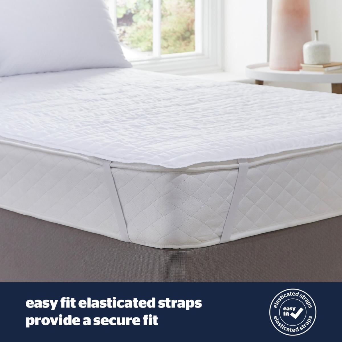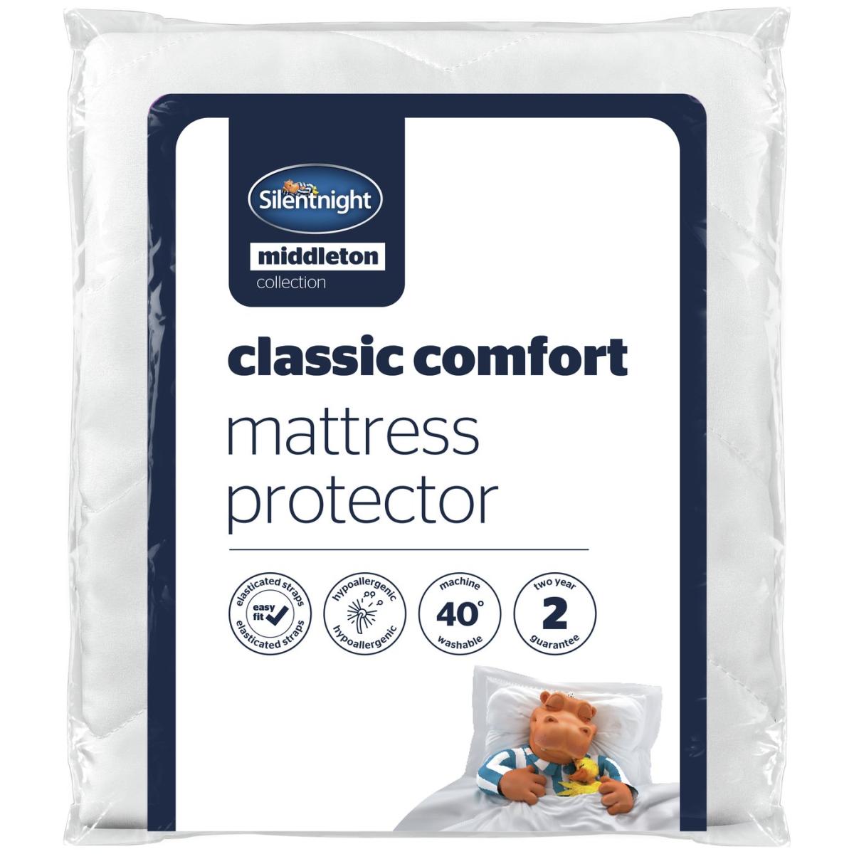 The Middleton Collection Classic Comfort Mattress Protector shields against dust mites and effectively protects your mattress from wear and tear. Generously filled with signature fibres, the protector keeps your bed feeling comfortable and fresh and features easy fit straps for a secure fit. This product comes with a 2-year manufacturer's guarantee and is hypoallergenic and machine washable. Silentnight are the UK's most trusted sleep brand with over 75 years' experience in creating products that offer solutions for every sleeper. The elasticated straps fit securely to your mattress. Fits all mattress depths. Suitable for single beds. 100% Polyester cover. 100% Polyester filling. Secured by elasticated corner tapes. Size L193, W90cm. Machine wash as synthetic at 40 C. Suitable for tumble drying.