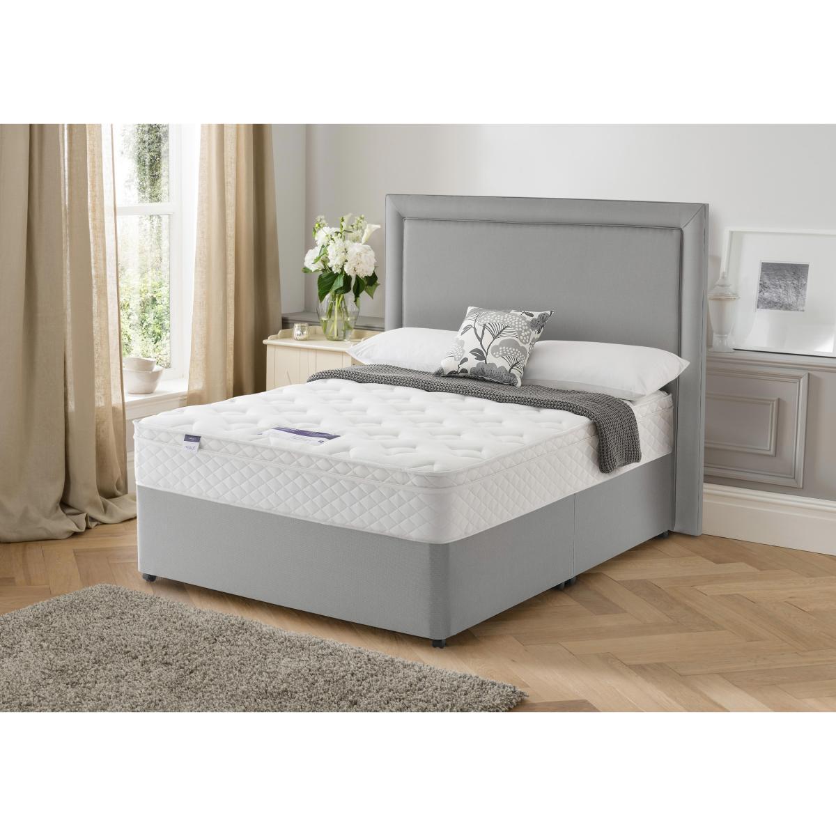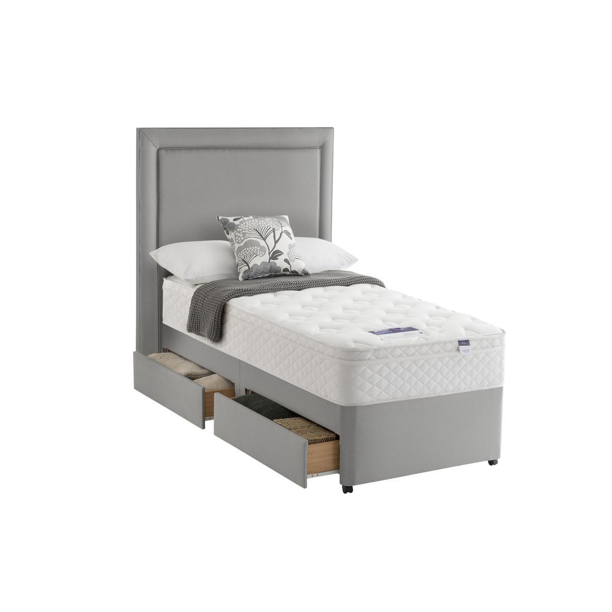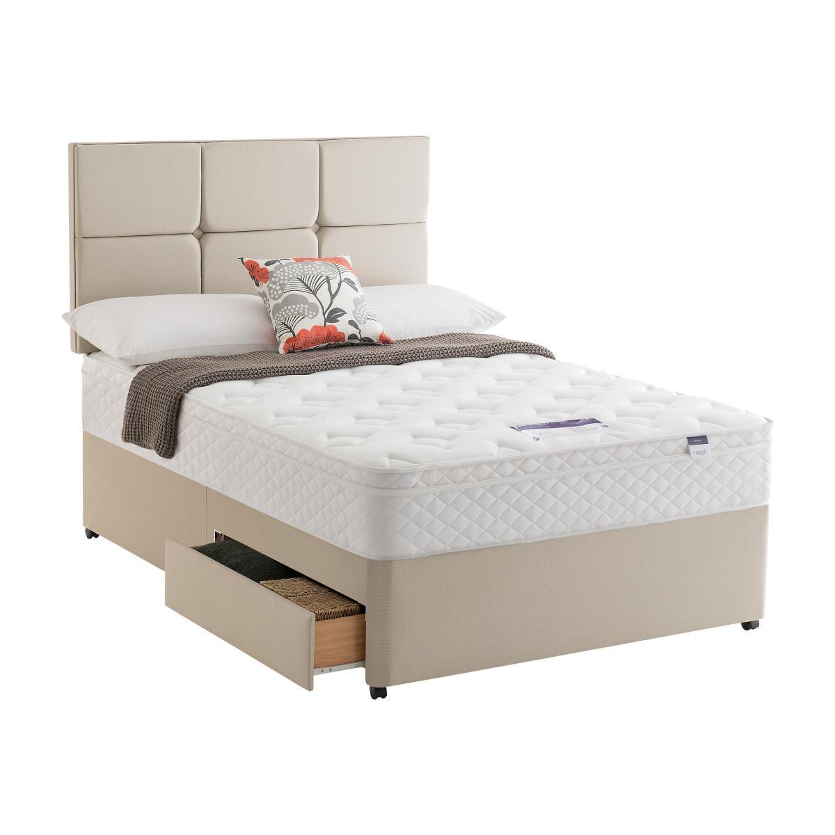 Silentnight Miracoil Serenity divan beds and mattresses have a unique zoned Miracoil spring system offering comfort and support for all shapes and sizes. Twice as many springs offer improved pressure relief with edge to edge support for maximum sleep space with no roll together, and zoned support where you need it most for perfect spine alignment. Miracoil springs have enhanced durability, providing superior comfort for longer. Headboard is an optional extra. Fantastic value spring and memory foam divan bed from Silentnight. Edge-to-edge support, more personal space, no ‘roll together’. Miracoilzoned spring system aligns your spine perfectly. Memory foam moulds to the shape of your body. Twice as many springs for improved pressure relief and comfort. Smooth anti-allergy damask for a relaxing sleep surface. Classic platform top base, with a choice of drawer options. Made in the UK. An Online Exclusive from Furniture Village. Did you know?. The mattress should be aired for four hours after delivery to freshen and remove any aroma from storage. It may take time for your mattress to attain its full size once the springs have settled to the correct position. This is due to the mattress being upright during transit. Settlement of fillings and indentations caused by body weight compressing the fillings are natural and not considered defects. This can be minimised by regular rotating (unless yours is a dual tension mattress). Product images are representative. Find out more.