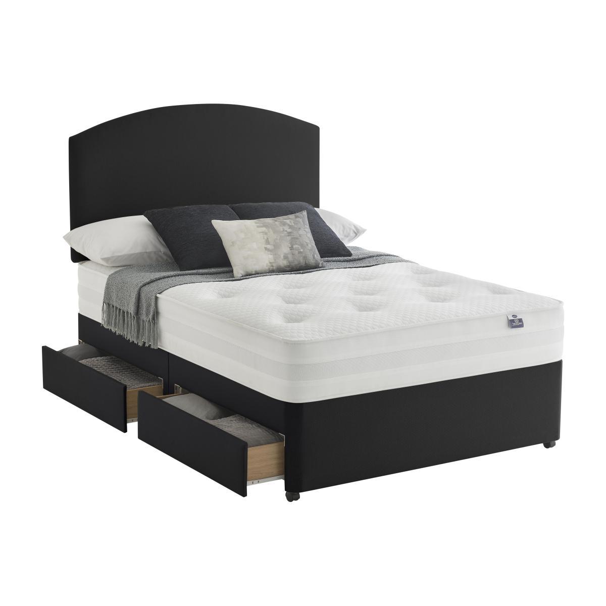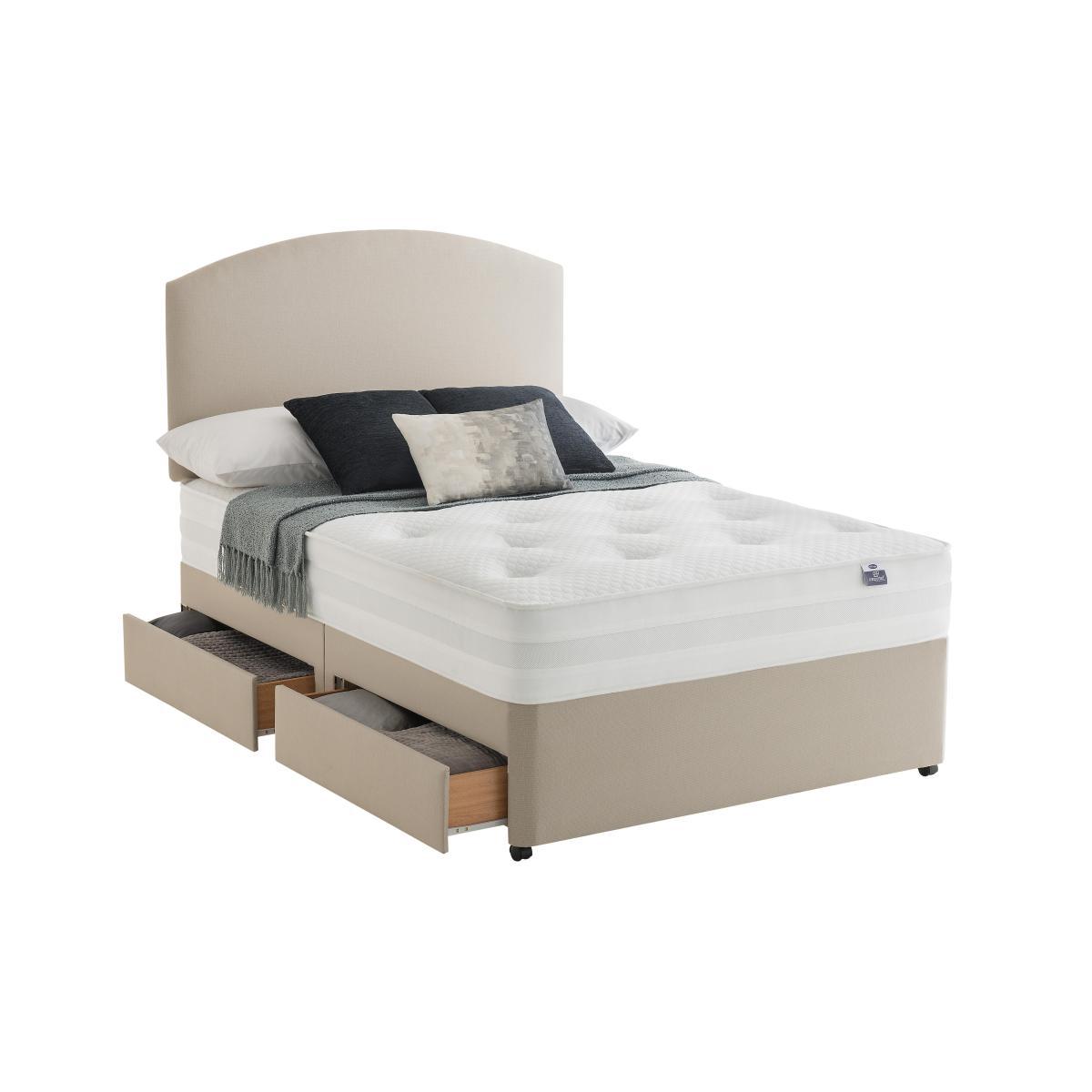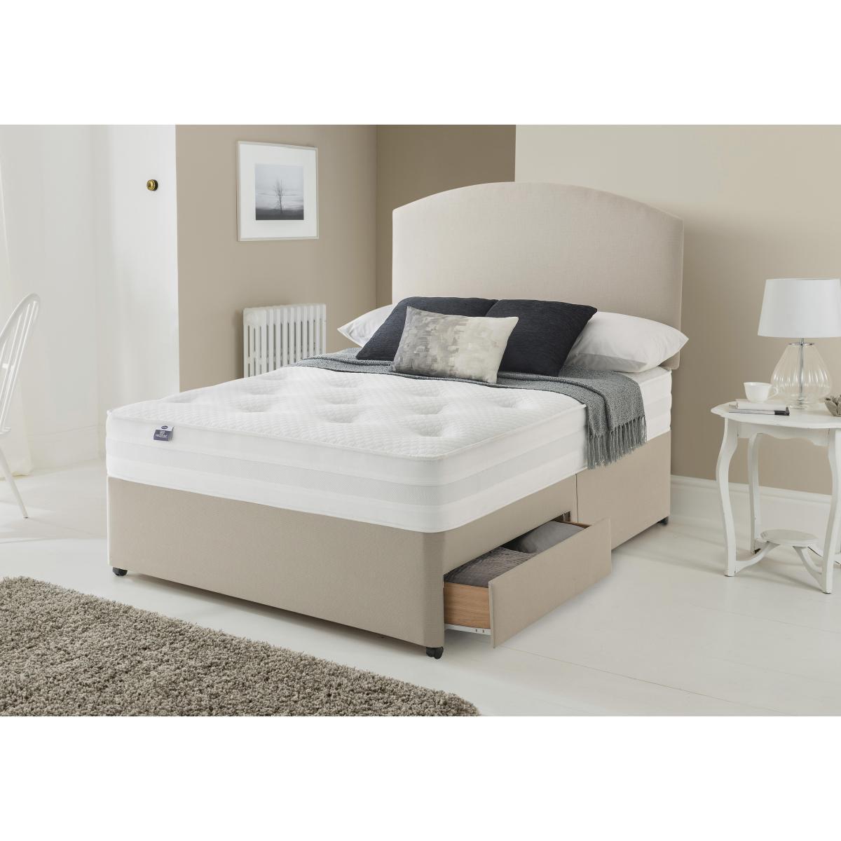 Silentnight Mirapocket Serenity divan beds and mattresses feature unique Mirapocket technology with individual springs held under tension in their own fabric pockets. Each spring responds to your body, spreading your weight evenly across the bed providing pressure relief and zoned support where you need it most and luxurious, tailored comfort. With edge to edge support, in a choice of spring counts to suit individual needs. Headboard is an optional extra. Fantastic value Mirapocket Serenity divan bed from Silentnight. Edge-to-edge support, more personal space, no ‘roll together’. Mirapocket technology with 1000 zoned pocket springs. Comfort layer has Eco Comfort Fibres™ from 100% recyclable plastic bottles. Responsive individual springs in 3 zones, in their own fabric pockets. No turn, hand-tufted mattress with breathable border. Smooth anti-allergy damask for a relaxing sleep surface. Classic platform top base, with a choice of drawer options. Made in the UK. An Online Exclusive from Furniture Village. Did you know?. The mattress should be aired for four hours after delivery to freshen and remove any aroma from storage. It may take time for your mattress to attain its full size once the springs have settled to the correct position. This is due to the mattress being upright during transit. Settlement of fillings and indentations caused by body weight compressing the fillings are natural and not considered defects. This can be minimised by regular rotating (unless yours is a dual tension mattress). Product images are representative. Find out more.
