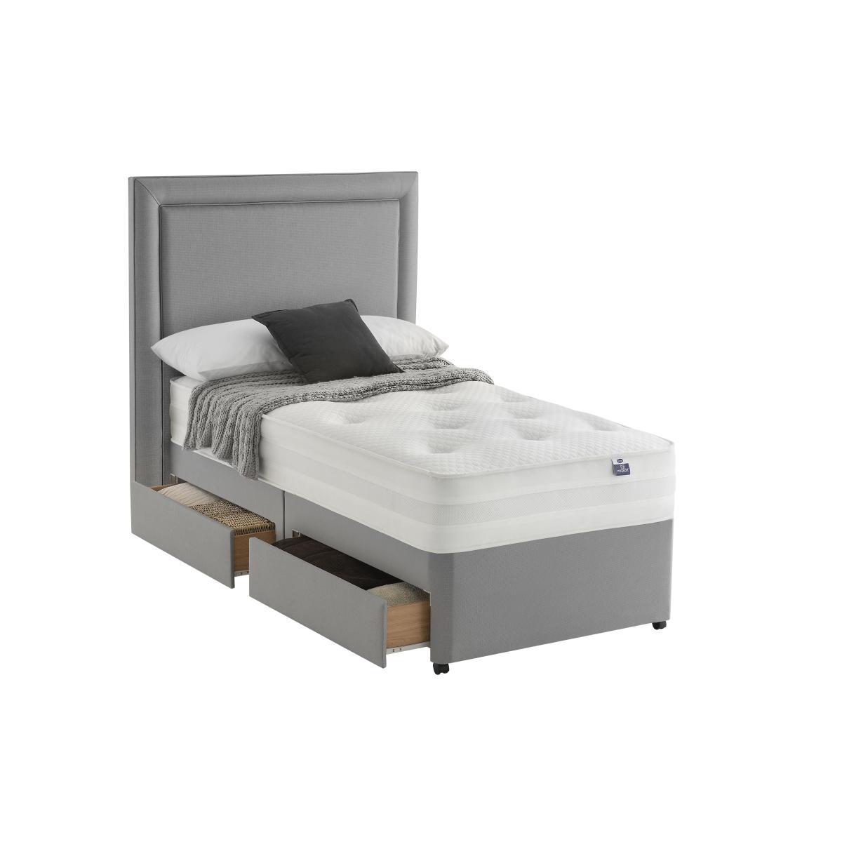 Silentnight Mirapocket Serenity divan beds and mattresses feature unique Mirapocket technology with individual springs held under tension in their own fabric pockets. Each spring responds to your body, spreading your weight evenly across the bed providing pressure relief and zoned support where you need it most and luxurious, tailored comfort. With edge to edge support, in a choice of spring counts to suit individual needs. Headboard is an optional extra. Fantastic value pocket spring and memory foam divan bed from Silentnight. Edge-to-edge support means more sleep space with no ‘roll together’. Mirapocket technology with 1000 zoned pocket springs. Individually responsive pocket springs allow perfect spinal alignment. A deep layer of memory foam moulds to the shape of your body. Smooth anti-allergy damask for a relaxing sleep surface. Classic platform top base, with a choice of drawer options. Made in the UK. Did you know?. The mattress should be aired for four hours after delivery to freshen and remove any aroma from storage. It may take time for your mattress to attain its full size once the springs have settled to the correct position. This is due to the mattress being upright during transit. Settlement of fillings and indentations caused by body weight compressing the fillings are natural and not considered defects. This can be minimised by regular rotating (unless yours is a dual tension mattress). Product images are representative. Find out more.