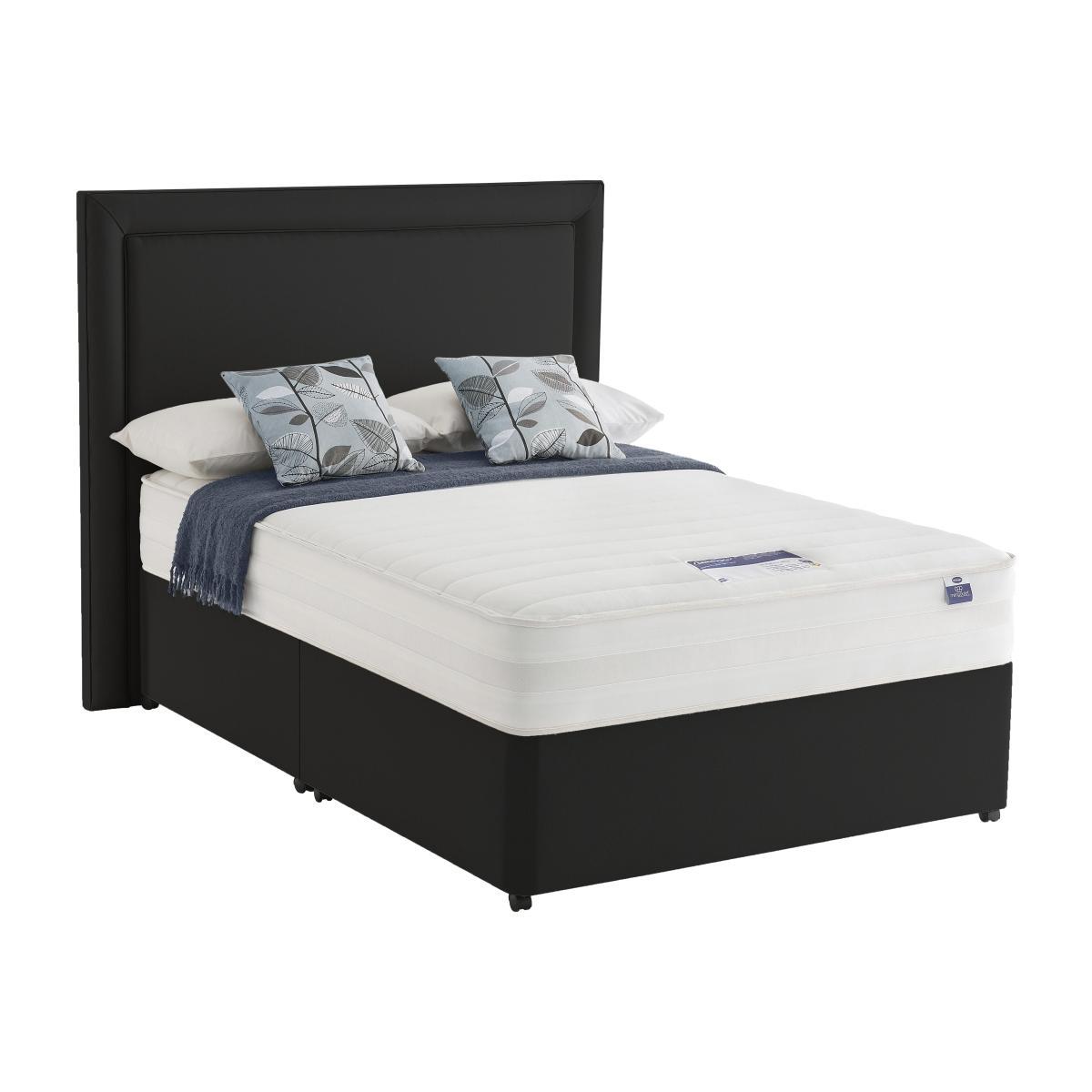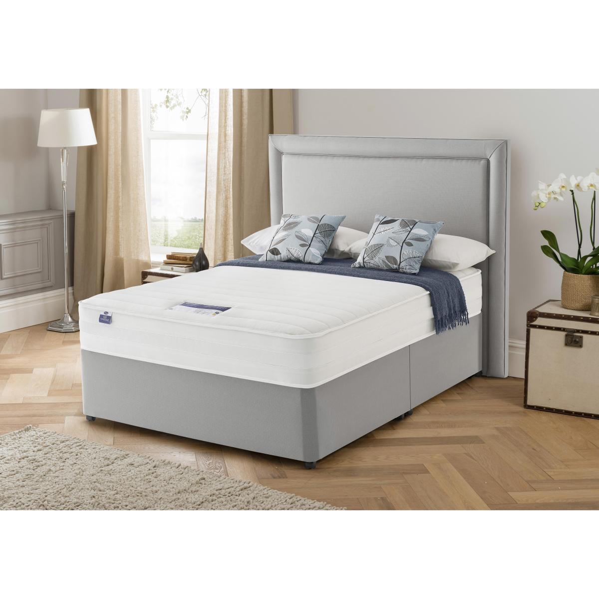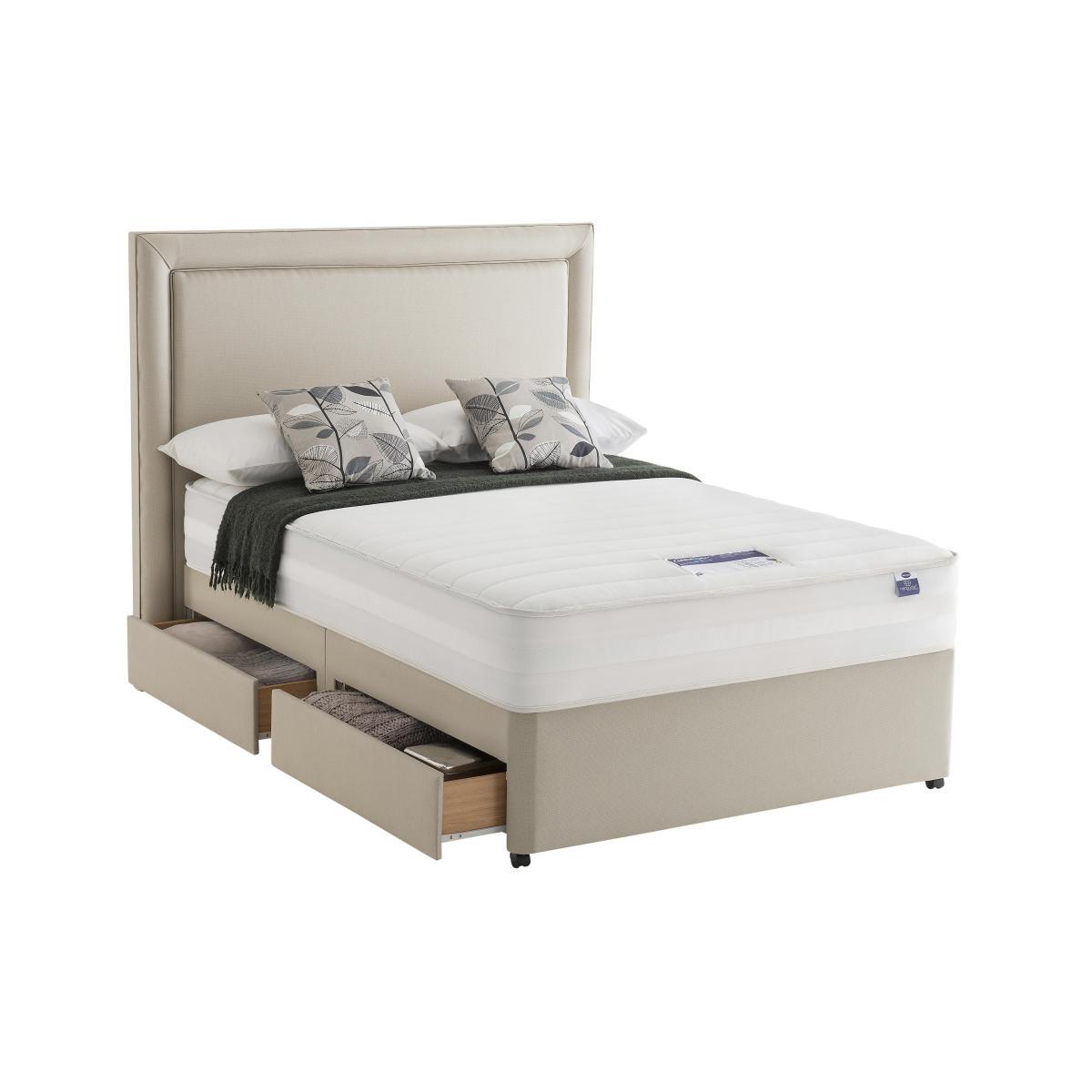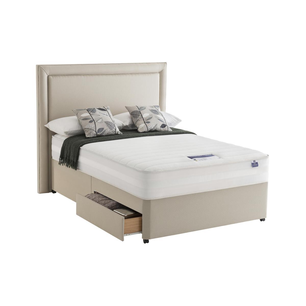 Silentnight Mirapocket Serenity divan beds and mattresses feature unique Mirapocket technology with individual springs held under tension in their own fabric pockets. Each spring responds to your body, spreading your weight evenly across the bed providing pressure relief and zoned support where you need it most and luxurious, tailored comfort. With edge to edge support, in a choice of spring counts to suit individual needs. Headboard is an optional extra. Fantastic value pocket spring and memory foam divan bed from Silentnight. Edge-to-edge support means more sleep space with no ‘roll together’. Mirapocket technology with 1200 zoned pocket springs. Individually responsive pocket springs allow perfect spinal alignment. A deep layer of memory foam moulds to the shape of your body. Smooth anti-allergy damask for a relaxing sleep surface. Classic platform top base, with a choice of drawer options. Made in the UK. An Online Exclusive from Furniture Village. Did you know?. The mattress should be aired for four hours after delivery to freshen and remove any aroma from storage. It may take time for your mattress to attain its full size once the springs have settled to the correct position. This is due to the mattress being upright during transit. Settlement of fillings and indentations caused by body weight compressing the fillings are natural and not considered defects. This can be minimised by regular rotating (unless yours is a dual tension mattress). Product images are representative. Find out more.