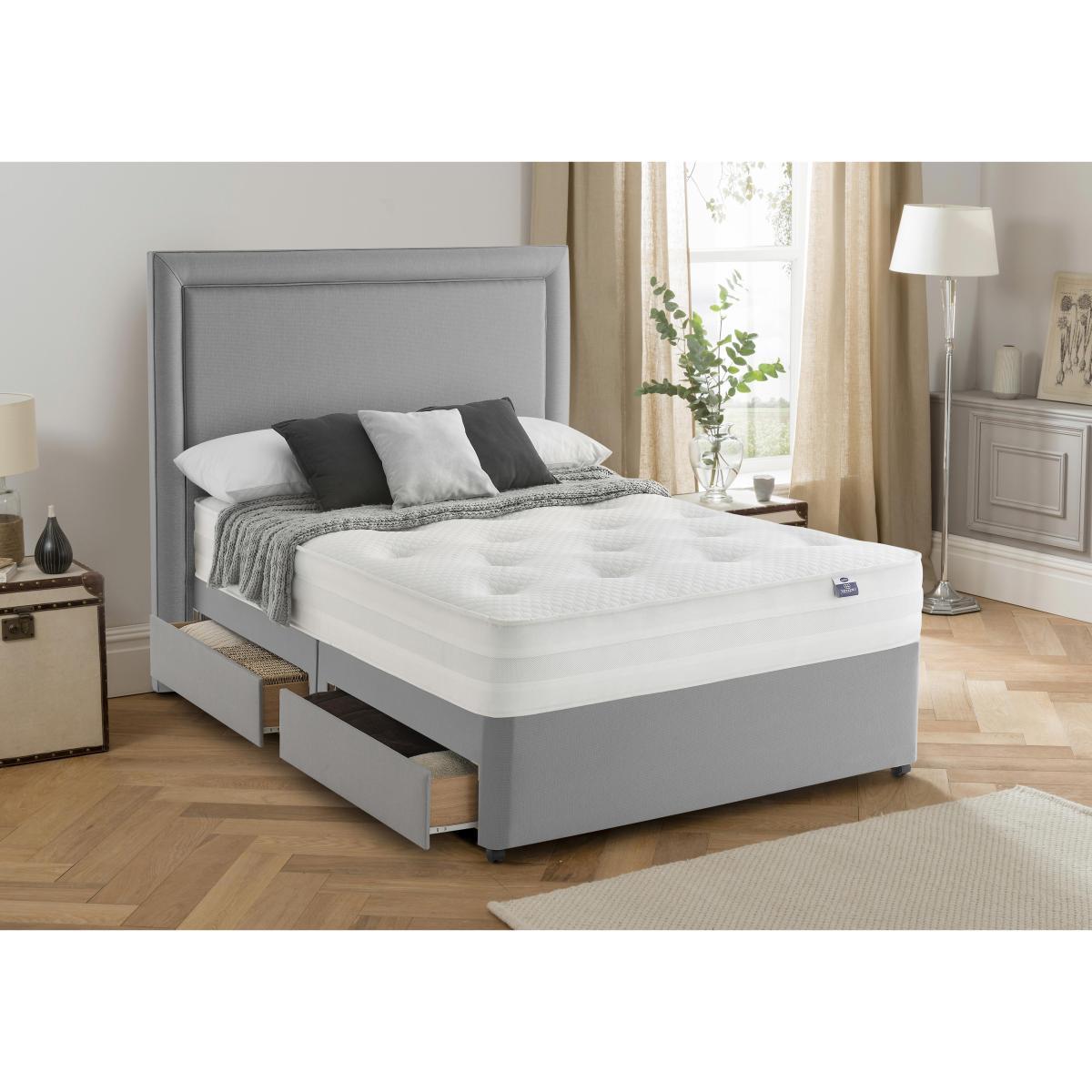 Silentnight Mirapocket Serenity divan beds and mattresses feature unique Mirapocket technology with individual springs held under tension in their own fabric pockets. Each spring responds to your body, spreading your weight evenly across the bed providing pressure relief and zoned support where you need it most and luxurious, tailored comfort. With edge to edge support, in a choice of spring counts to suit individual needs. Headboard is an optional extra. Fantastic value Silentnight Mirapocket Serenity Ortho divan bed. Edge-to-edge support means more sleep space with no ‘roll together’. Mirapocket technology with 1400 zoned pocket springs. Comfort layer has Eco Comfort Fibres™ from 100% recyclable plastic bottles. Responsive individual springs in 3 zones, in their own fabric pockets. No turn, hand-tufted mattress with breathable border. Smooth anti-allergy damask for a relaxing sleep surface. Half ottoman platform top base, with a choice of drawer options. Made in the UK. An Online Exclusive from Furniture Village. Did you know?. The mattress should be aired for four hours after delivery to freshen and remove any aroma from storage. It may take time for your mattress to attain its full size once the springs have settled to the correct position. This is due to the mattress being upright during transit. Settlement of fillings and indentations caused by body weight compressing the fillings are natural and not considered defects. This can be minimised by regular rotating (unless yours is a dual tension mattress). Product images are representative. Find out more.