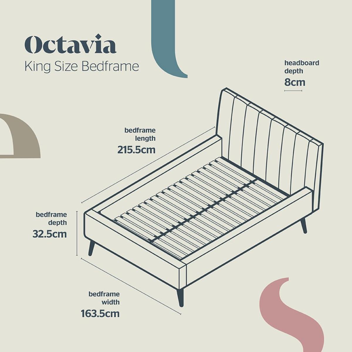 The classic shape of the Octavia bedframe with its decorative vertical stitching creates 8 perfect contours that let the Octavia define your bedroom style. Handcrafted here in the UK, the bed is upholstered in a natural, soft textured woven fabric. Its unique in design with a tall, padded headboard that ensures optimum comfort when relaxing in bed on those slow lazy mornings. Resting on wooden legs, the Octavia bedframe will fit in seamlessly with any interior style. Adjustable side rails can be rotated to accommodate a deep or shallow mattresses. Whilst the wooden slatted base provides excellent mattress support and airflow. Our made to order furniture service means you can choose from different options, such as fabric, size and shape to create a beautiful bespoke piece of furniture. Because this piece is designed just for you, you might notice the delivery time is a little longer than usual. Make a statement with our Peacock smooth velvet fabric, known for it's sensual feel and low sheen which makes it a timeless favourite in home interior design. Natural and organic more your style, then go for our textured woven Steel colour, perfectly suiting any bedroom. Part of the Octavia collection. Upholstered frame. Flat weave fabric - 51% acrylic and 20% cotton. Wooden feet. Base with wooden slats. No storage. Size W163.5, L215.5, H32.5cm. Total maximum user weight 220kg. Self-assembly - 2 people recommended. Package Dimensions: Package 1 dimensions: H95, W164, D17cm. Package 1 weight: 19kg. Package 2 dimensions: H25, W24, D223cm. Package 2 weight: 30.5kg. Package 3 dimensions: H29, W152, D8.5cm. Package 3 weight: 15.5kg. General Information: By choosing FSC certified products, you are supporting responsible management of the world's forests. Manufacturer's 5 year parts and labour guarantee.