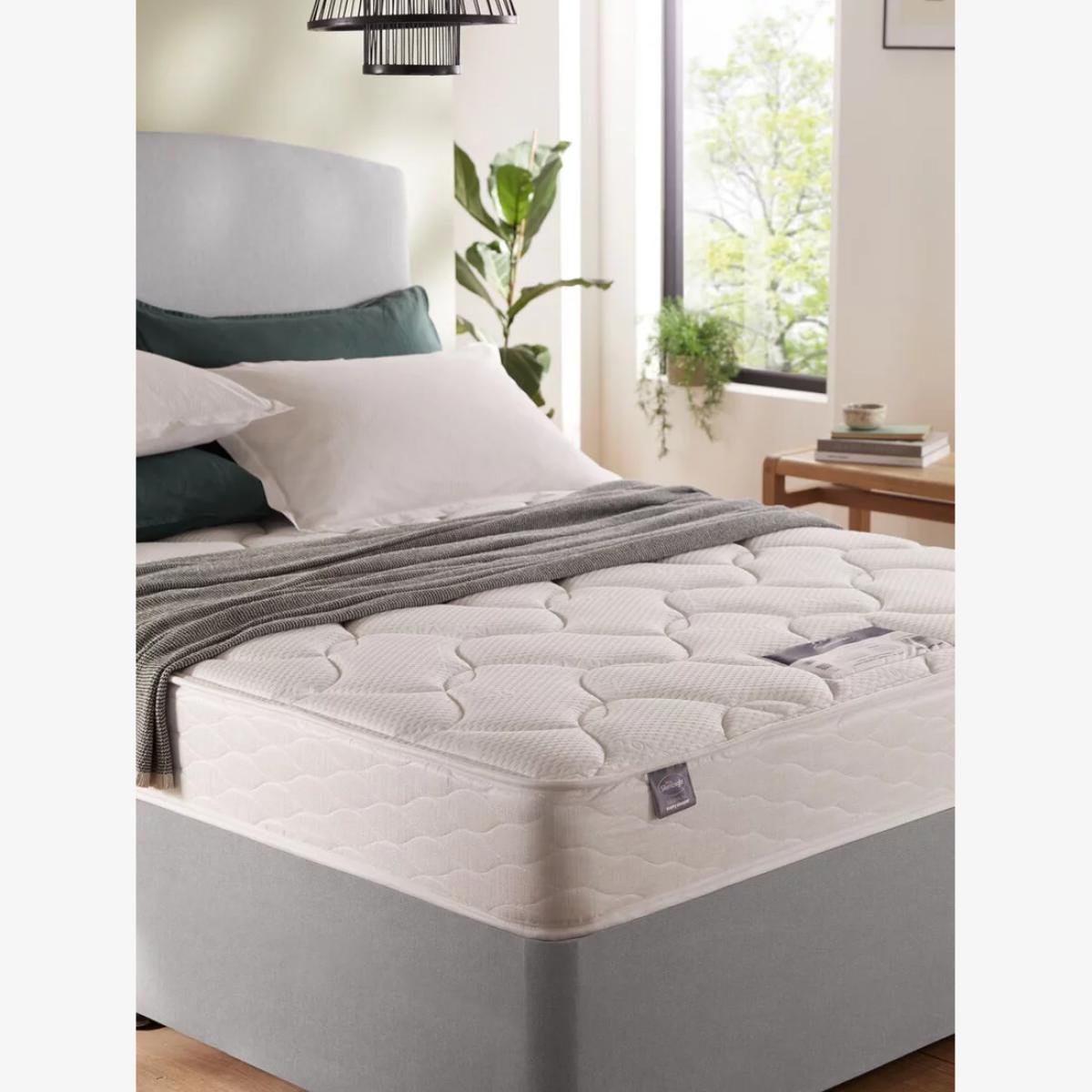 Silentnight's Collection quilted, slate grey divan base comes with a regular tension Recover mattress. A headboard is not included. About the mattress: Open coil spring system and Eco Comfort The open coil spring system offers ample support and the familiar feeling of a traditional mattress. This Mattress features an Eco Comfort Fibre layer, made with sustainable fibres which are extra breathable and perfect if you get hot during the night. Eco Comfort fibres are made with recycled plastic waste including bottles. SEAQUAL™ technology Recover mattresses contain SEAQUAL™ technology which uses Upcycled Marine Plastic to make mattresses. SEAQUAL™ works with NGOs, fishermen, authorities and local communities to help clean our oceans. Marine litter from our beaches, oceans, rivers and estuaries is collected by clean-up programs. It is then sorted into different material types and the plastic portion is cleaned and transformed into Upcycled Marine Plastic, which can then be used to produce high-quality mattress textiles and covers. Try before you buy This is an important purchase and it’s worthwhile to try your choice of mattress in-store to make sure it's right for you. Our store Partners will be able to tell you more about its benefits, and recommend options based on your needs. Extend the life of your new mattress with a durable and breathable mattress protector.